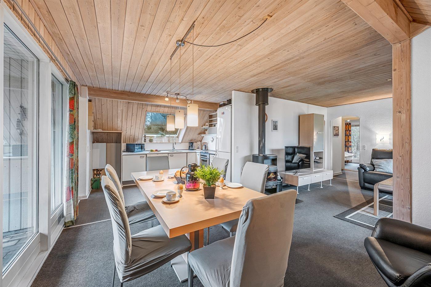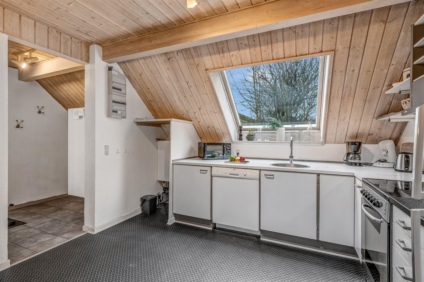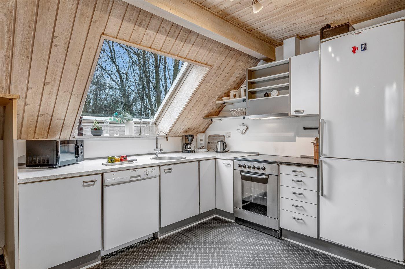 Køkkenet er udstyret med 1 køleskab. Der er 4 keramiske kogeplader, varmluftovn, mikrobølgeovn samt opvaskemaskine.
