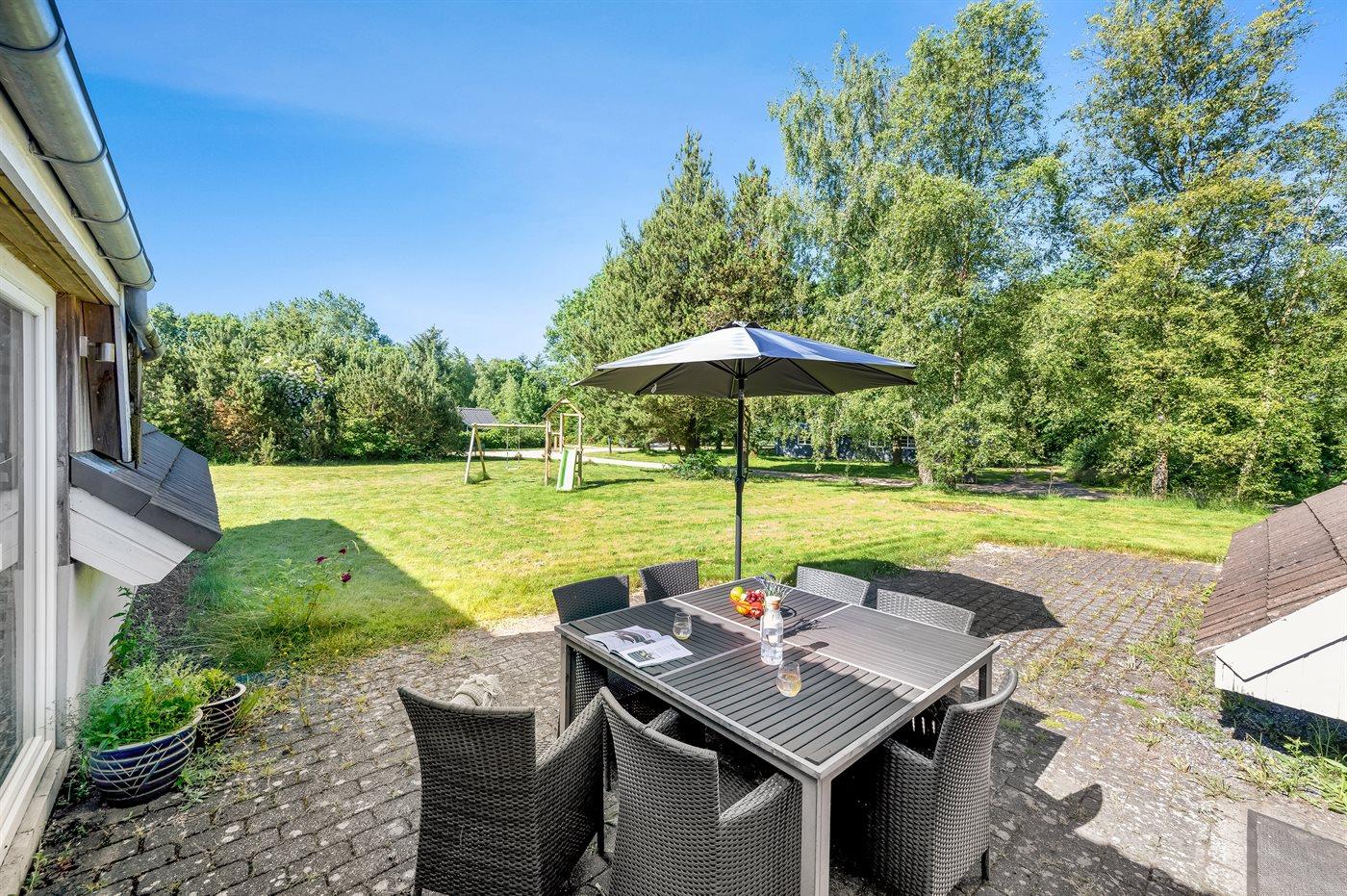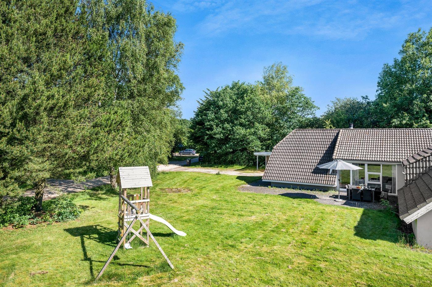 Ferieboligen er beliggende på en 1600 m² stor naturgrund. Til ferieboligen hører åbent terrasseareal. Desuden er der overdækket terrasse. Gynge. Legetårn. Vippe. Grill til rådighed. Der er carport til rådighed. Parkering ved ferieboligen.