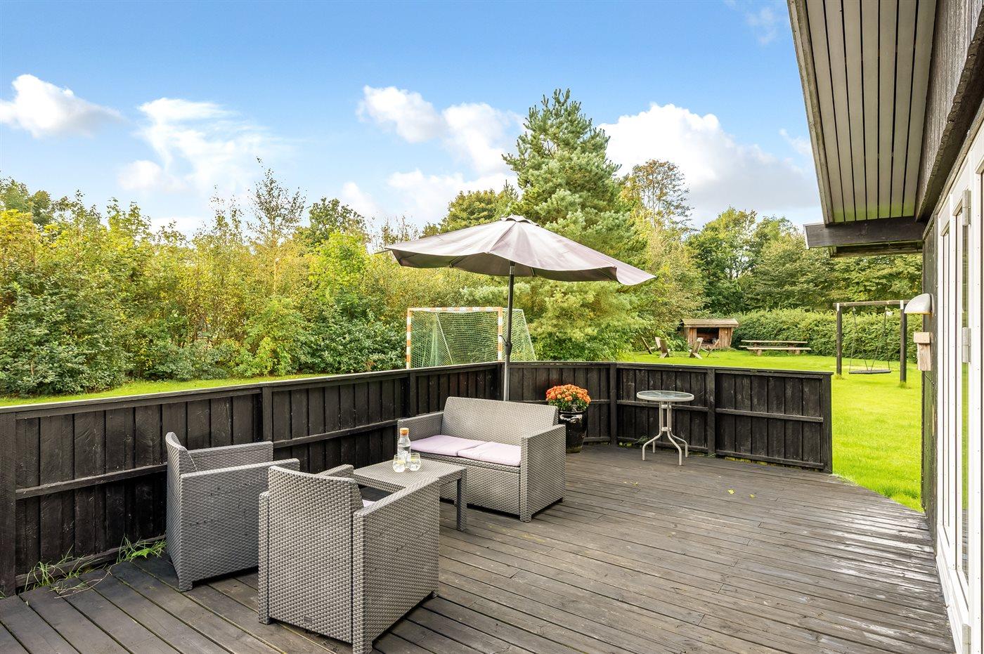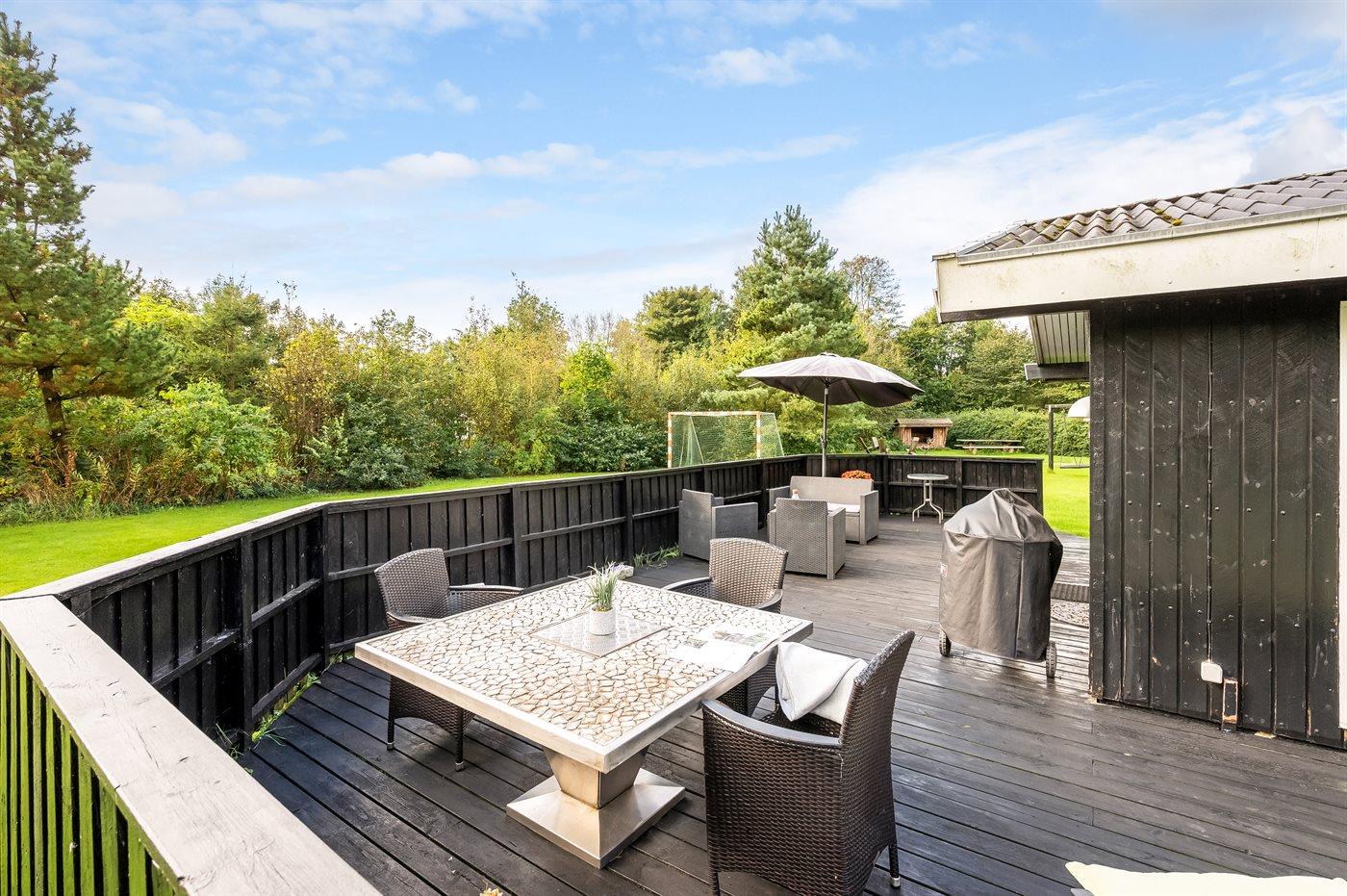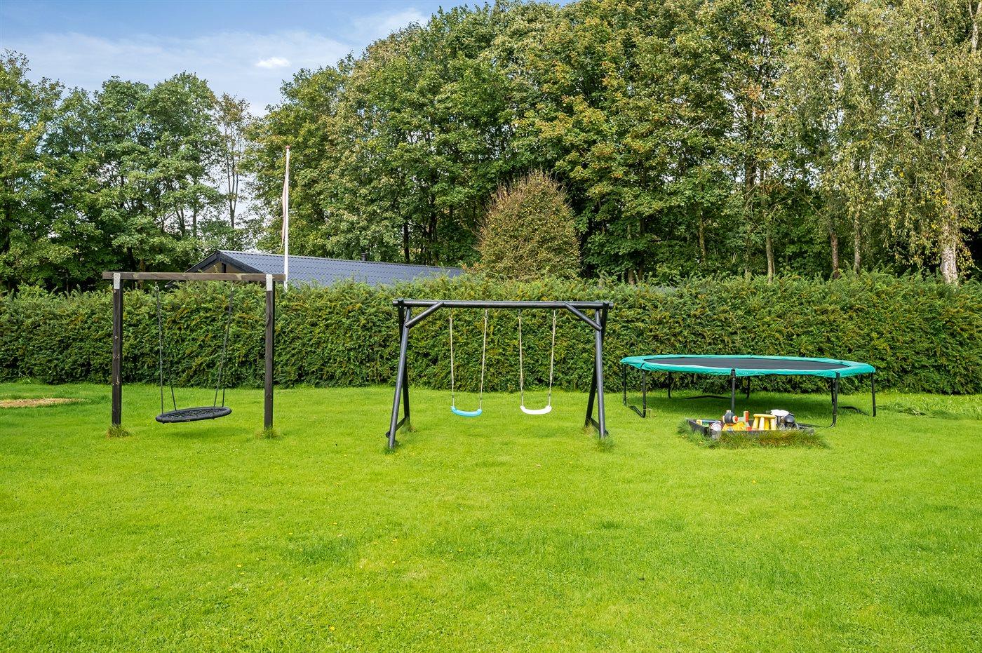Her oser det af feriestemning både inde og ude med terrasser rundt om huset, shelter, trampolin, sansegynge osv.