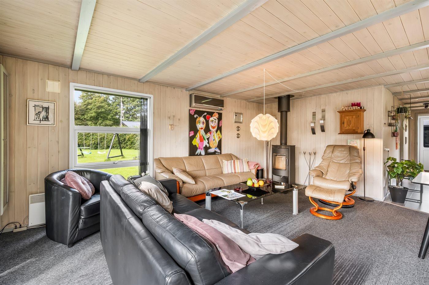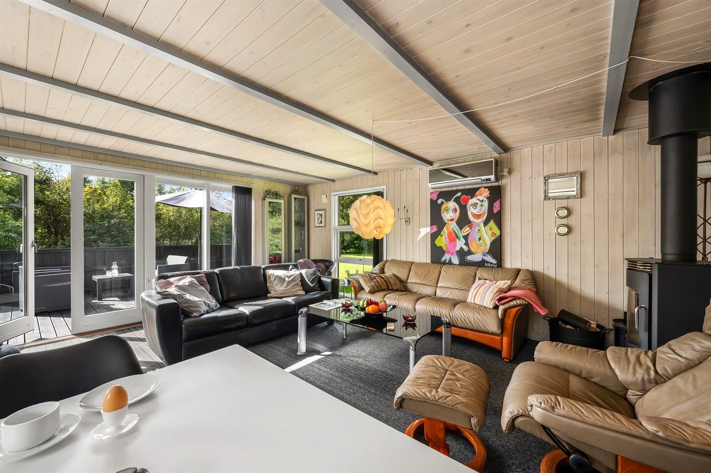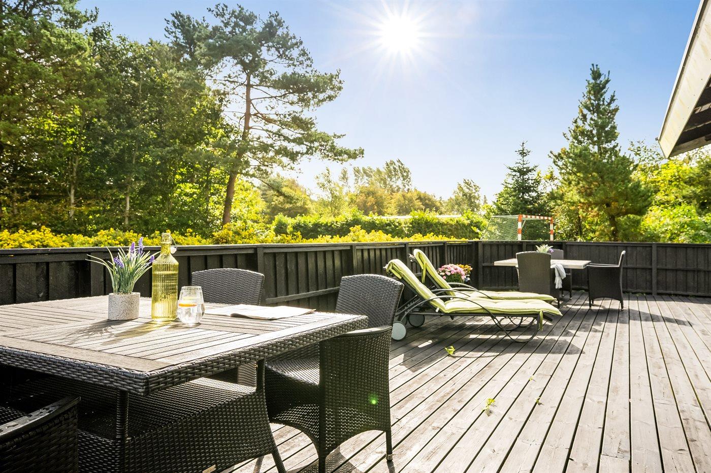 Her oser det af feriestemning både inde og ude med terrasser rundt om huset, shelter, trampolin, sansegynge osv.