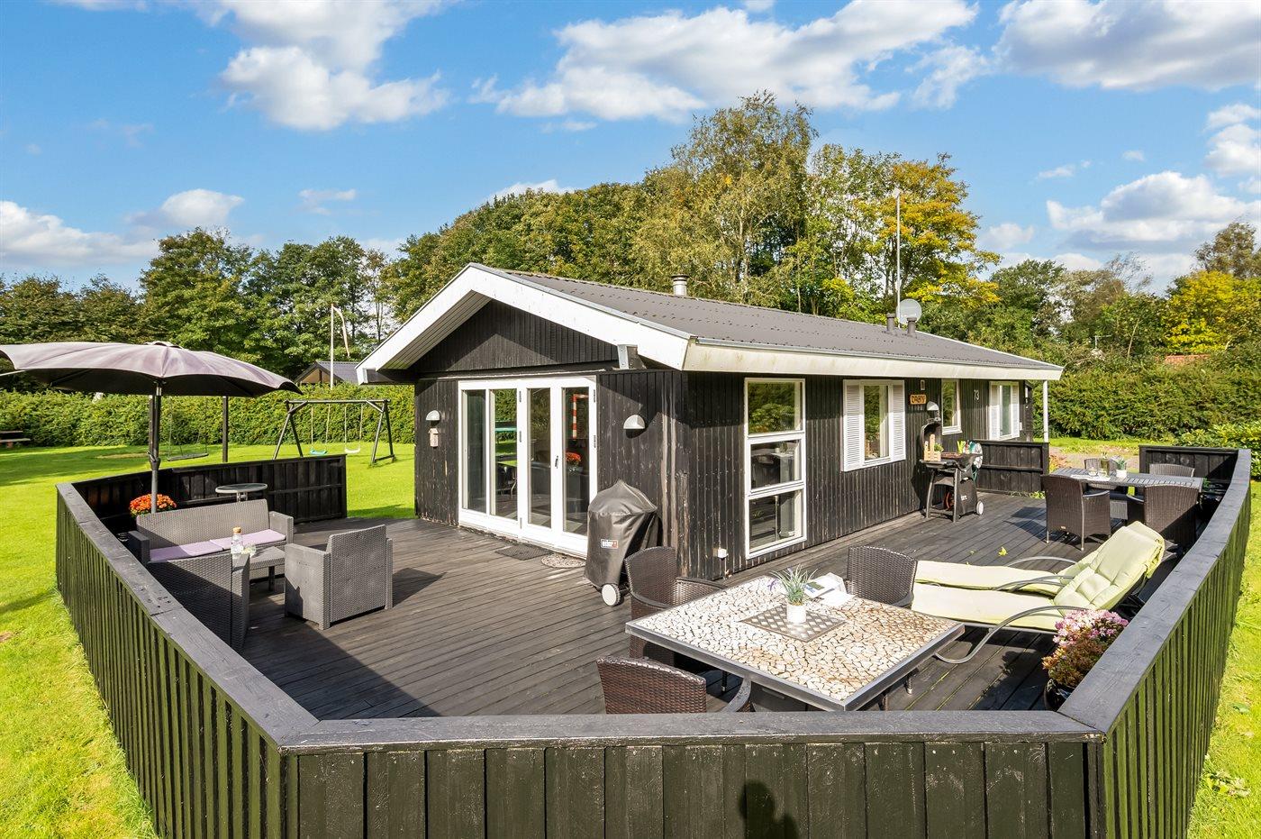 Hyggeligt sommerhus i rolige omgivelser med terrasser, trampolin, shelter og internet.