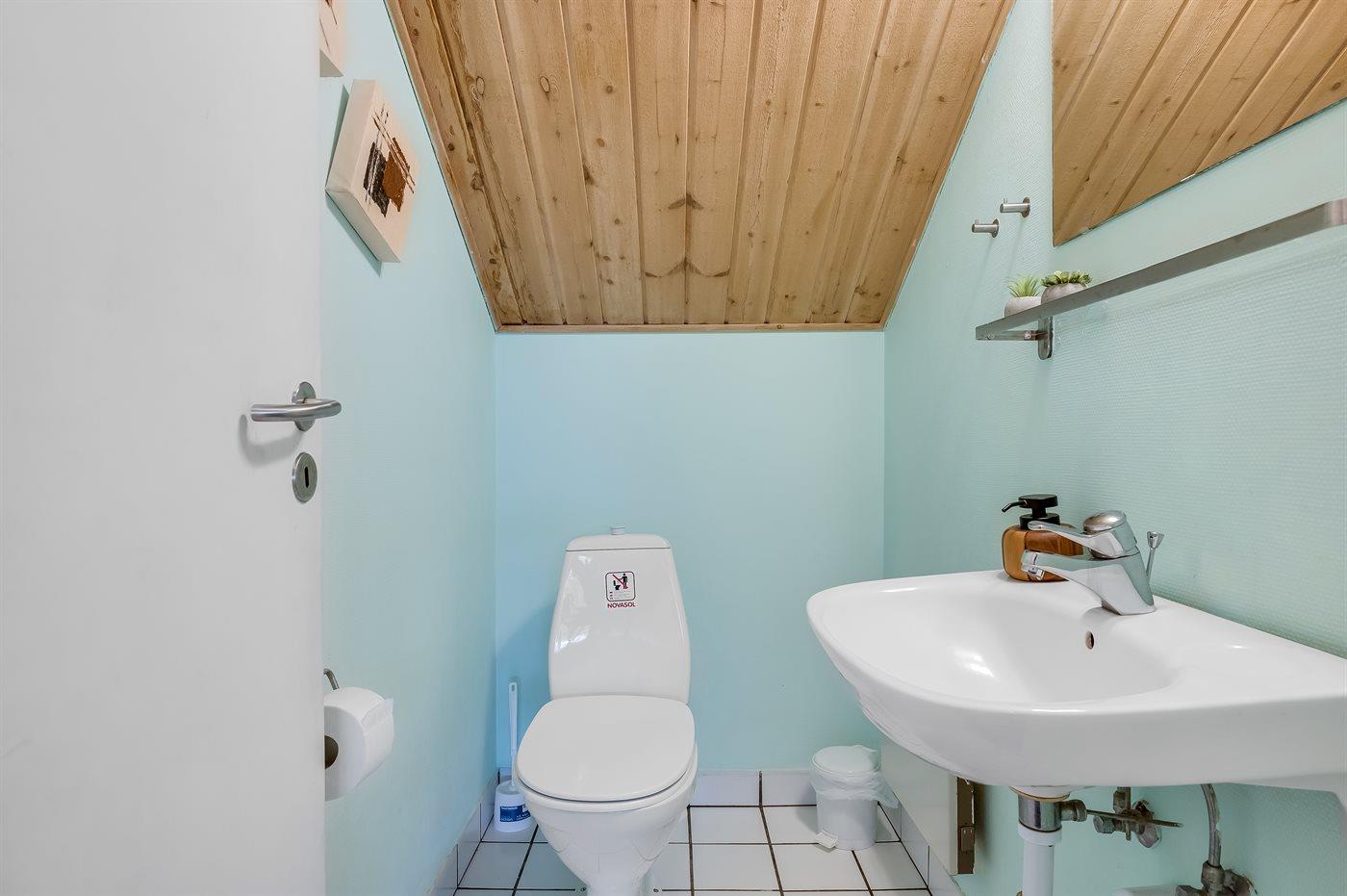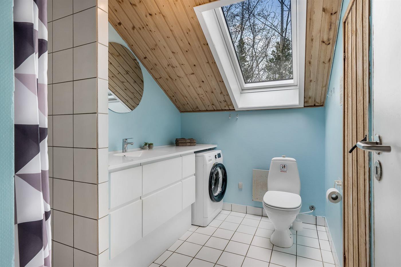 Der er 1 badeværelse med bruseniche og 2 toiletter, heraf 1 gæstetoilet. Der er gulvvarme på 1 badeværelse. Der er gulvvarme på gæstetoilettet. I saunaen er der mulighed for afslapning.