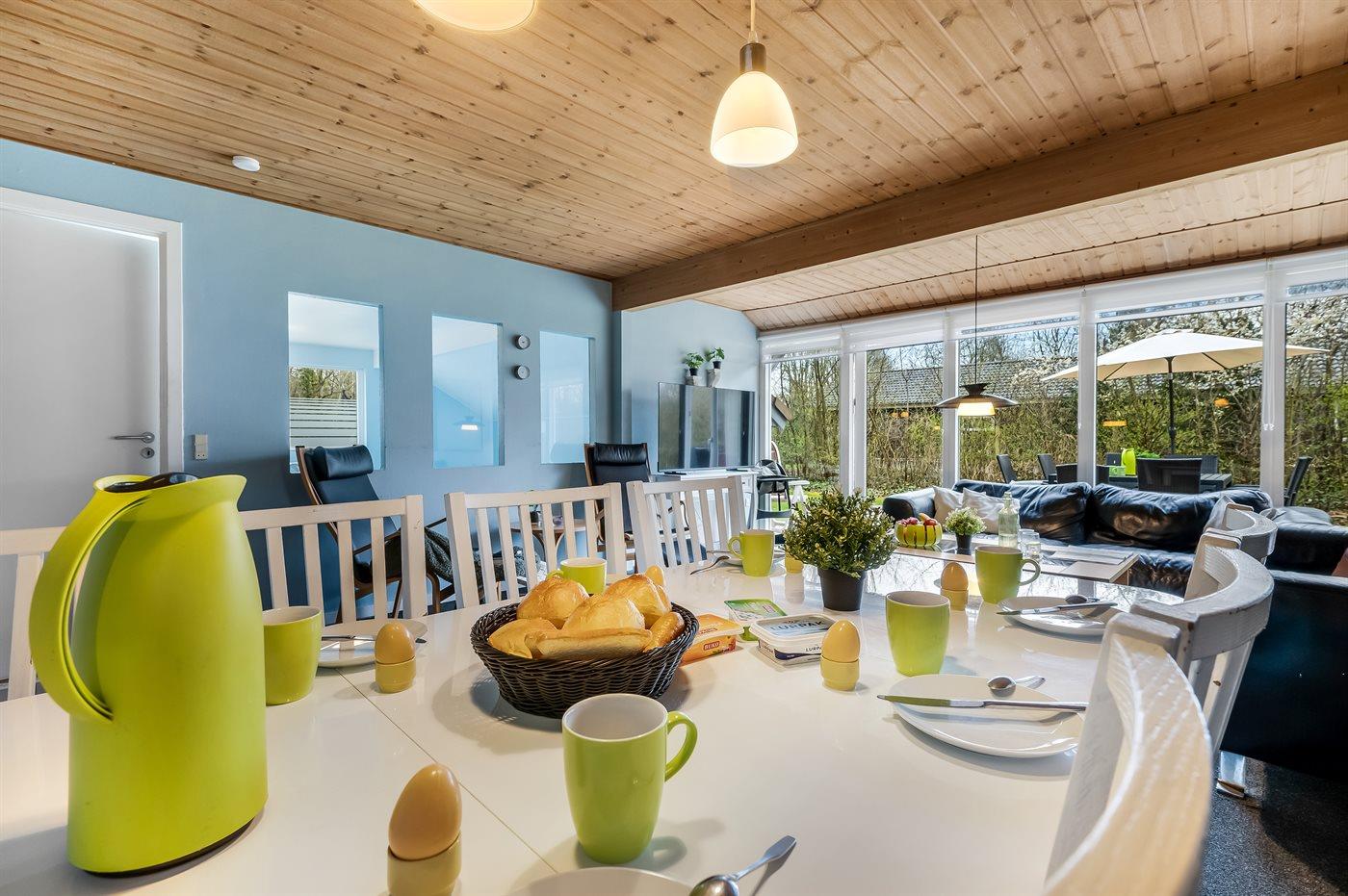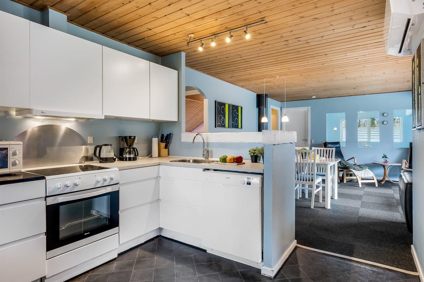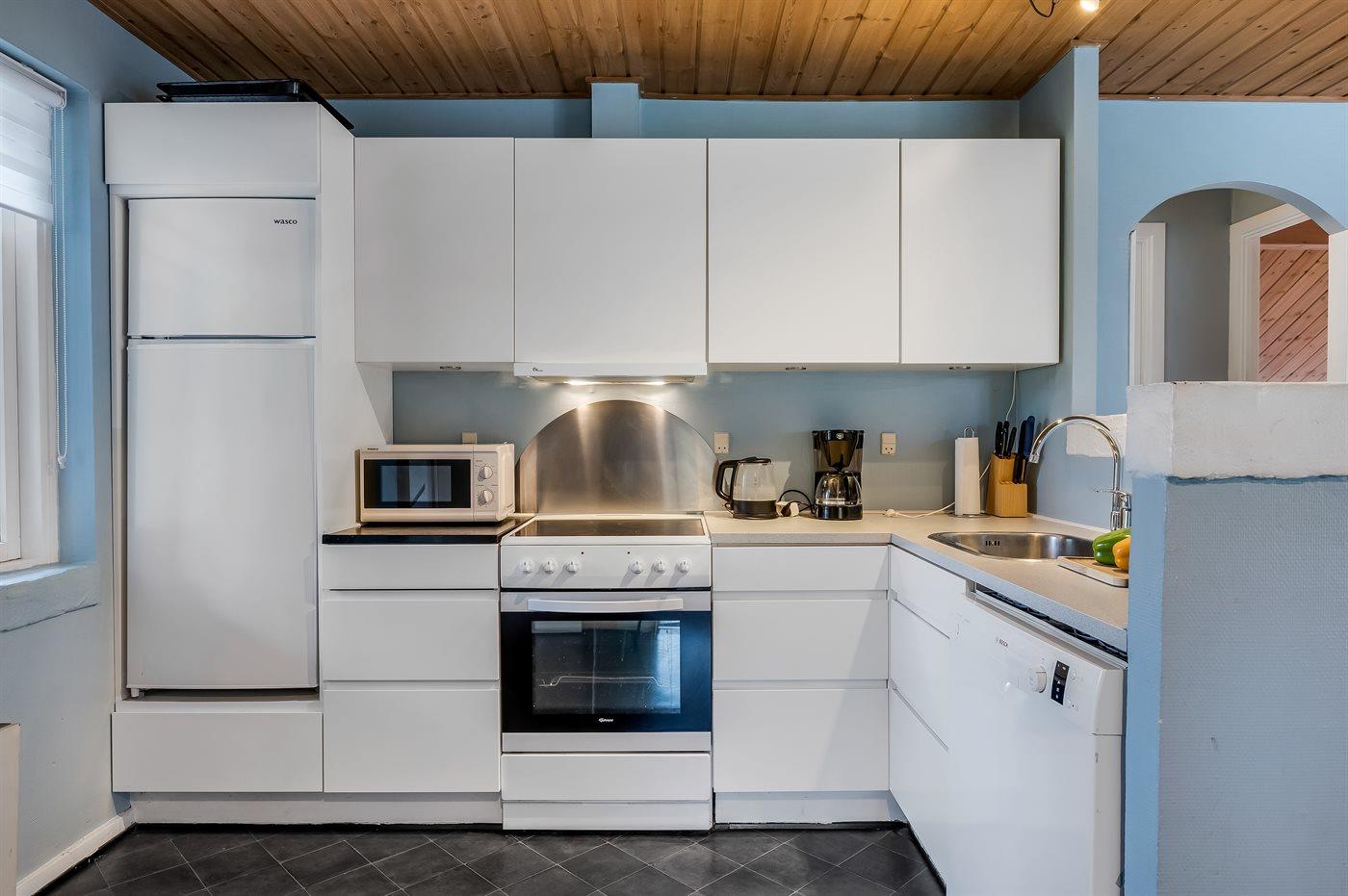 Køkkenet er udstyret med 1 køleskab. Der er 4 keramiske kogeplader, varmluftovn, mikrobølgeovn samt opvaskemaskine.
