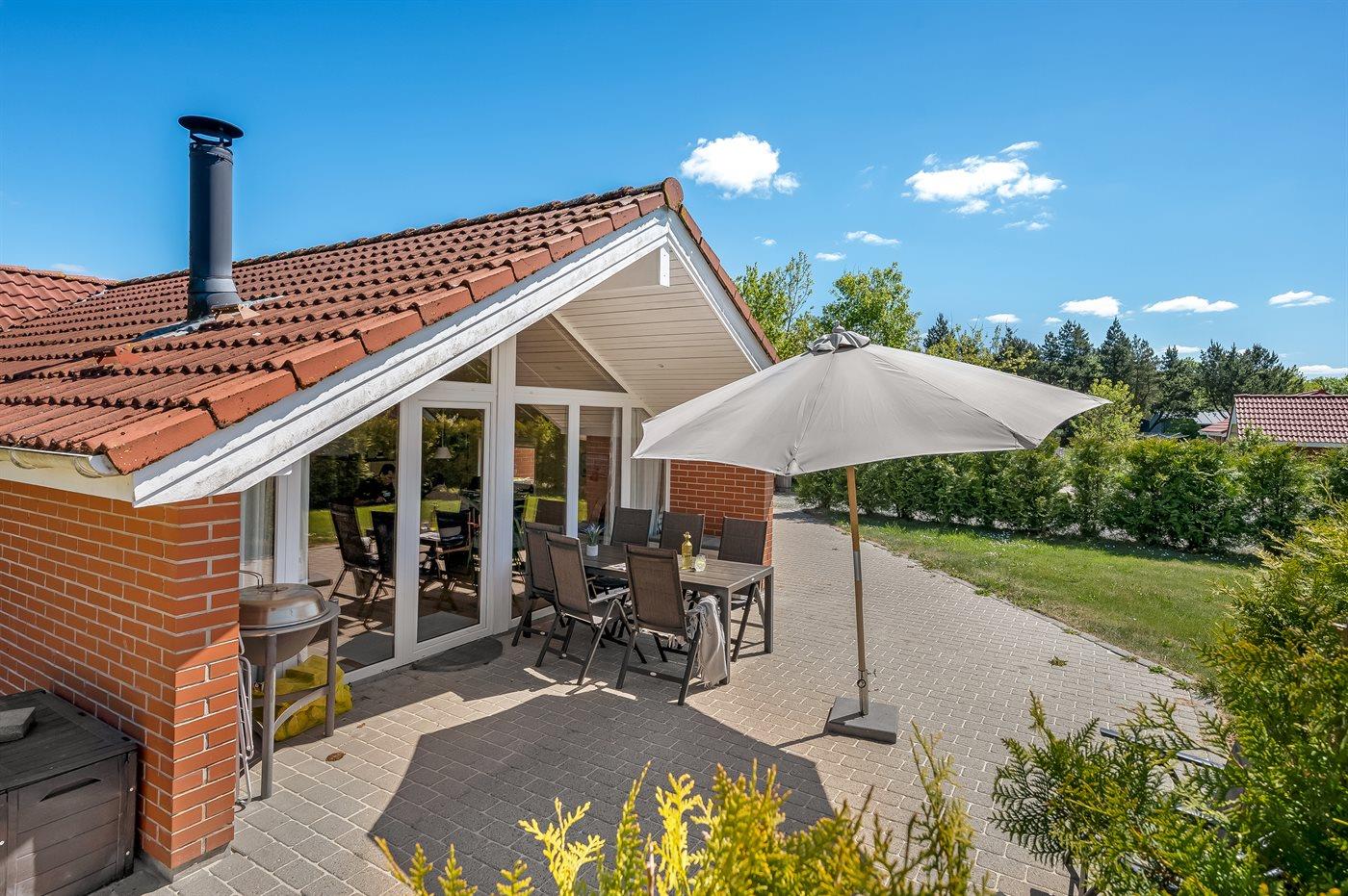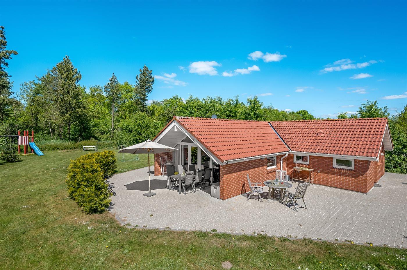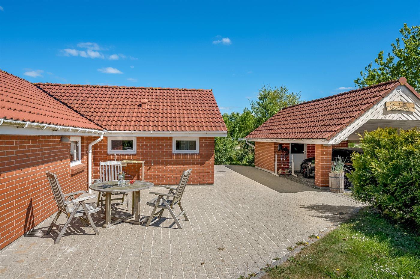 Ferieboligen er beliggende på en 1600 m² stor havegrund. Der er 10000 m til havet. Nærmeste forretning er beliggende i en afstand af 3500 m. Til ferieboligen hører 100 m² terrasseareal. Desuden er der 8 m² overdækket terrasse. Der er redskabsrum. Gynge. Sandkasse. Legetårn. Fodboldmål. Der er carport til rådighed. Der er installeret stik til opladning af elbil. Type 2 stik. Med 11 kW ladeeffekt. Parkering ved ferieboligen.