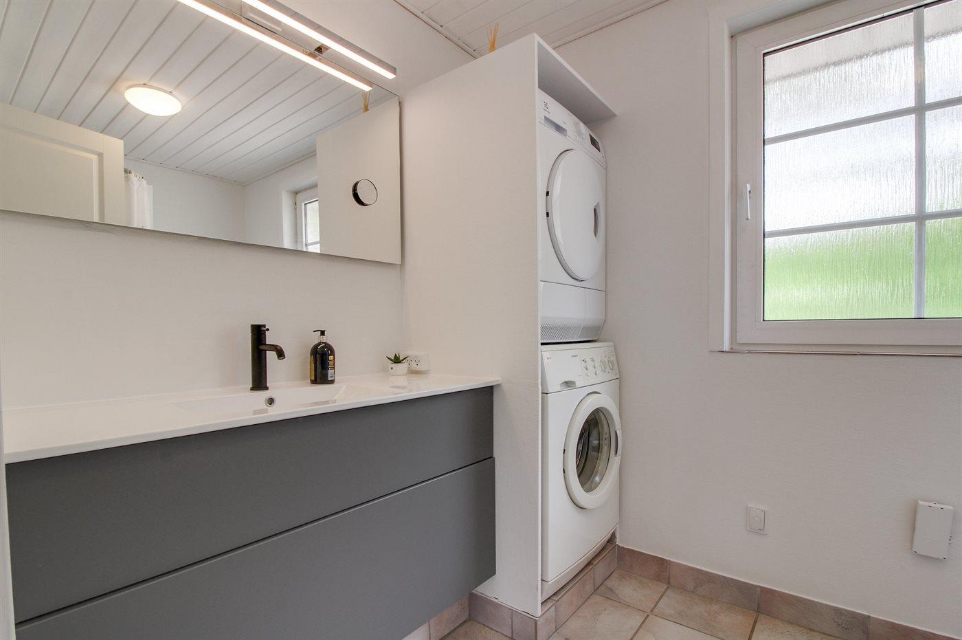 Der er 2 badeværelser med bruseniche og 2 toiletter. Der er gulvvarme på 1 badeværelse. I saunaen er der mulighed for afslapning.