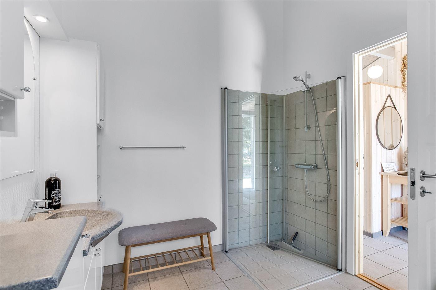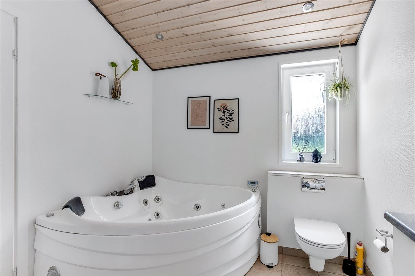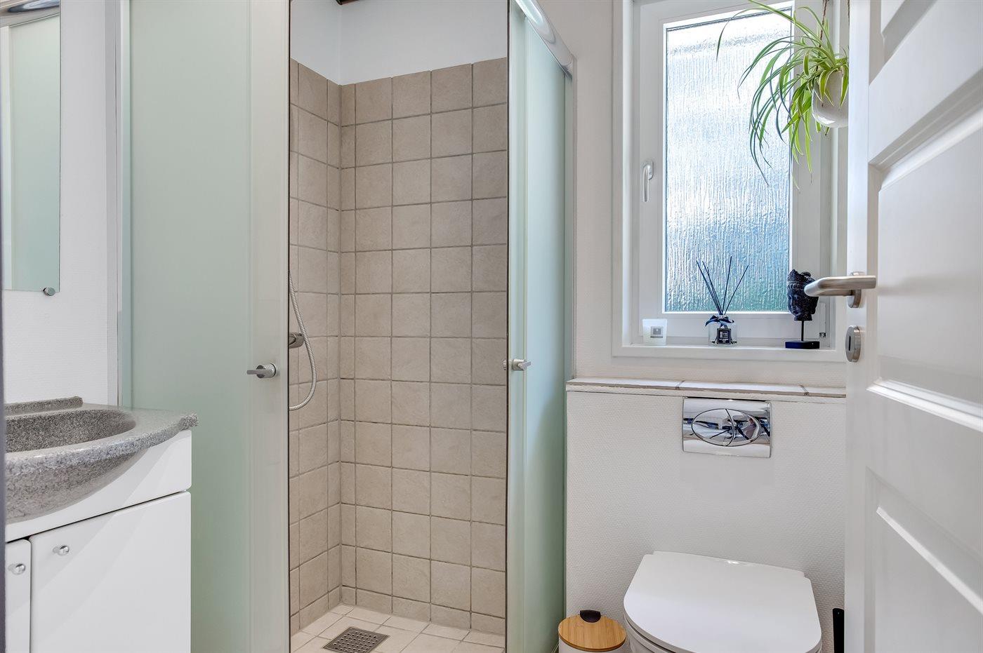 Der er 2 badeværelser med bruseniche og 3 toiletter, heraf 1 gæstetoilet. Der er gulvvarme på 2 badeværelser.