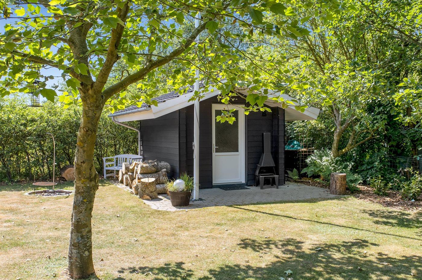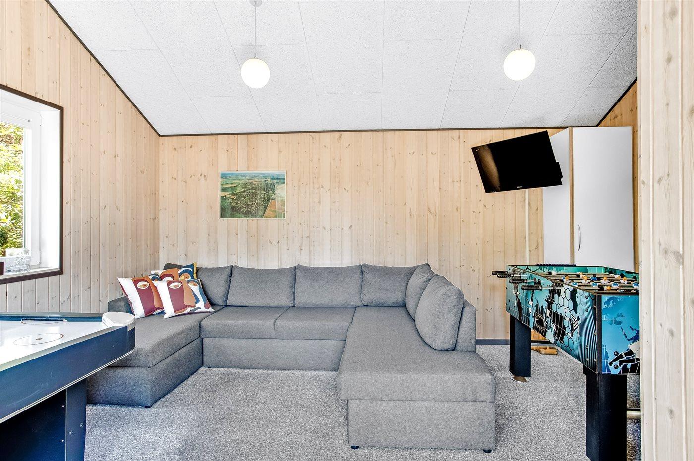 Rummeligt sommerhus beliggende på en ugenert naturgrund med græsplæne. Der er gulvvarme i hele huset, og gulvene er dels belagt med klinker, dels med træ. I en tilbygning til huset ligger et aktivitetsrum med egen indgang og tilhørende gæstetoilet. Her kan man spille airhockey, bordfodbold og dart.