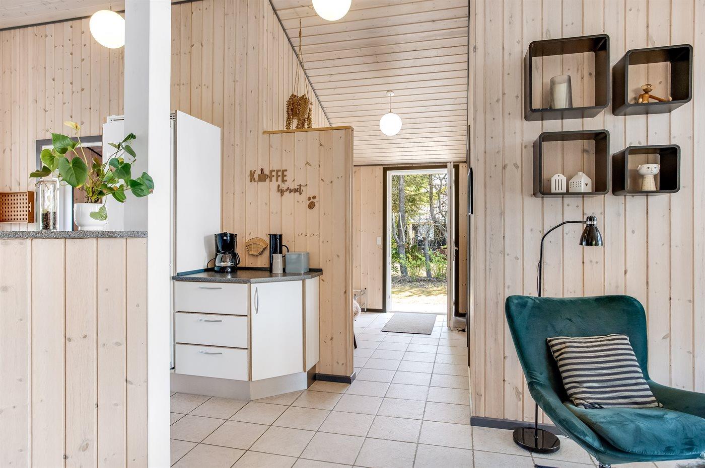 Køkkenet er udstyret med 1 køleskab. Der er 4 keramiske kogeplader, varmluftovn, mikrobølgeovn samt opvaskemaskine.