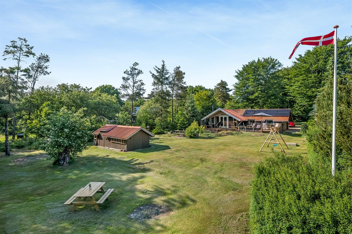 Ferieboligen er beliggende på en 1535 m² stor naturgrund. Der er 12000 m til havet. Nærmeste forretning er beliggende i en afstand af 600 m. Til ferieboligen hører 45 m² terrasseareal. Desuden er der 12 m² overdækket terrasse. Gynge. Sandkasse. Der er installeret stik til opladning af elbil. Med 11 kW ladeeffekt. Parkering ved ferieboligen.