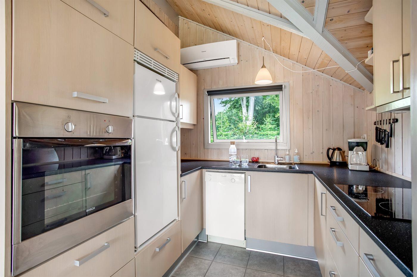 Køkkenet er udstyret med 1 køleskab. Der er 4 keramiske kogeplader, miniovn, varmluftovn, mikrobølgeovn samt opvaskemaskine.