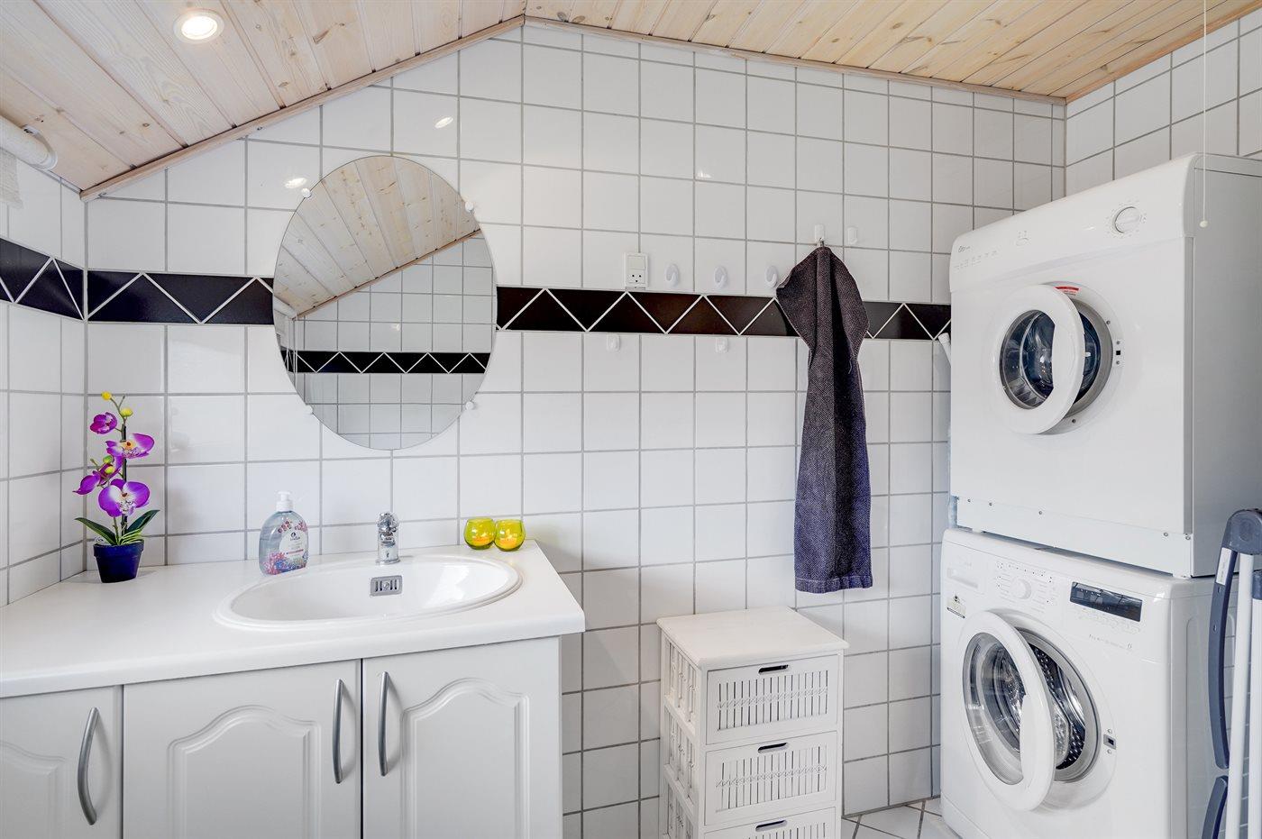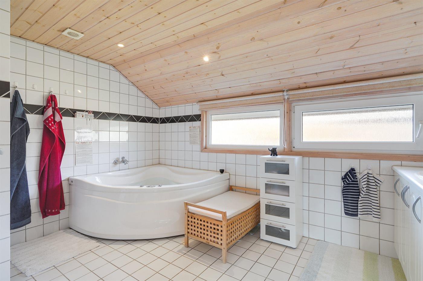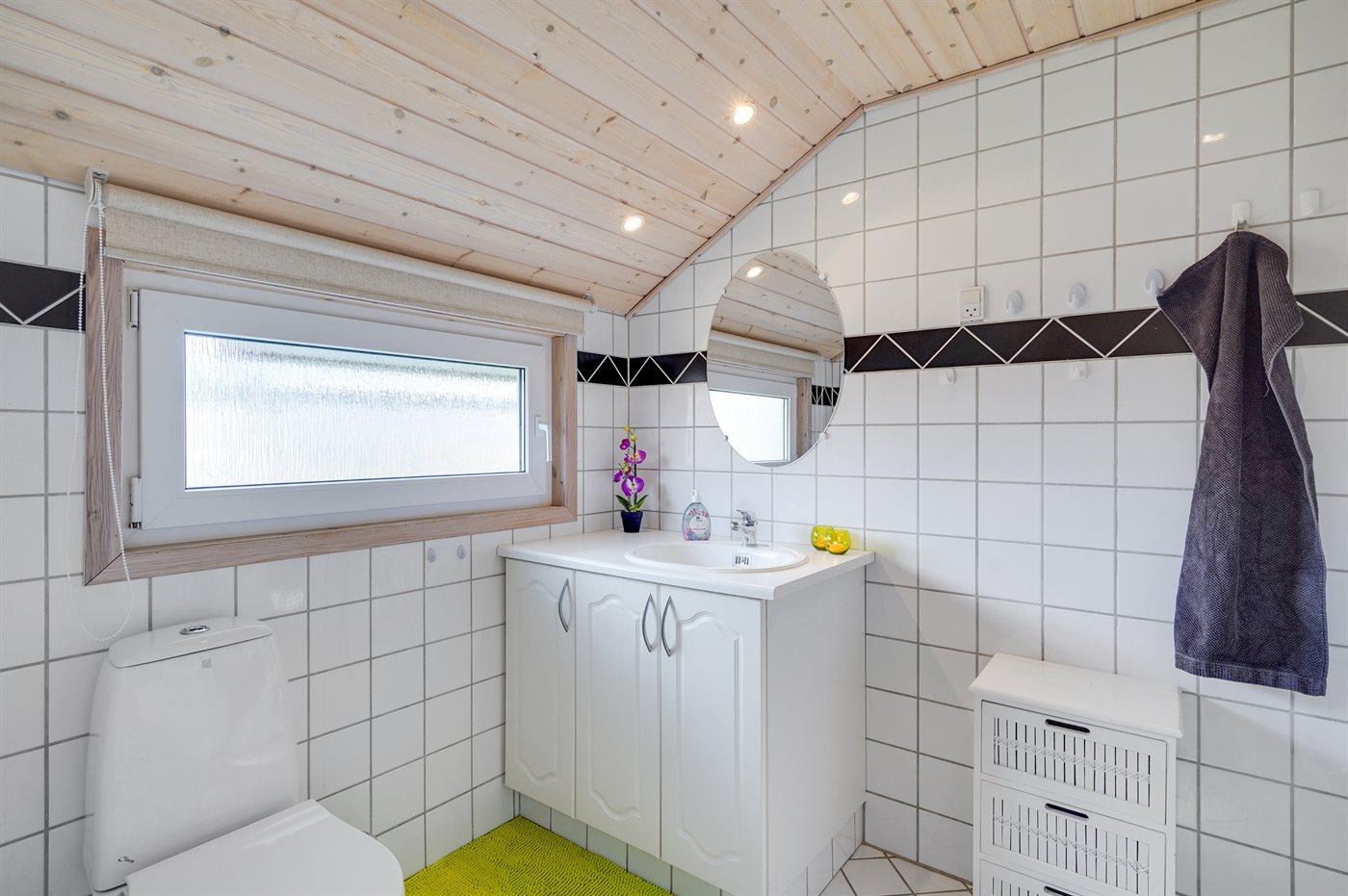 Der er 1 badeværelse med bruseniche og 2 toiletter, heraf 1 gæstetoilet. Der er gulvvarme på 1 badeværelse. Der er gulvvarme på gæstetoilettet. I saunaen er der mulighed for afslapning.