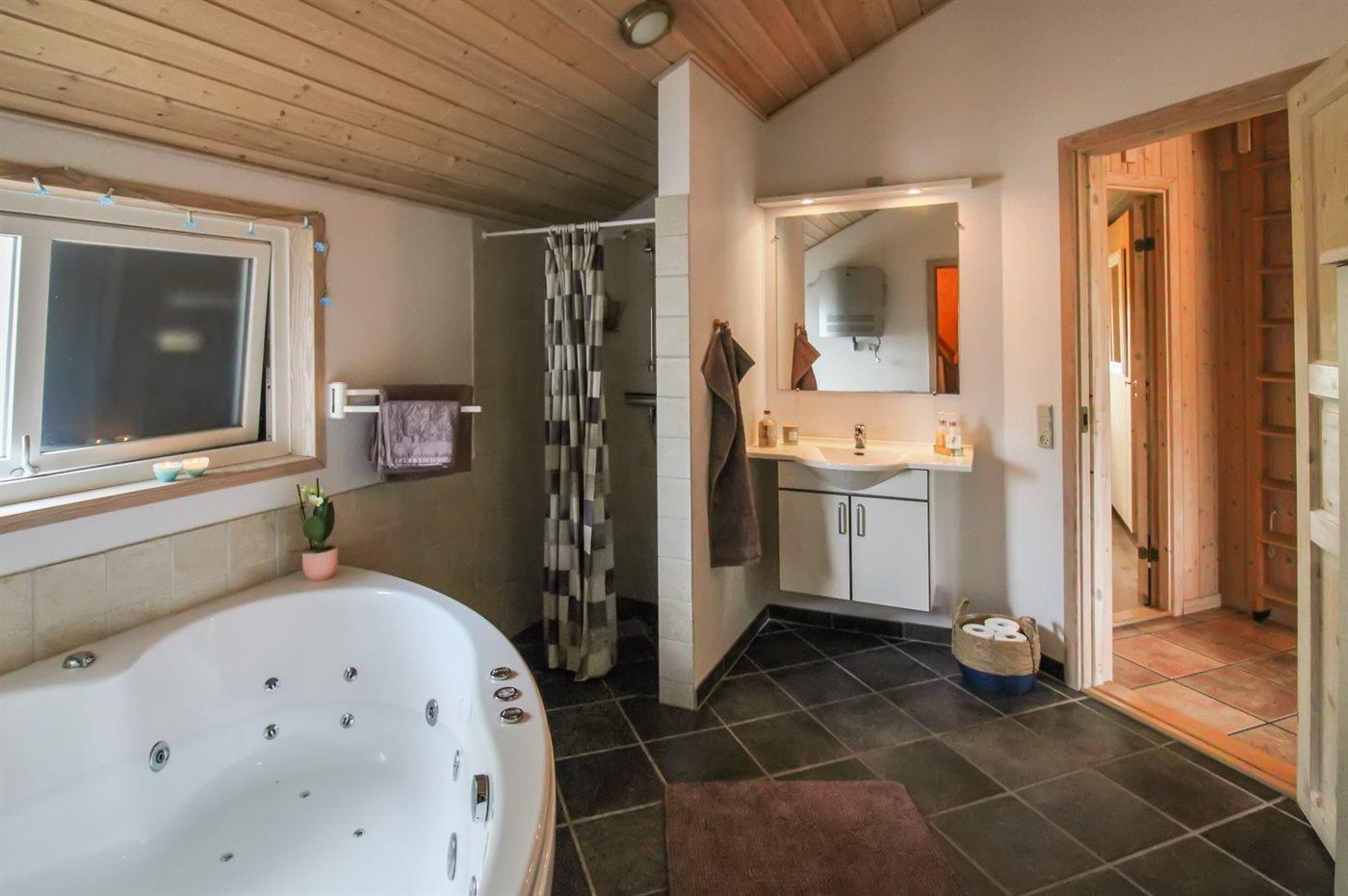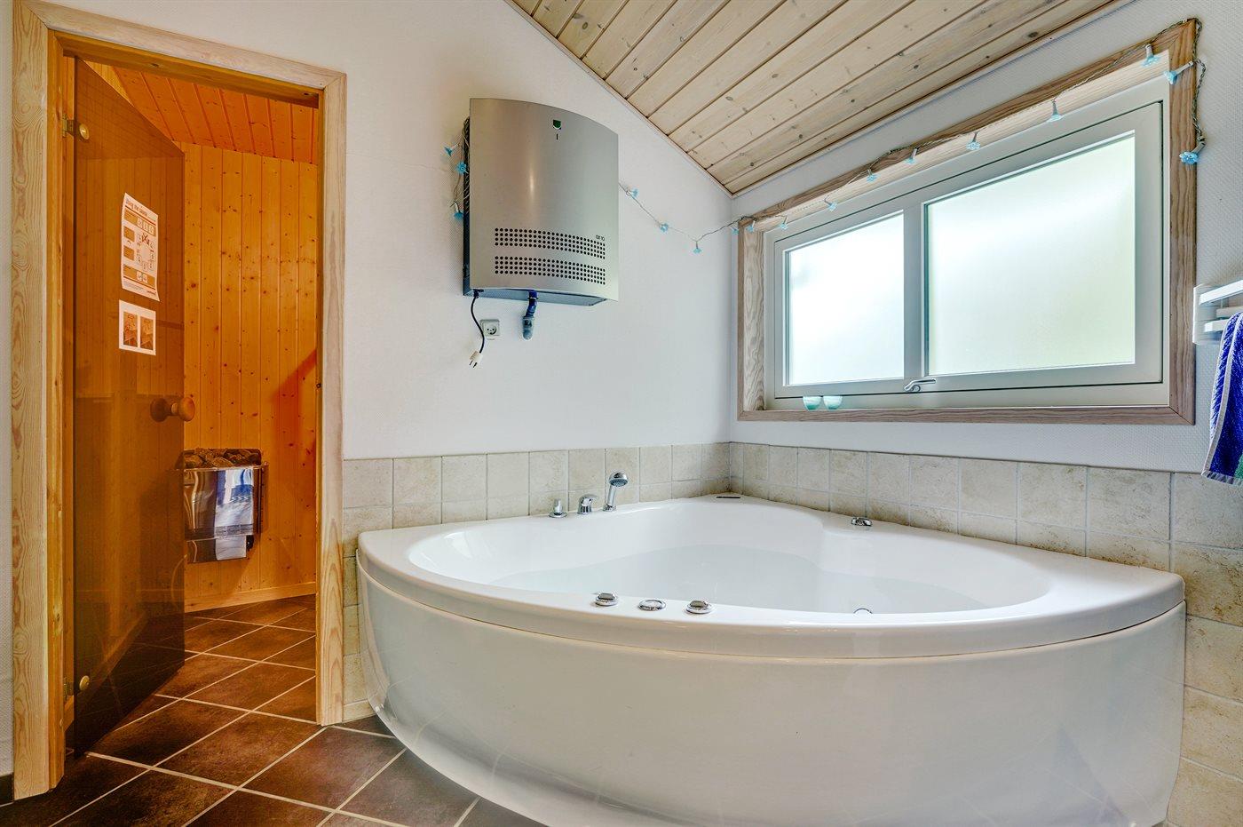 Der er 2 badeværelser med bruseniche og 2 toiletter. Der er gulvvarme på 2 badeværelser. I saunaen er der mulighed for afslapning.