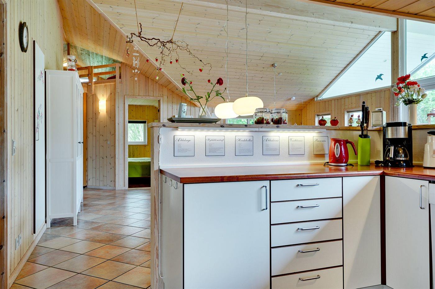 Køkkenet er udstyret med 1 køleskab. Der er 4 keramiske kogeplader, varmluftovn, mikrobølgeovn samt opvaskemaskine.