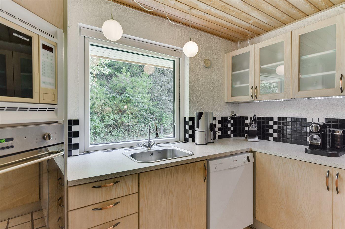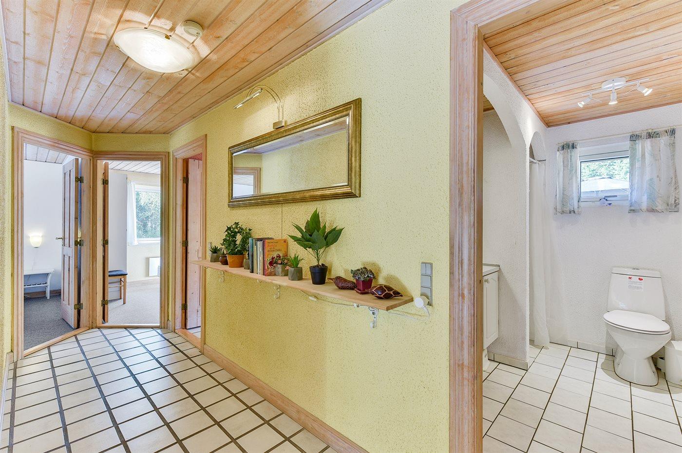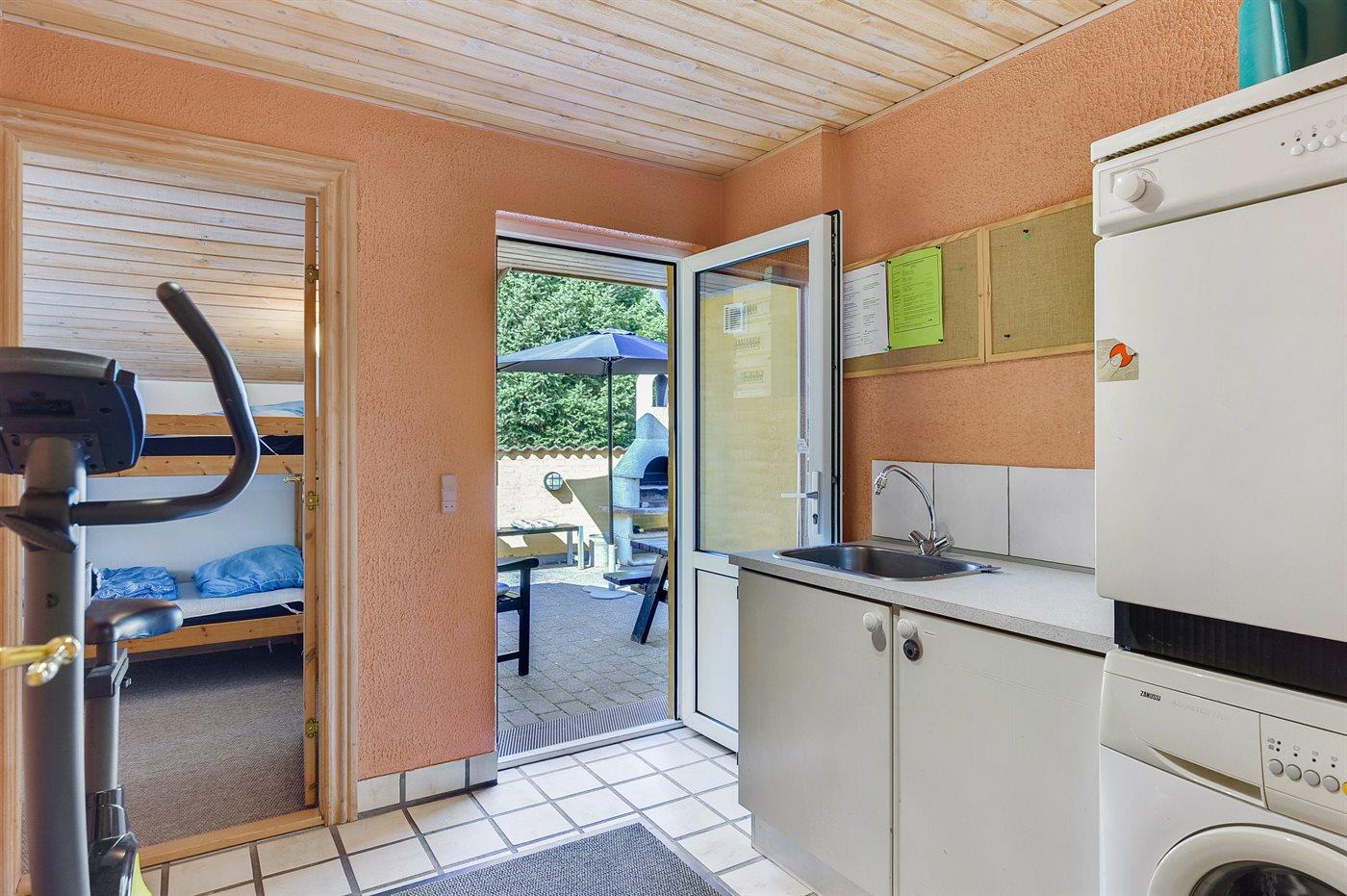 Feriehuset er bl.a. udstyret med motionscykel, vaskemaskine, tørretumbler, opvaskemaskine, køleskab, indbygningsovn med varmluft, 4 keramiske kogeplader, mikrobølgeovn, kaffemaskine samt vandkoger mv. Der er to badeværelser, og begge er med bruseniche og WC. I det ene badeværelse findes der desuden Sensorstyret håndtørrer.