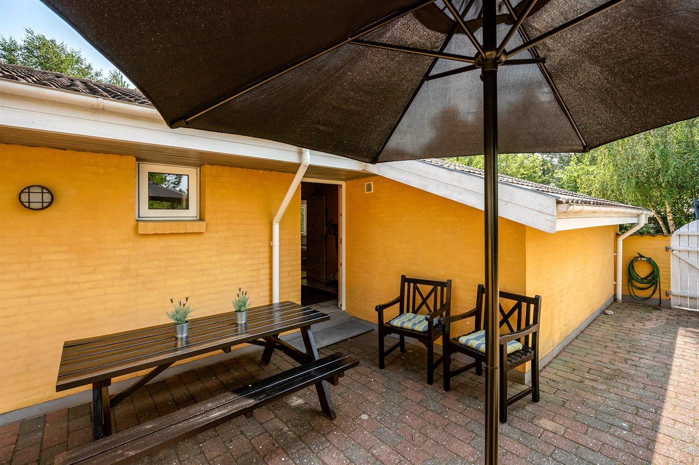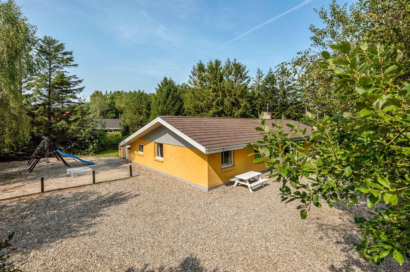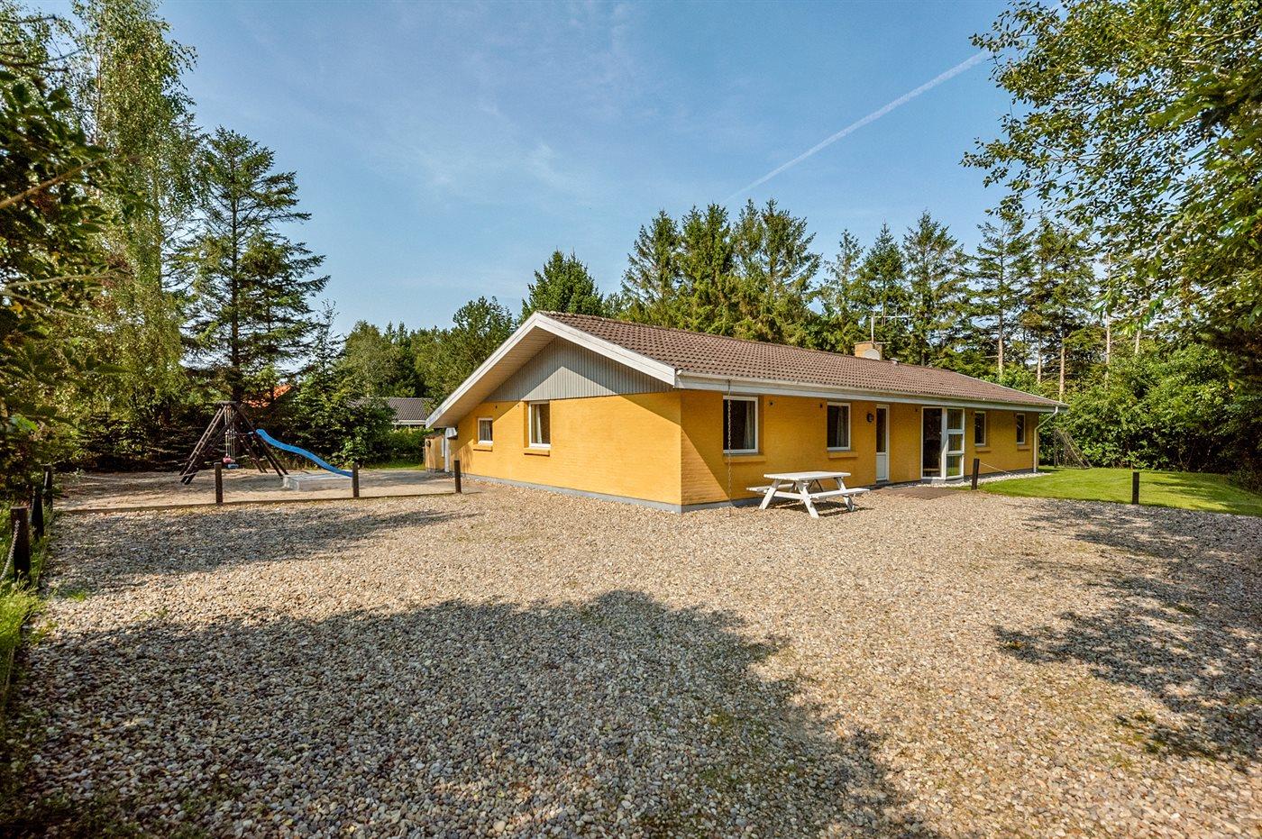 Feriehuset har henholdsvis en 25 m2 åben, og en 25 m² lukket terrasse. Der er i alt 5 soveværelser, hvor sovepladserne fordeler sig på: 8 sovepladser i dobbeltsenge og 2 sovepladser i køjeseng. Derudover er der 1 stk. barneseng til rådighed. Huset er egnet til 10 personer over 3 år samt 1 barn op til 3 år. Der er en barnestol i huset. Det er tilladt at medbringe 2 husdyr.