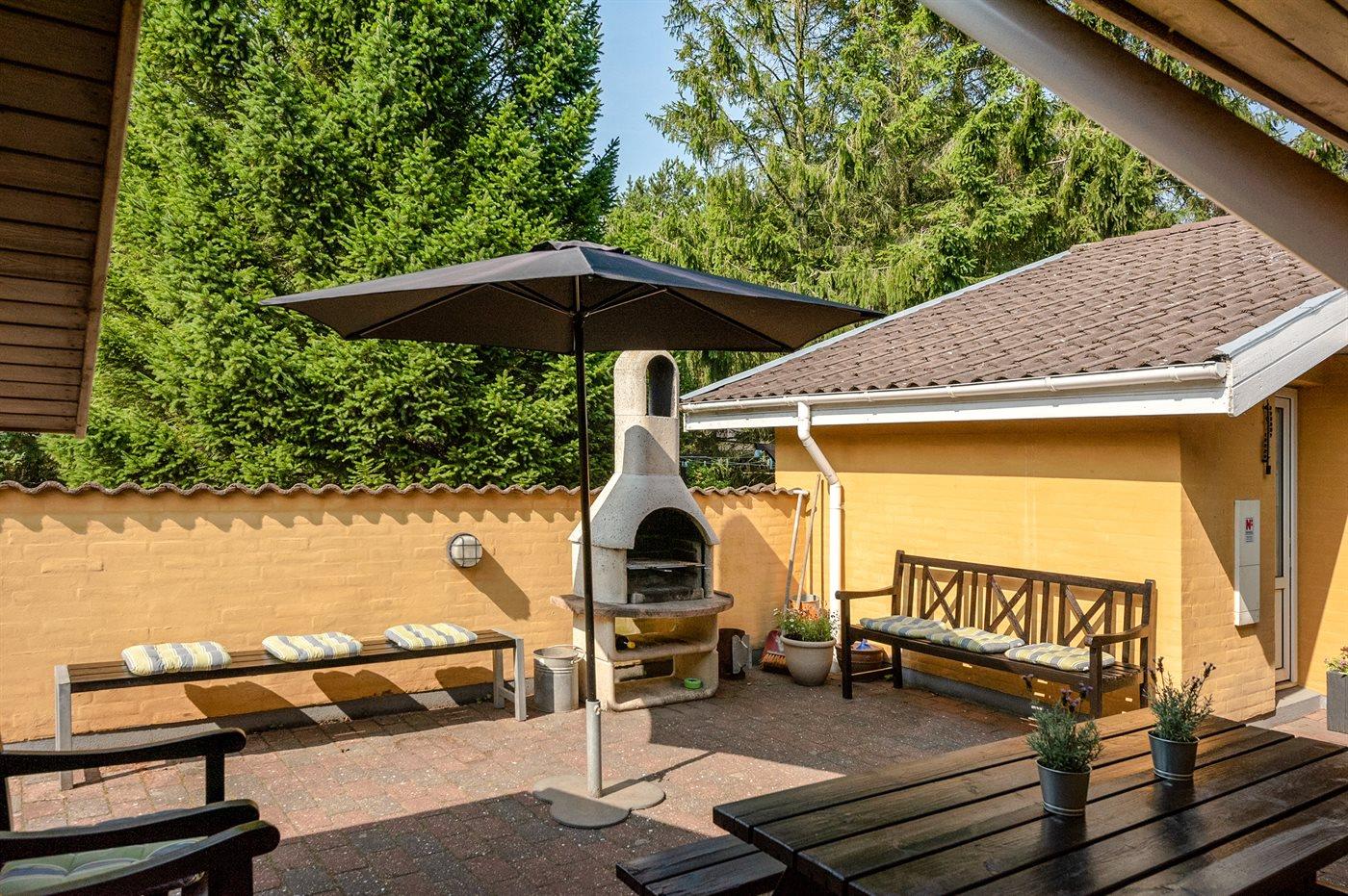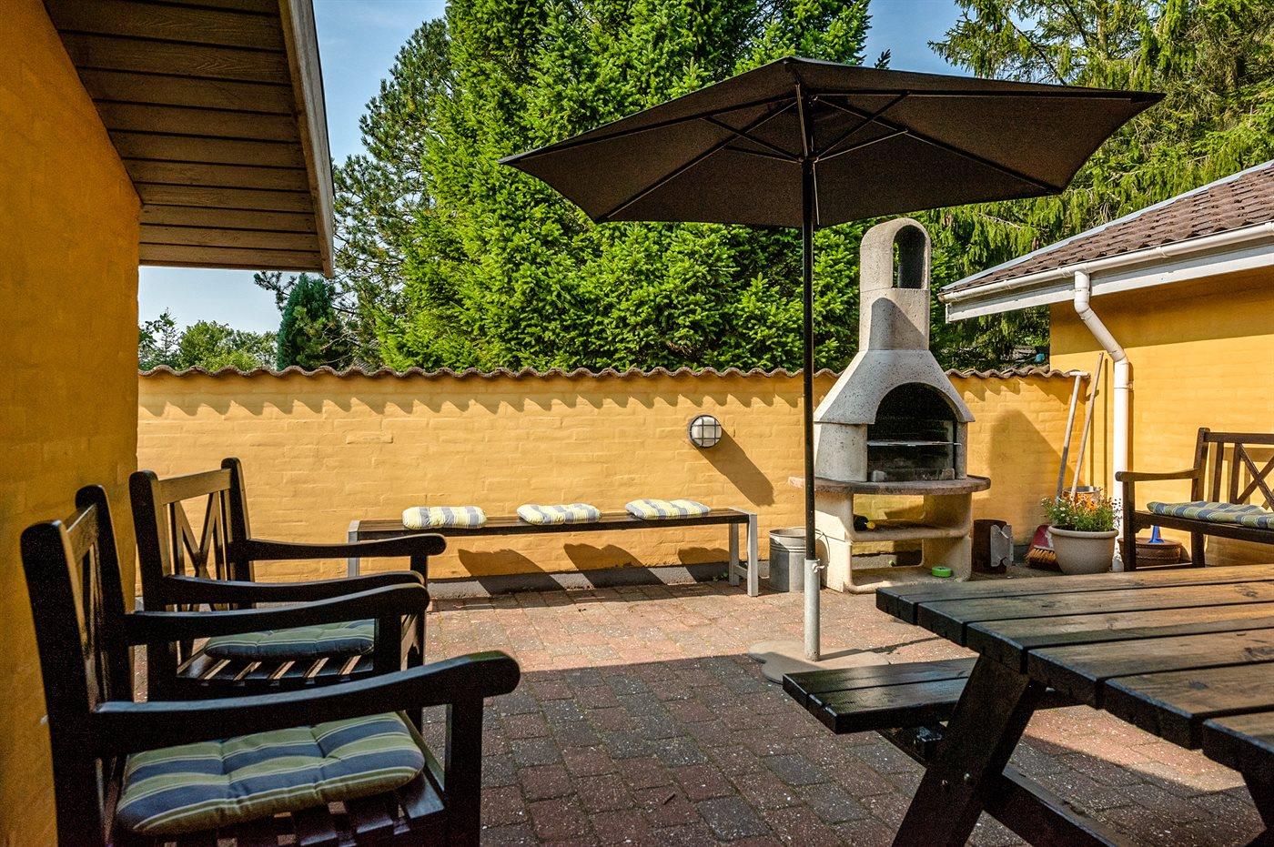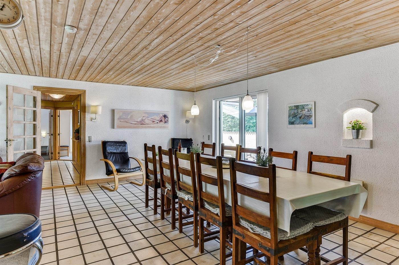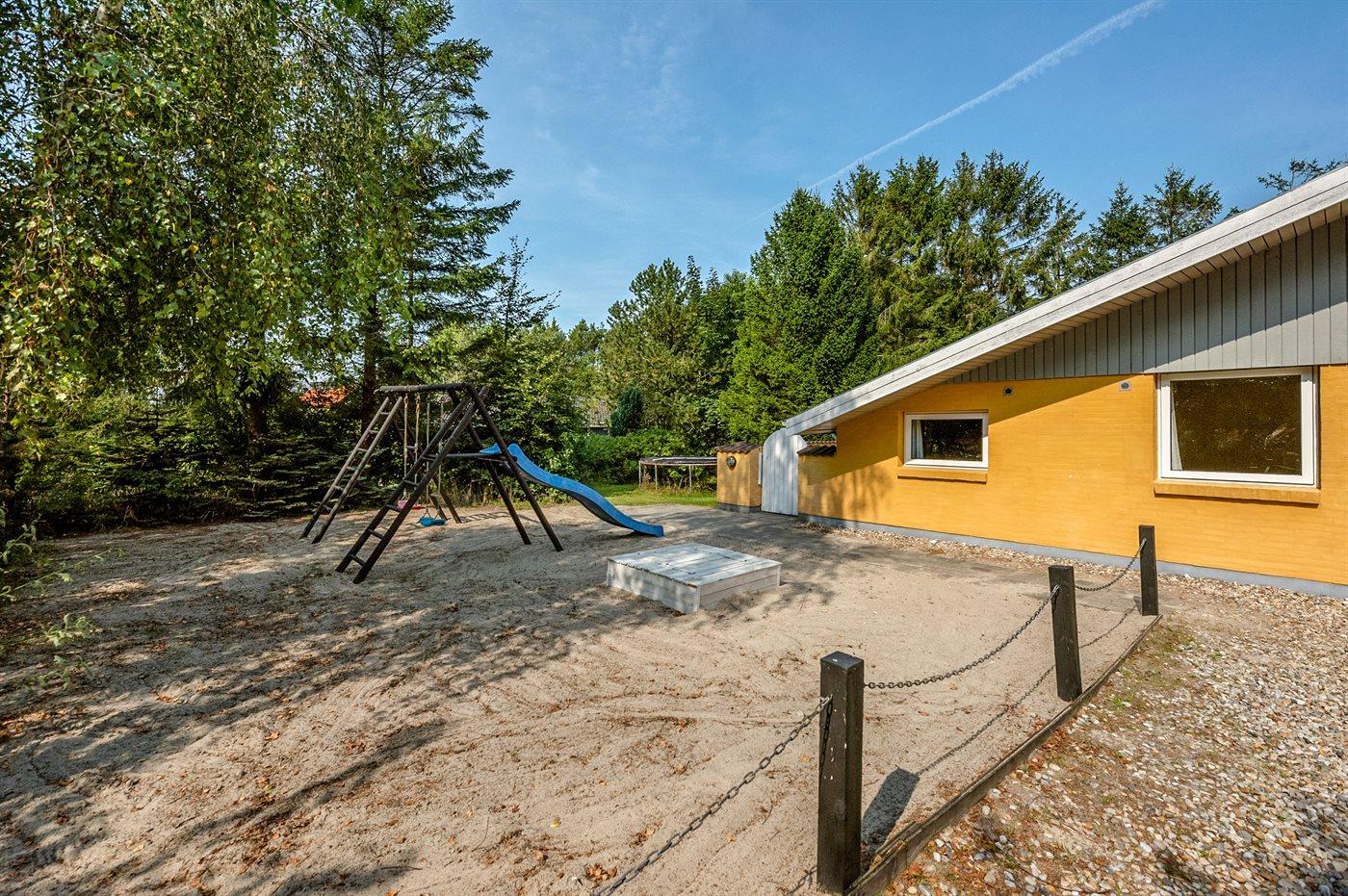 Feriehuset har henholdsvis en 25 m2 åben, og en 25 m² lukket terrasse. Der er i alt 5 soveværelser, hvor sovepladserne fordeler sig på: 8 sovepladser i dobbeltsenge og 2 sovepladser i køjeseng. Derudover er der 1 stk. barneseng til rådighed. Huset er egnet til 10 personer over 3 år samt 1 barn op til 3 år. Der er en barnestol i huset. Det er tilladt at medbringe 2 husdyr.