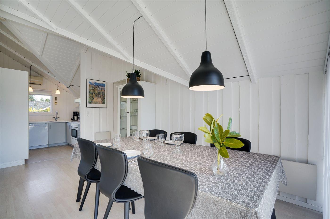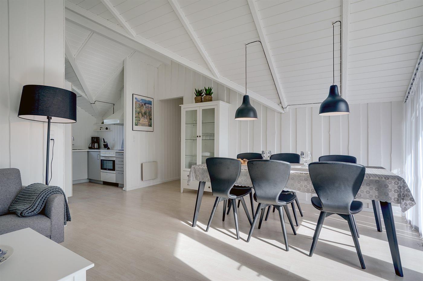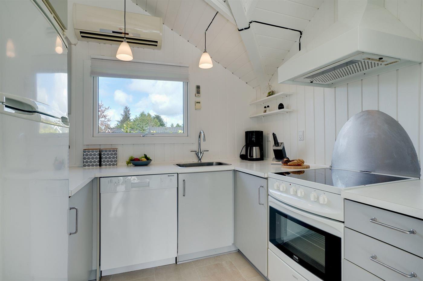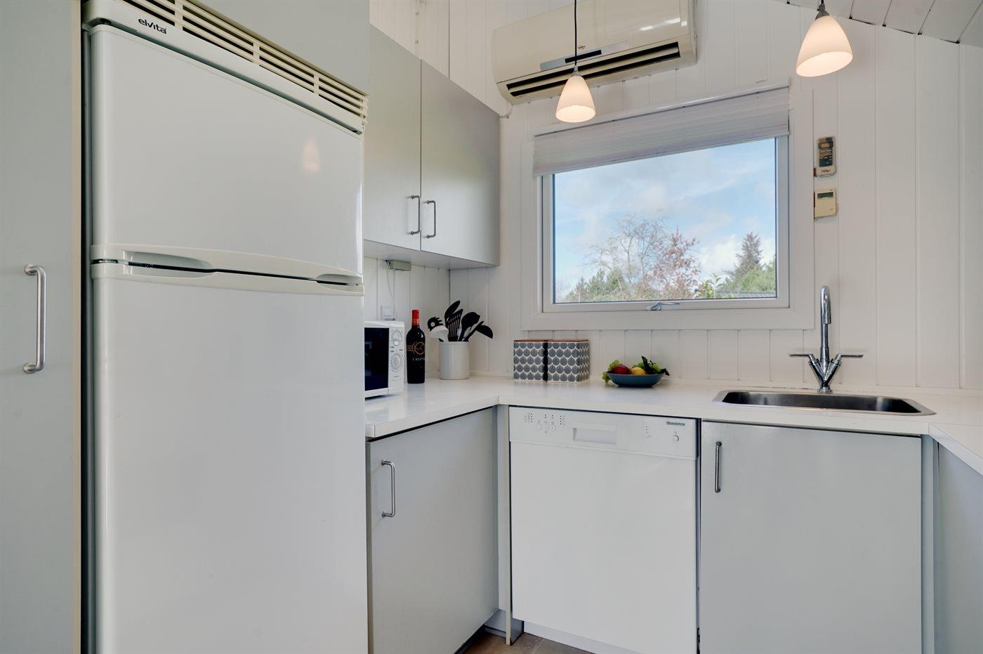 Køkkenet er udstyret med 1 køleskab. Der er 4 keramiske kogeplader, varmluftovn, mikrobølgeovn samt opvaskemaskine.