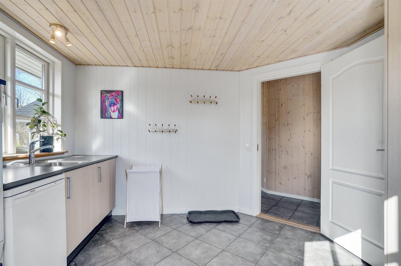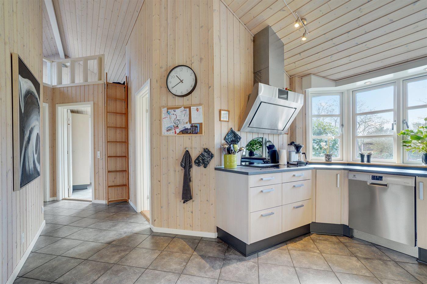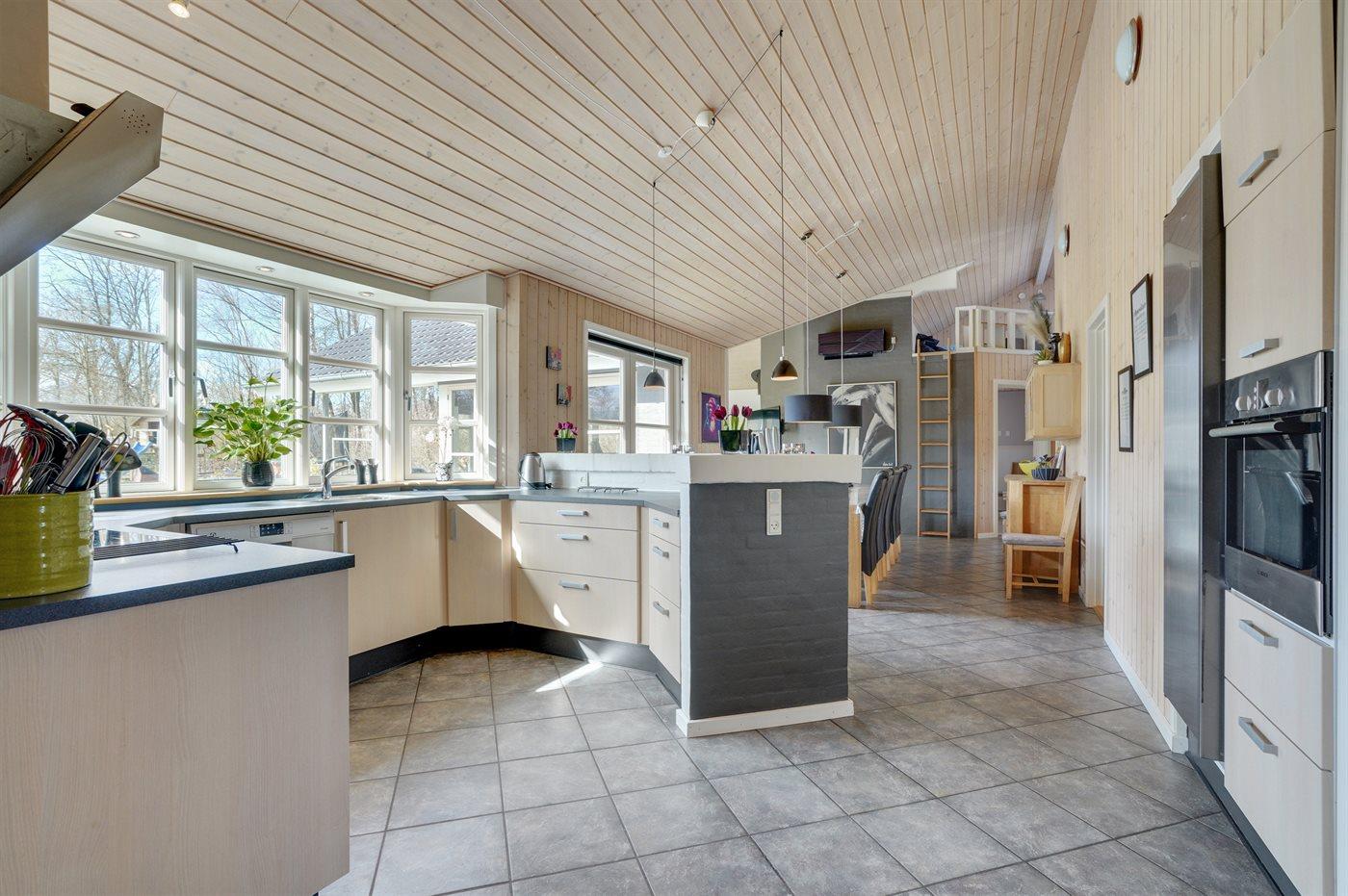 Køkkenet er udstyret med 1 køleskab. Der er 4 keramiske kogeplader, varmluftovn, mikrobølgeovn samt opvaskemaskine Der er gulvvarme i køkkenet.
