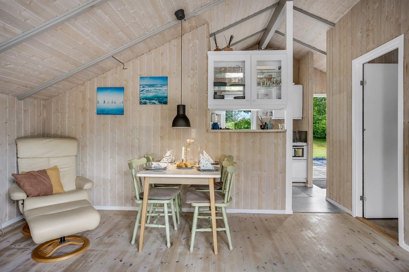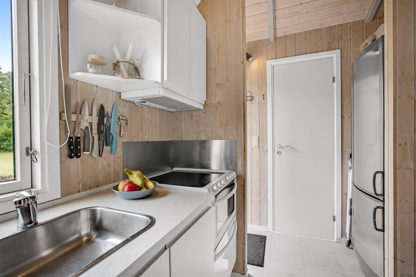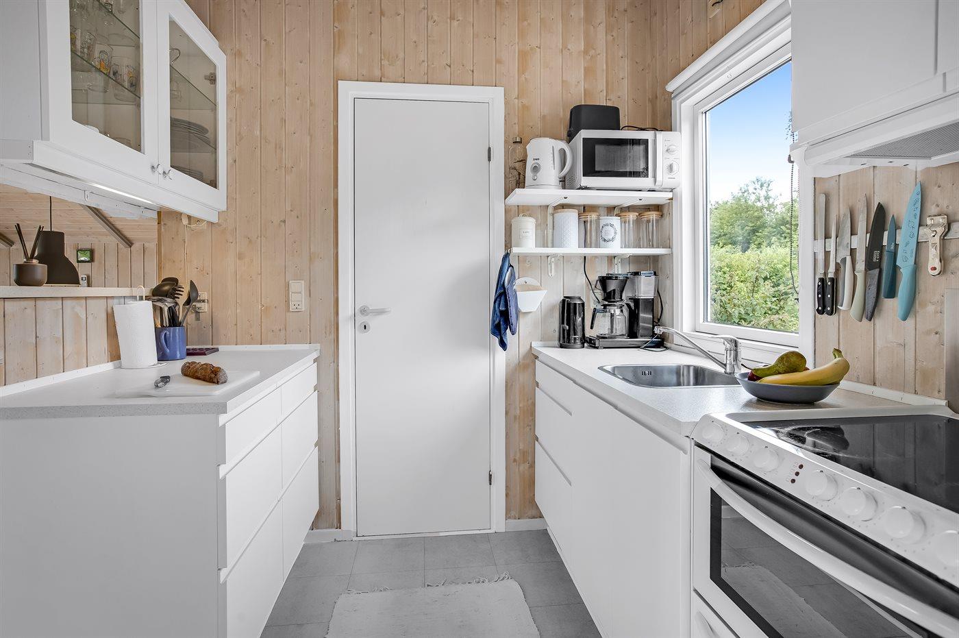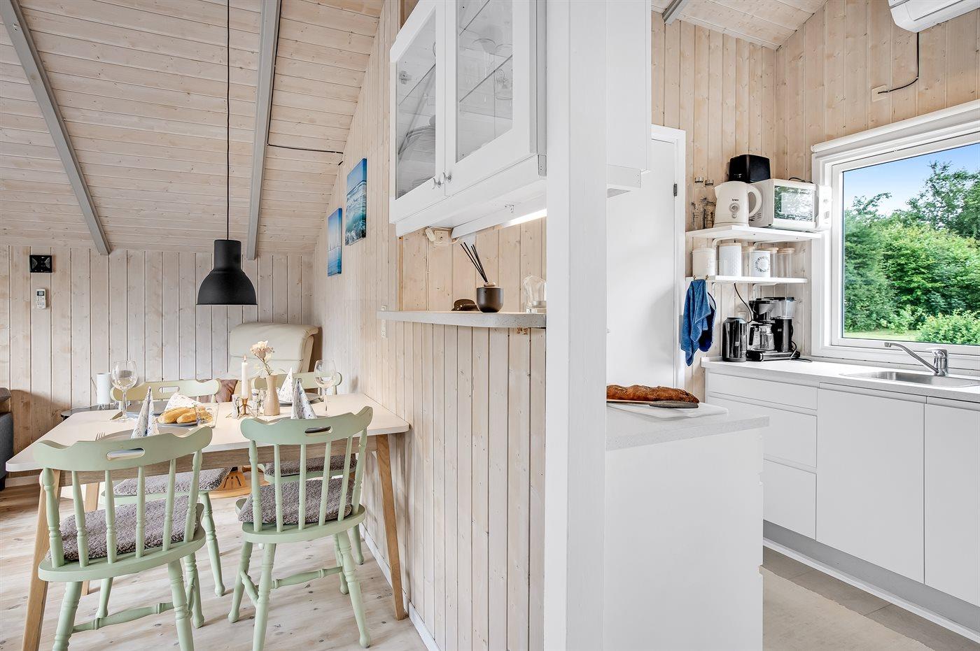 Køkkenet er udstyret med 1 køleskab. Der er 4 keramiske kogeplader, varmluftovn, mikrobølgeovn, Airfryer samt opvaskemaskine.