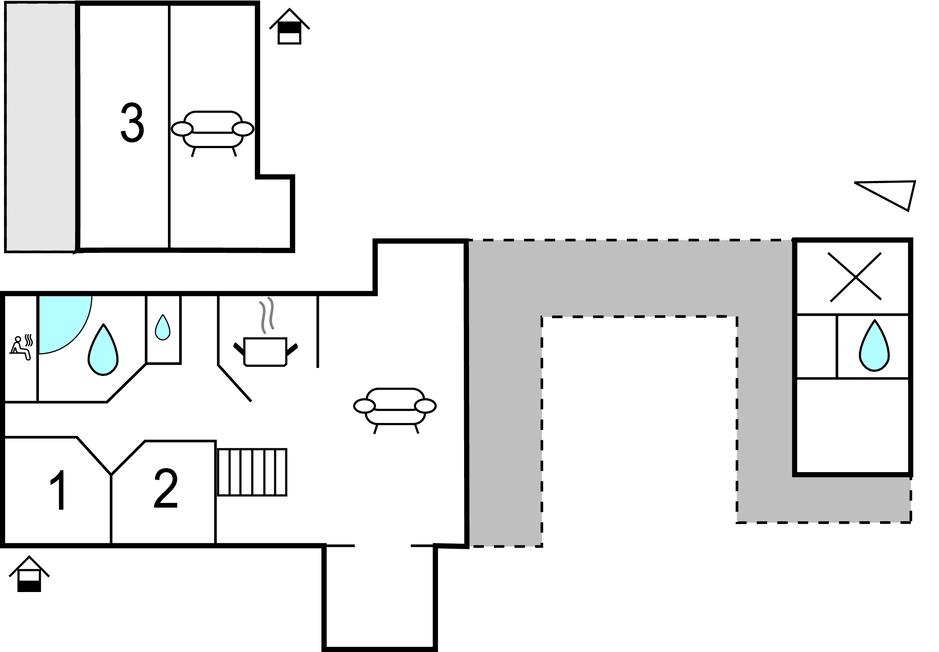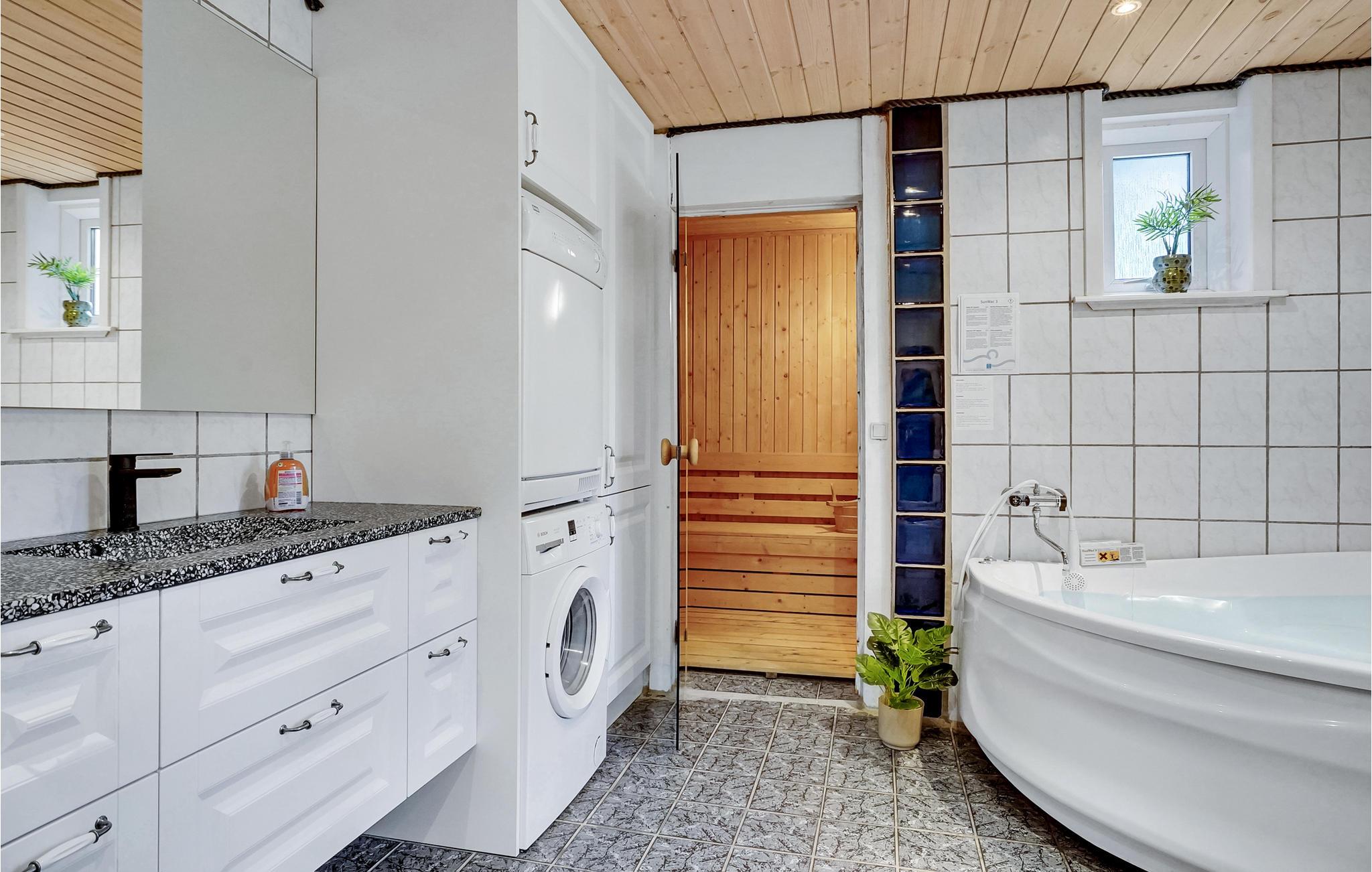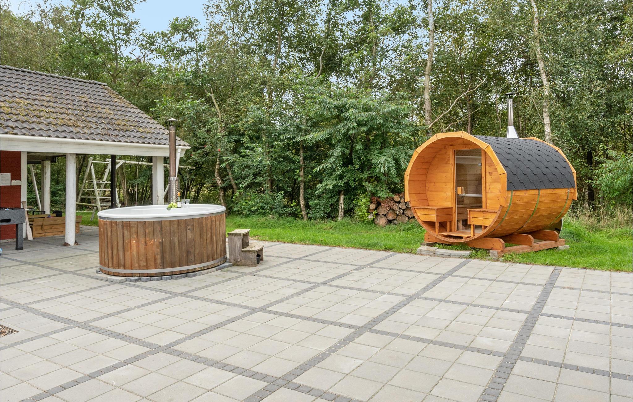 Fra alrummet er der udgang til en overdækket træterrasse, hvor vildmarksbadet er at finde. Udendørs er der også en sauna, så her er rig mulighed for wellness og afslapning både inde og ude.