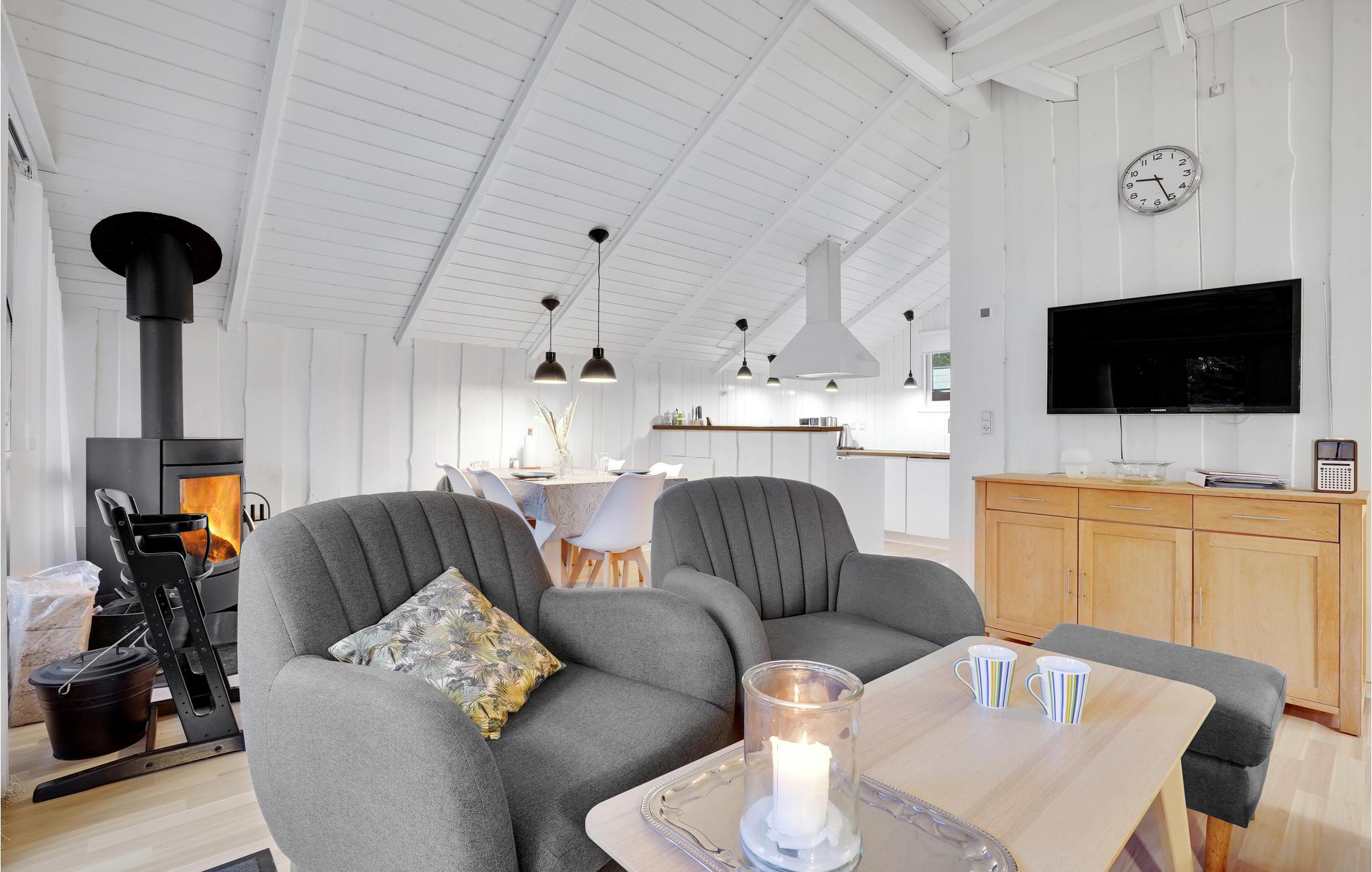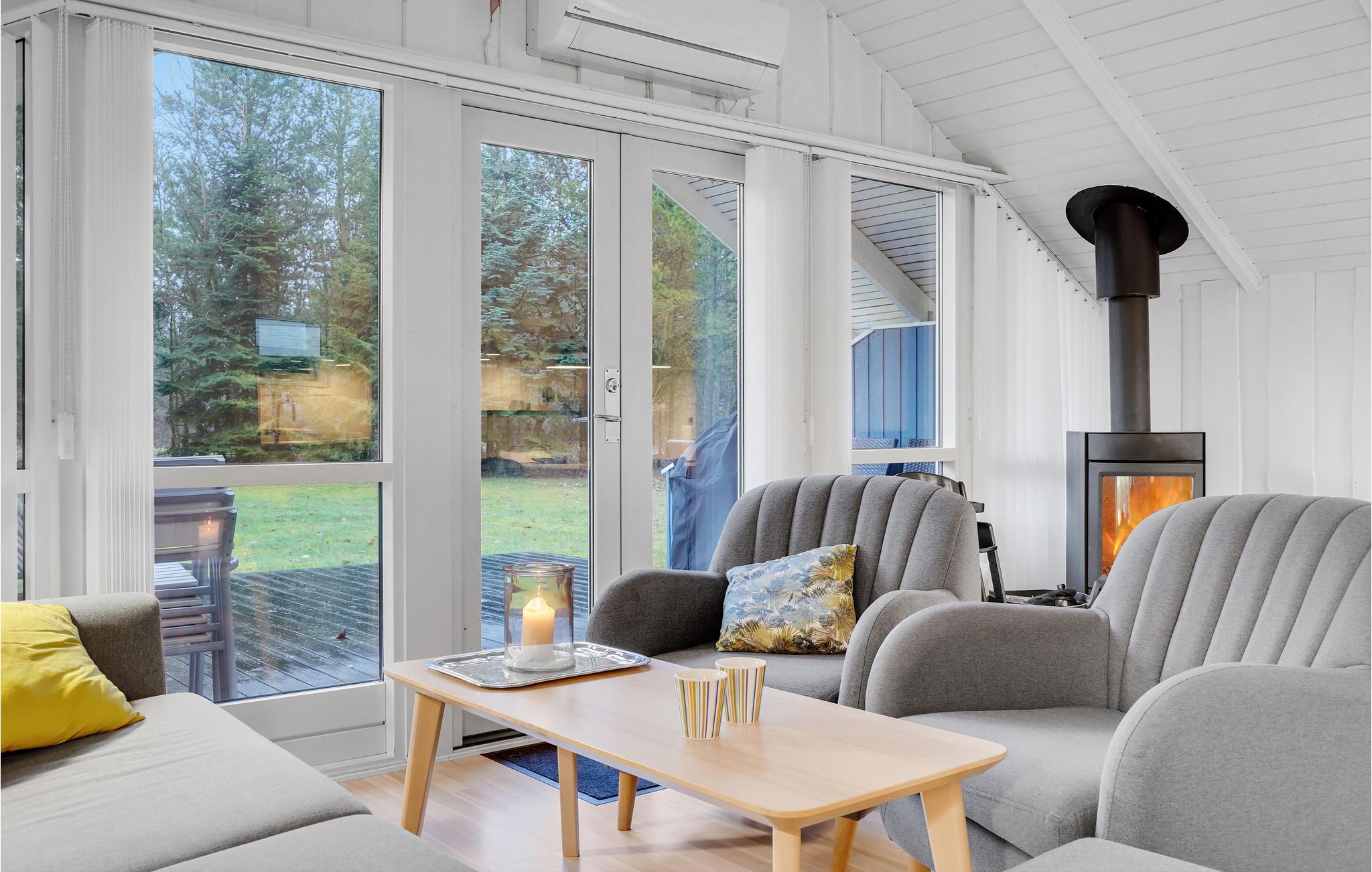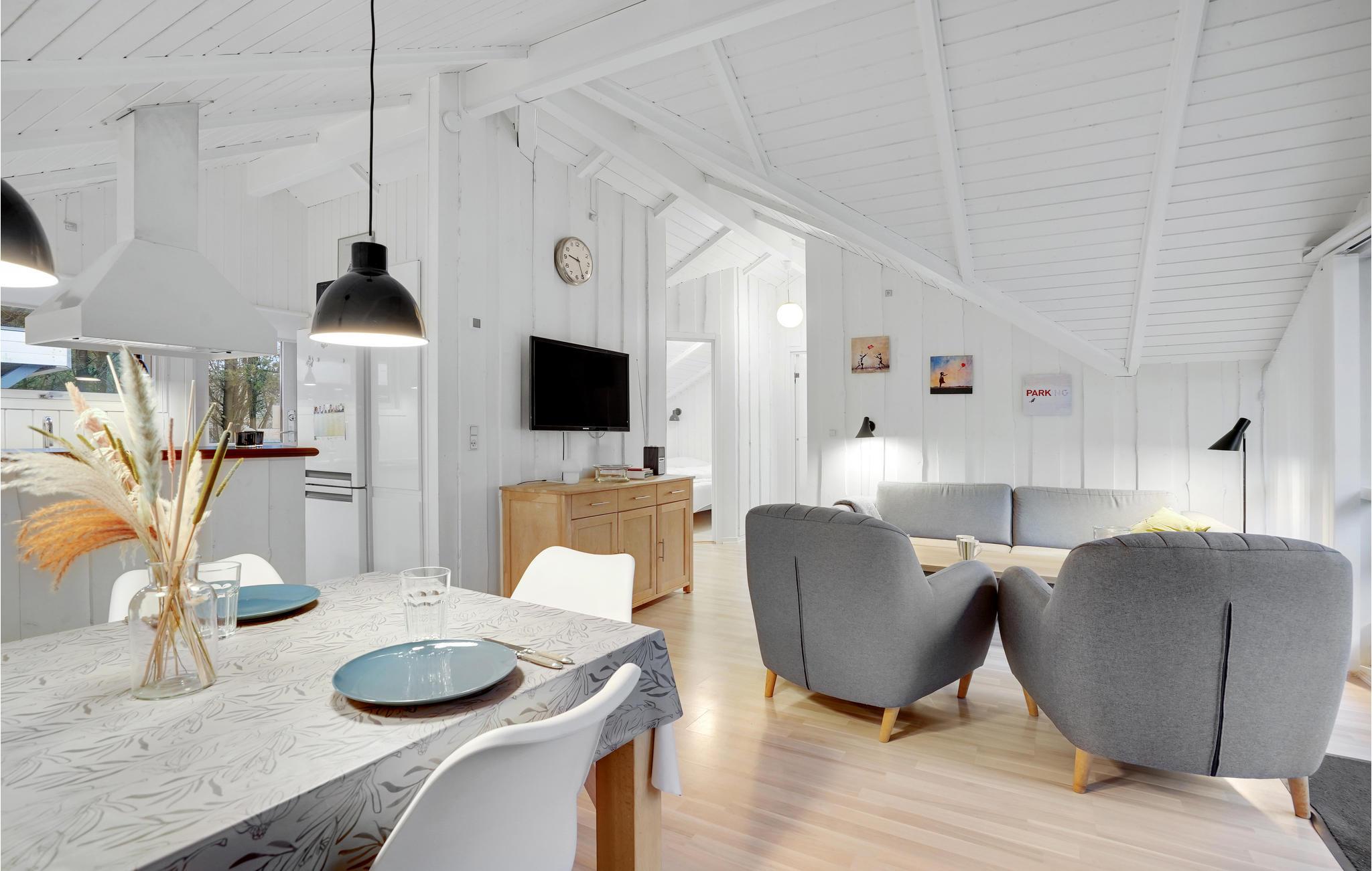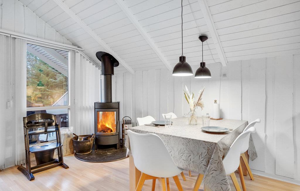 Lyst og smagfuldt indrettet feriehus, beliggende på en hjørnegrund i det hyggelige og meget børnevenlige feriehusområde Jegum Ferieland. Feriehuset indeholder et godt køkken/alrum med brændeovn samt klimaanlæg, og hvorfra der er adgang til husets soveværelser samt badeværelse. Feriehuset fremstår i lyse farver, og er beliggende på en meget stor, ugeneret naturgrund. Der ligger flere gode og delvis overdækkede terrasser omkring feriehuset, ligesom der er opført en carport, så jeres bil kan stå i ly.