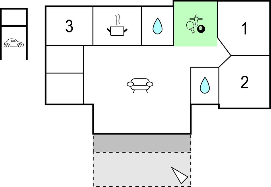 På en stor og delvis lukket naturgrund ligger dette aktivitetsferiehus med bordfodbold. Det er indrettet med et godt og rummeligt køkken/alrum med brændeovn samt klimaanlæg. Til huset hører også en skøn terrasse, hvor familien kan sidde og nyde eftermiddagskaffen eller sole sig på varme sommerdage. I haven er der både legehus, gynge, sandkasse og fodboldmål, og I kan også tage et spil petanque. Efter en dejlig udflugtsdag er det skønt at komme hjem til feriehuset, parkere bilen i carporten, lave lækker aftensmad på grillen for derefter at slappe af foran fjernsynet, måske tage et spil kort eller brætspil.