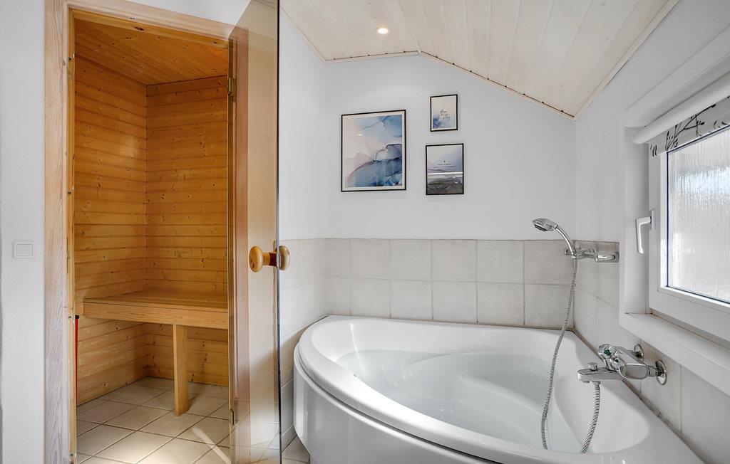 På en dejlig afskærmet grund i Jegum Ferieland ligger dette flotte feriehus. Det er moderne og gedigent indrettet med god plads i alle rum, og det er flot og komfortabelt møbleret. Bl.a. er der et stort hjørnebadekar i det velindrettede badeværelse med direkte adgang til saunaen. I køkkenet er der gulvvarme. Fra stuen er der adgang til en delvist overdækket, sydvendt læfyldt terrasse med rigtig gode havemøbler. Den store hems er velegnet som legerum for børnene. Ved områdets aktivitetscenter er der petanquebane, minigolf samt tennisbane, ligesom der er gode indkøbsmuligheder, restaurant, fælles legeplads, hoppeborg, spilleland m.m. Der er flere golfbaner samt fiskesøer i området. Trampolin på grunden og brug af denne er på eget ansvar. Glæd jer også til at besøge det lokale badeland eller bowlingscentret, hvor I kan få mange sjove oplevelser sammen.