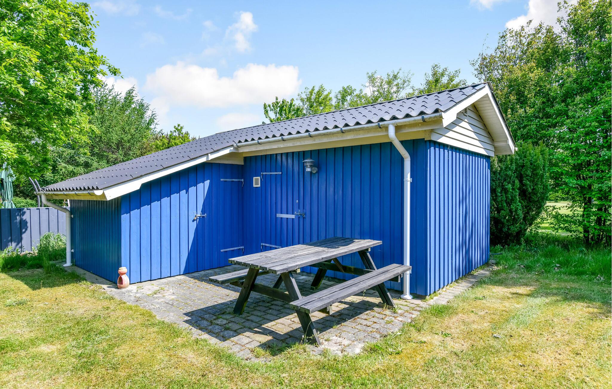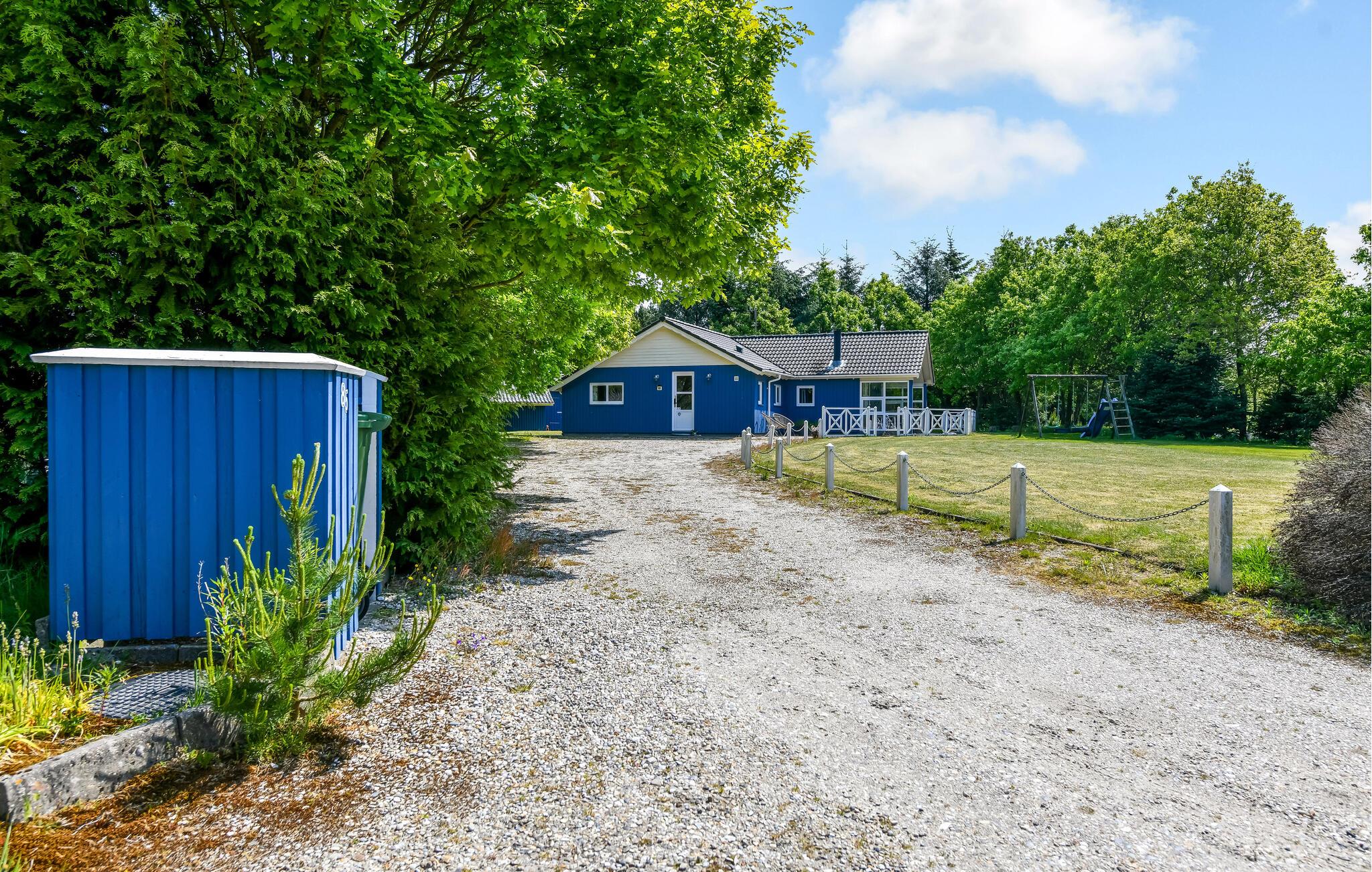 Udenfor finder I den store og flotte have, der lokker til mange solrige timer i den danske sommer. Nyd en lækker aftensmad på den overdækkede terrasse, mens børnene spiller fodbold på jeres egen fodboldbane eller boltrer sig med legeredskaberne.
