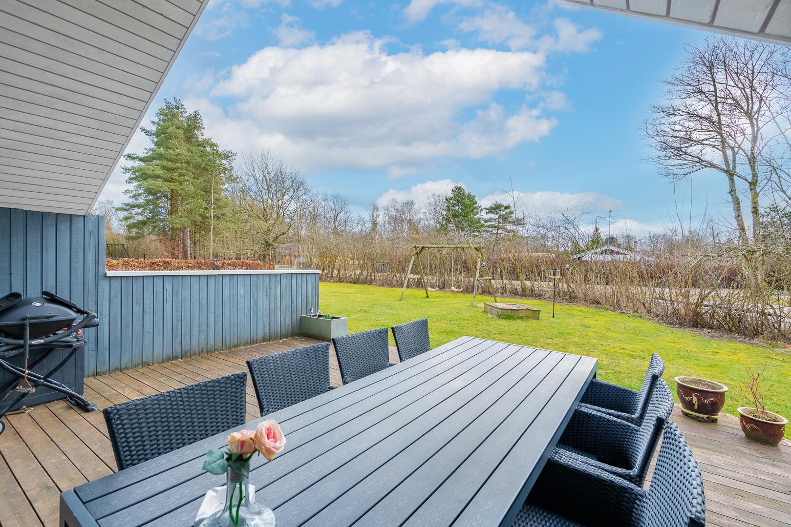 Terrassen, som delvist er overdækket, indbyder til afslapning hele dagen – fra morgenkaffen under åben himmel til hyggelige aftener med grill og god mad.