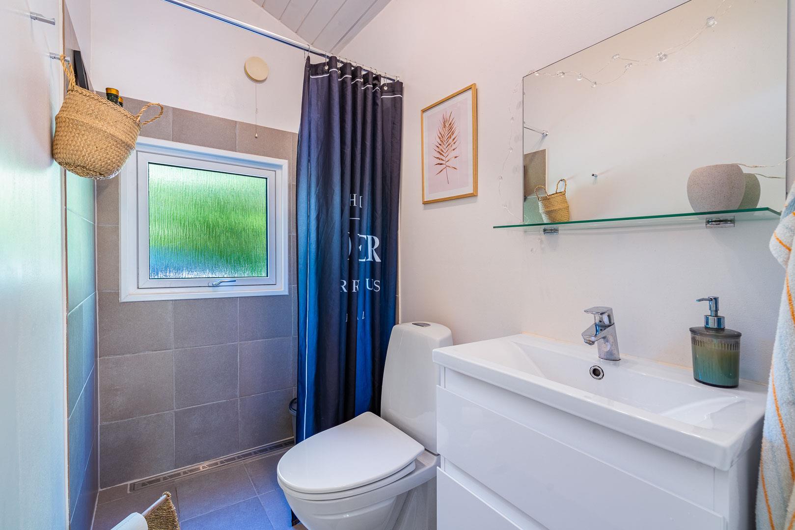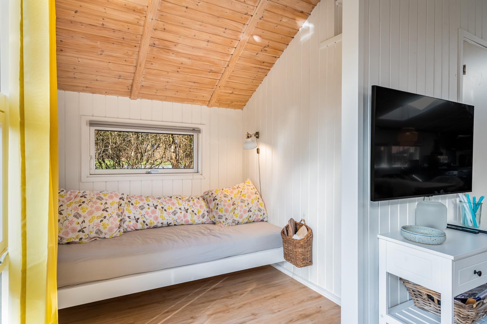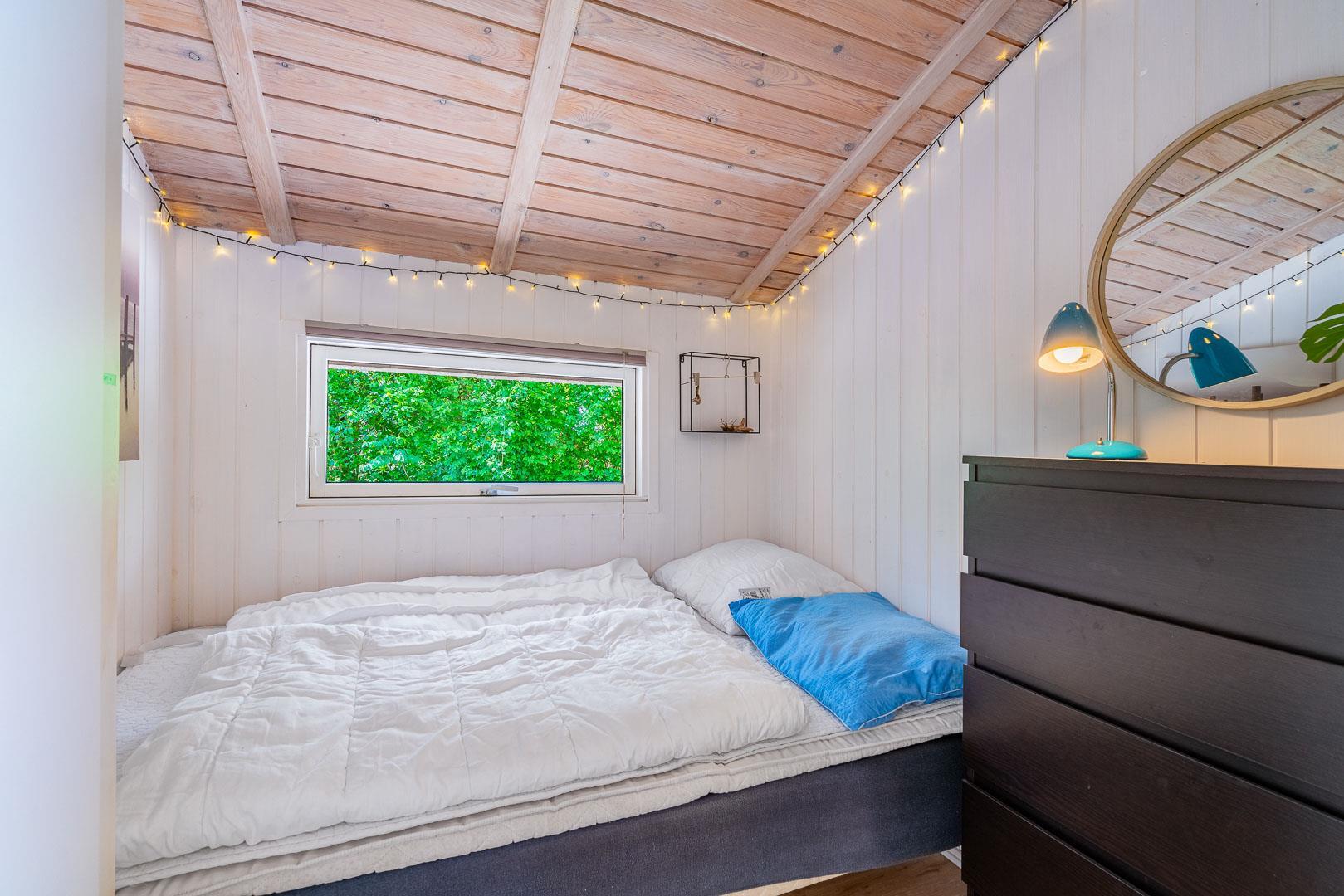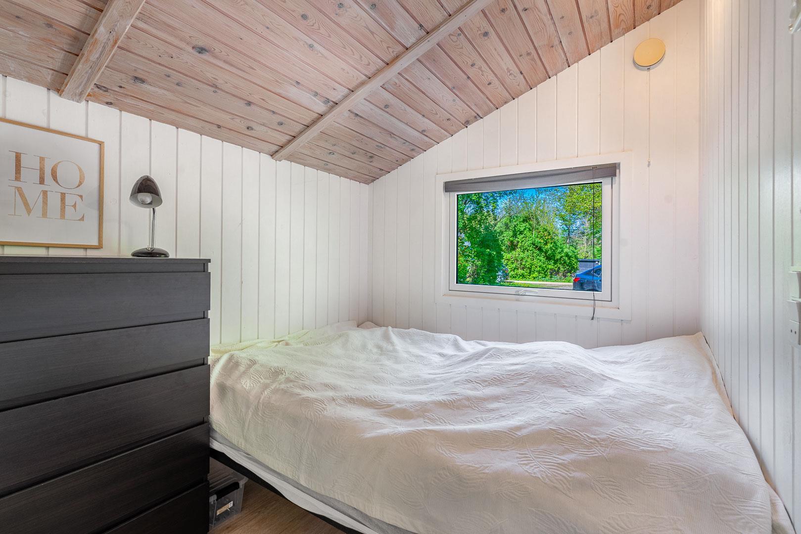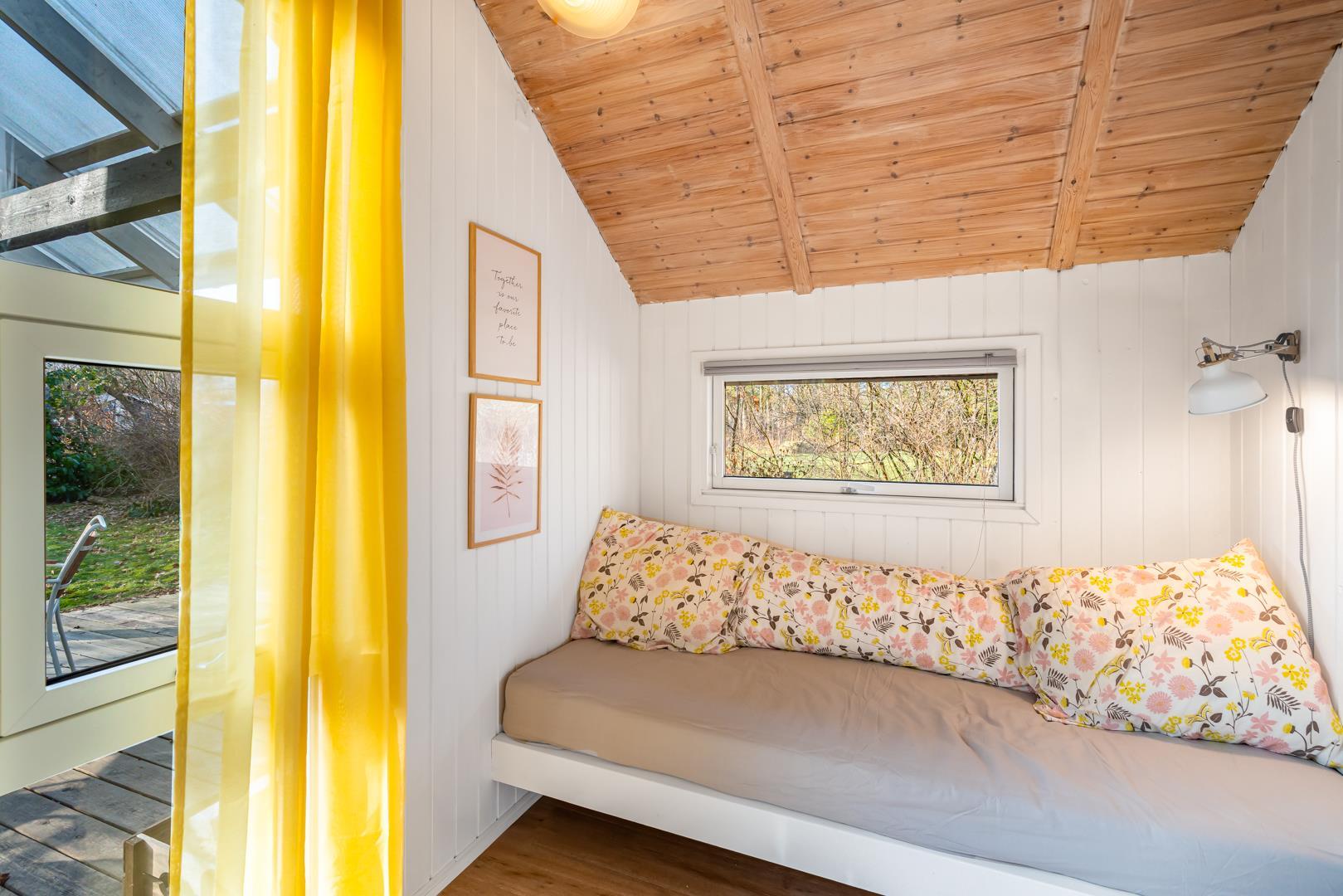 Sommerhuset har to soveværelser, begge med dobbeltsenge (140x200 cm og 120x200 cm) og en åben alkove med 90 x 200 cm sovebriks, så der er plads til den lille familie, et par eller bedsteforældre med børnebørn. Badeværelset har gulvvarme, så I kan starte dagen komfortabelt med varme fødder.