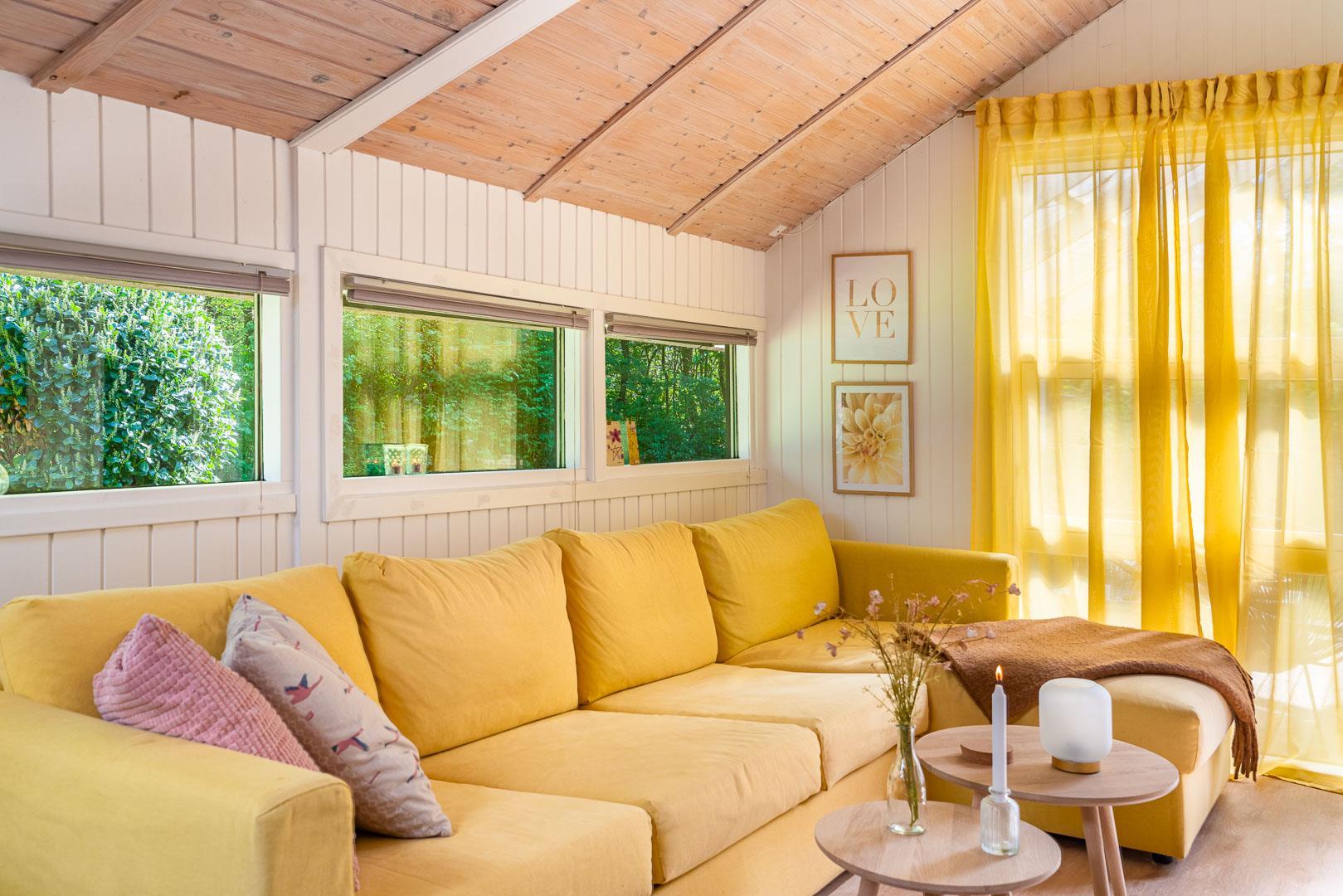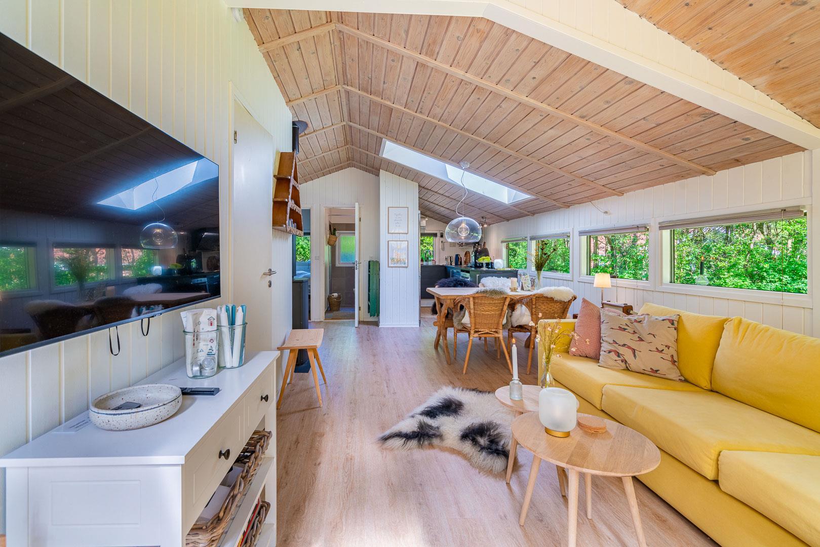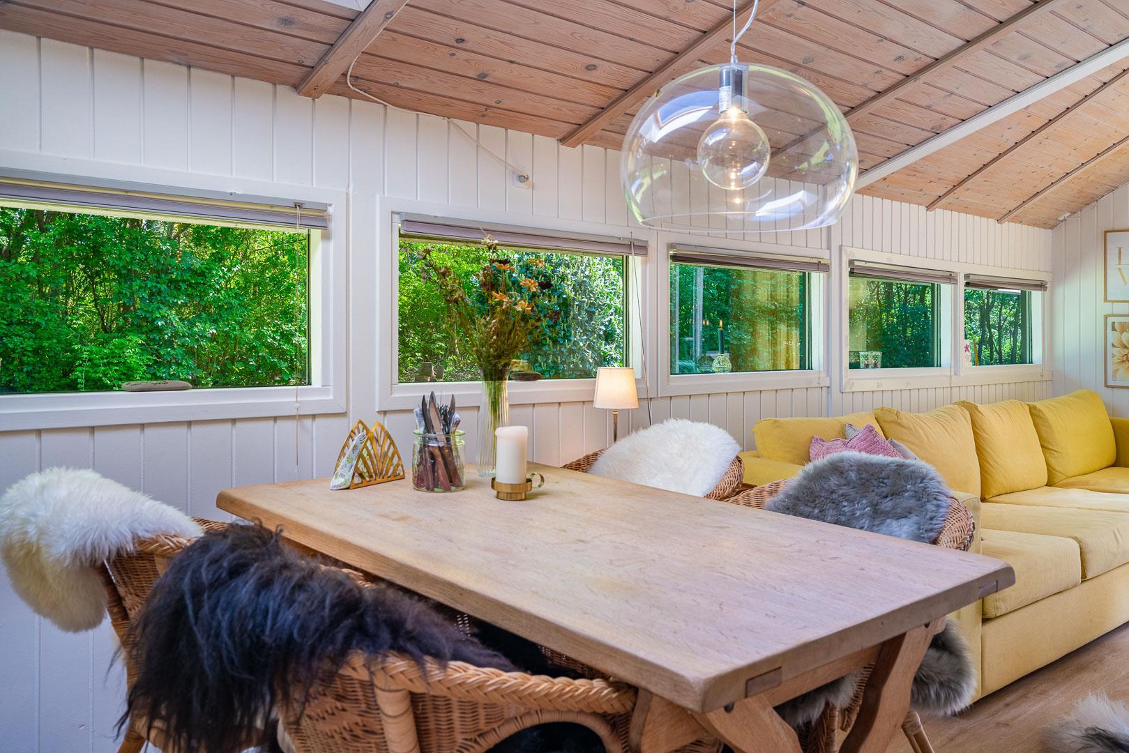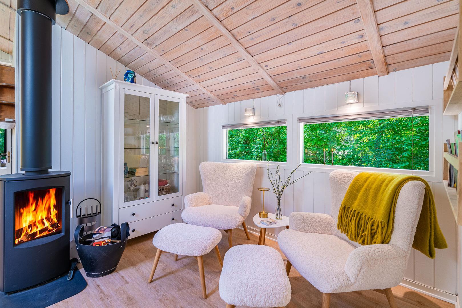Det lyse og indbydende opholdsrum er sommerhusets naturlige samlingspunkt. Store vinduer giver et dejligt lysindfald, og på kølige dage spreder brændeovnen varme og hyggestemning. Her kan I nyde en god bog, et glas vin foran ilden eller en sjov spilleaften sammen.