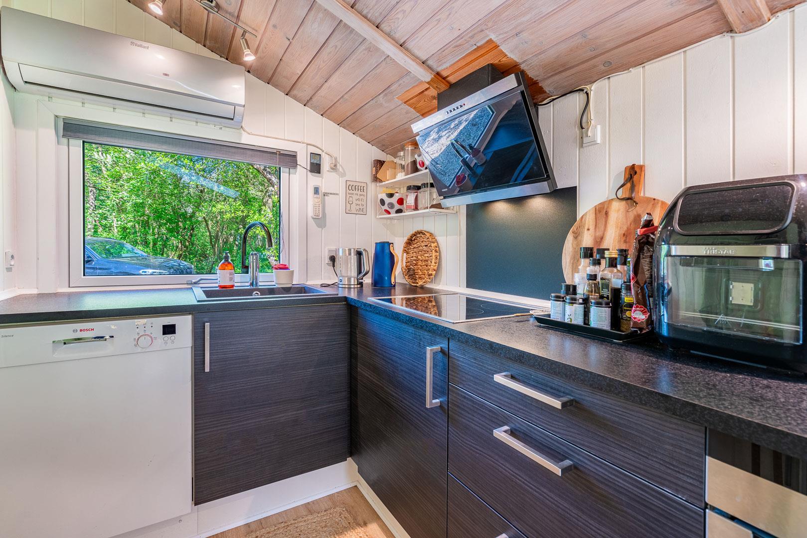Det åbne køkken ligger i direkte forbindelse med spisepladsen og er fuldt udstyret med alt, hvad I har brug for til madlavningen – inklusive opvaskemaskine, så I får mere tid til afslapning.