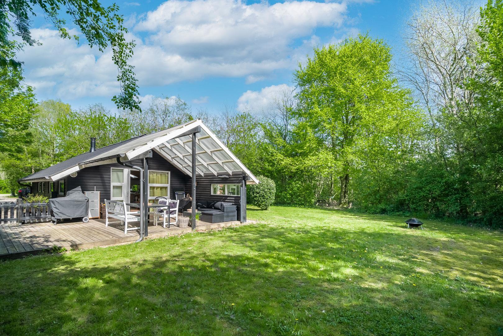 Den store naturgrund giver rig mulighed for leg, spil og afslapning. På den overdækkede terrasse kan I nyde jeres måltider udendørs – uanset vejret. Til børnene er der gynge, sandkasse og trampolin, så underholdningen er sikret.