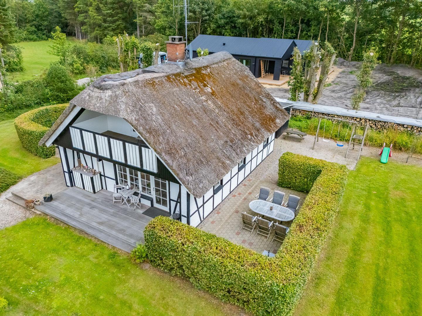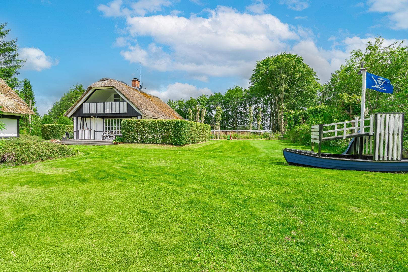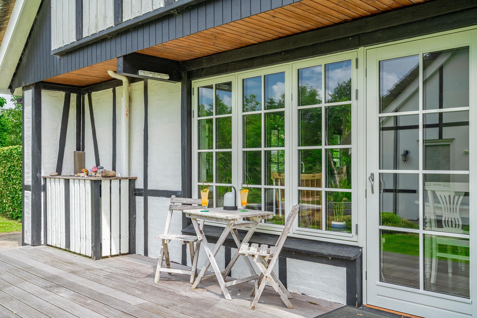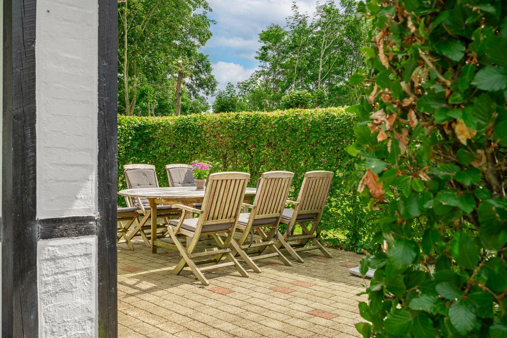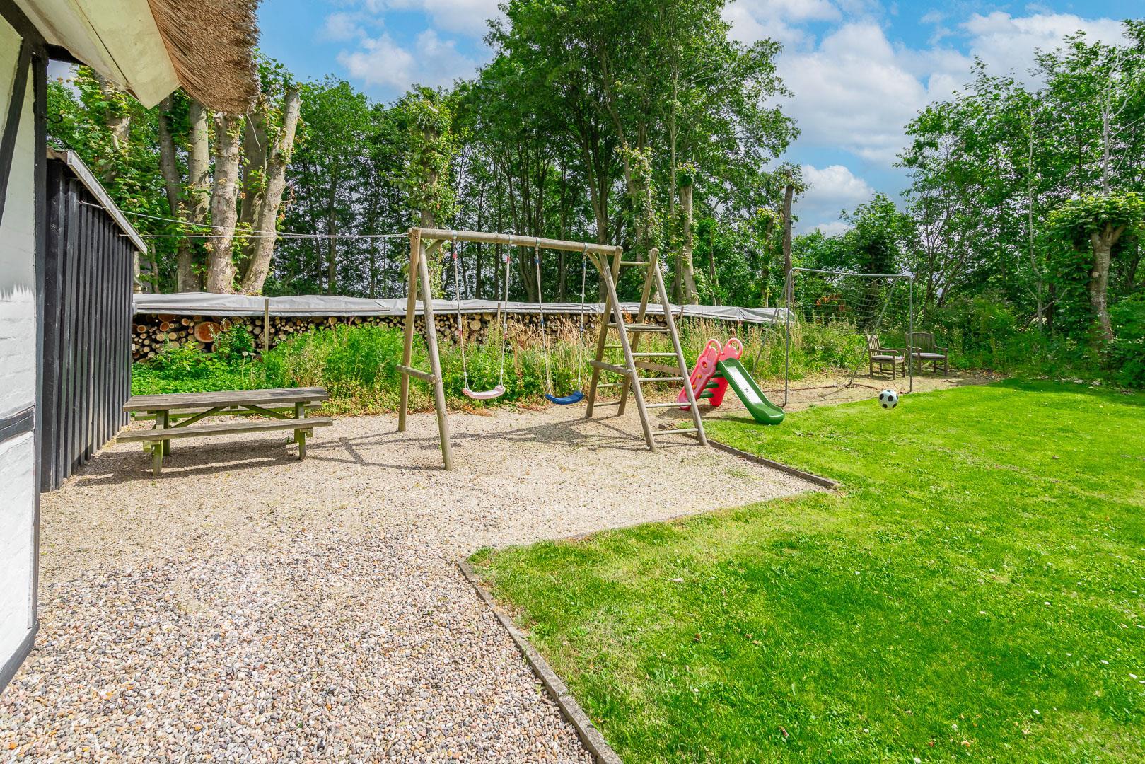 Udendørs byder Møllevangen 22 på en stor terrasse med havemøbler – ideel til morgenkaffen i solen eller hyggelige aftener med familien. Børnene kan more sig med gyngen og sandkassen, mens hunden slapper af efter en god gåtur ved havet.