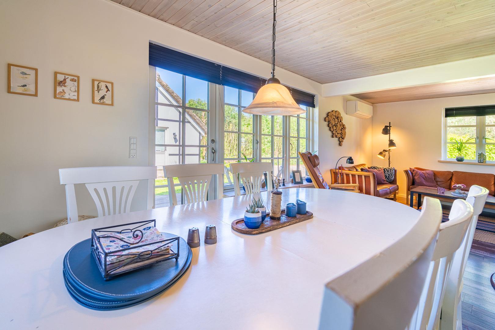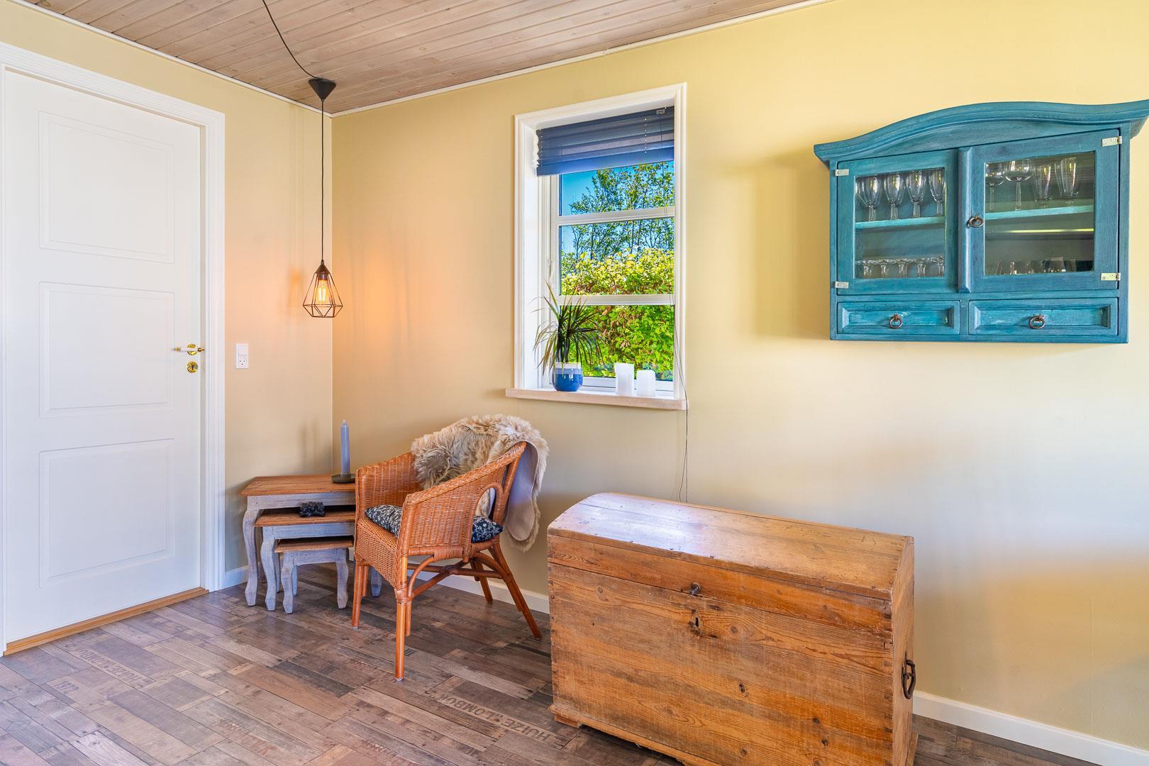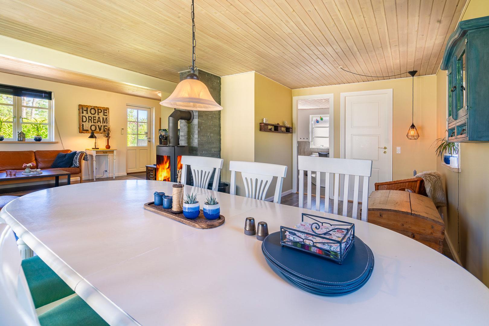 Sommerhuset er løbende renoveret og kombinerer klassisk dansk hygge med moderne komfort. De store vinduer i stuen og spiseområdet lukker masser af lys ind, mens brændeovnen spreder varme og stemning. En energivenlig varmepumpe sørger for et behageligt indeklima – både bæredygtigt og økonomisk.