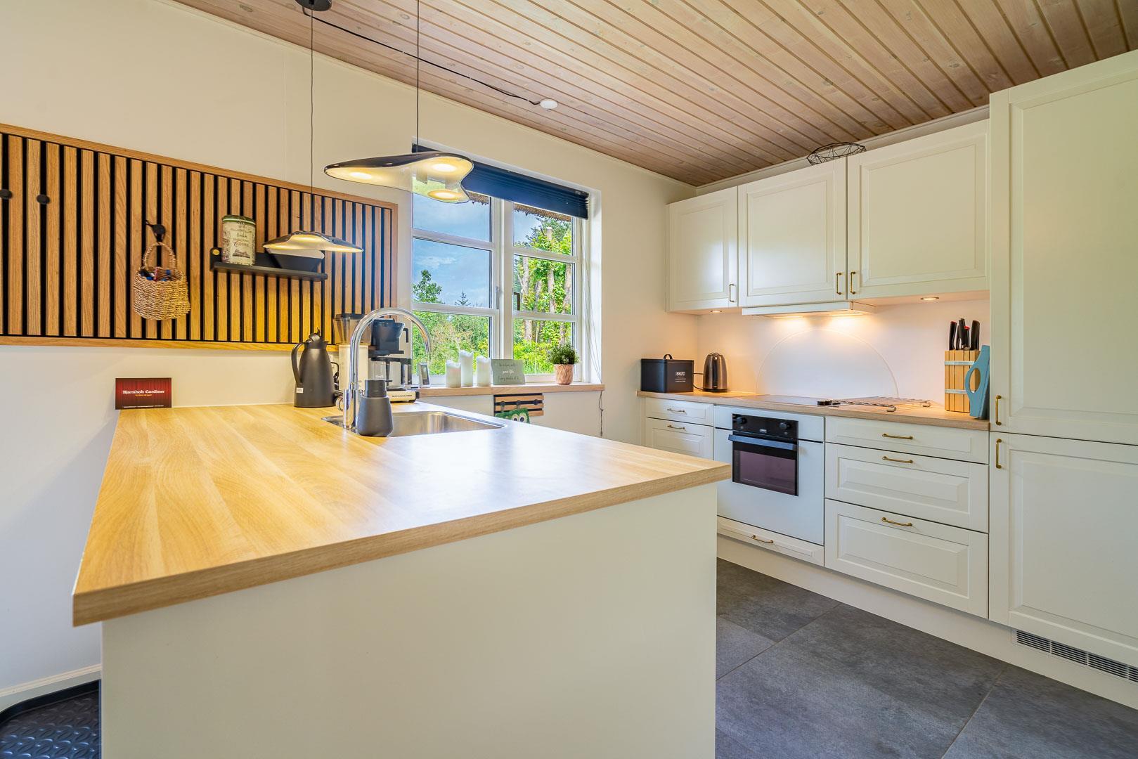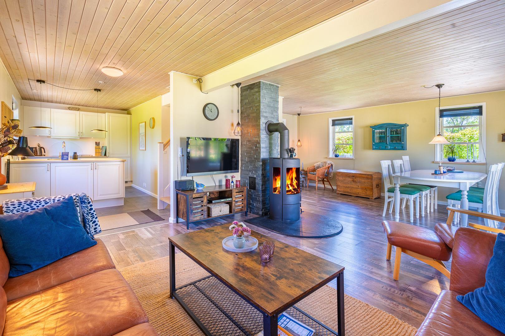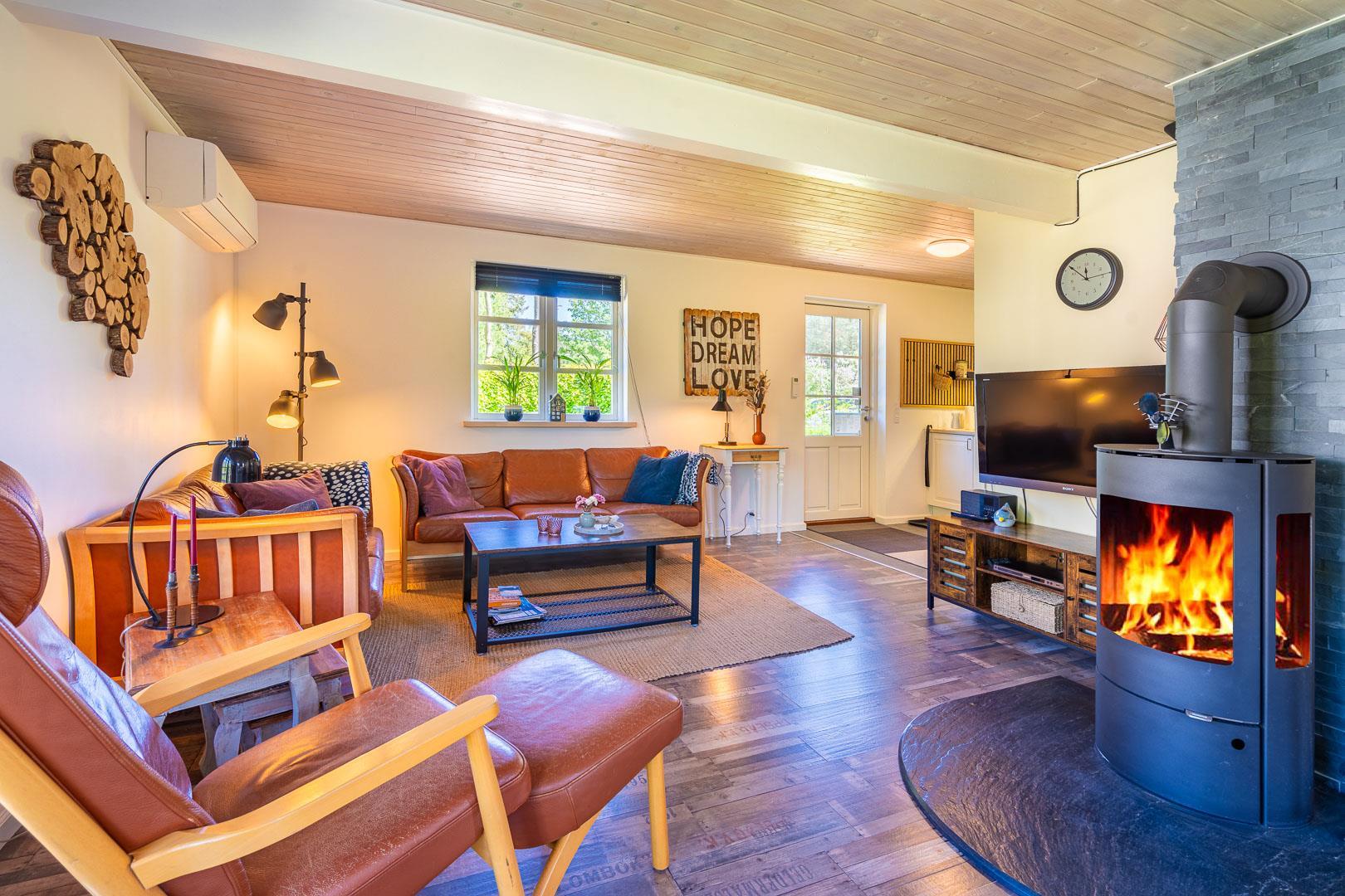 Sommerhuset er løbende renoveret og kombinerer klassisk dansk hygge med moderne komfort. De store vinduer i stuen og spiseområdet lukker masser af lys ind, mens brændeovnen spreder varme og stemning. En energivenlig varmepumpe sørger for et behageligt indeklima – både bæredygtigt og økonomisk.