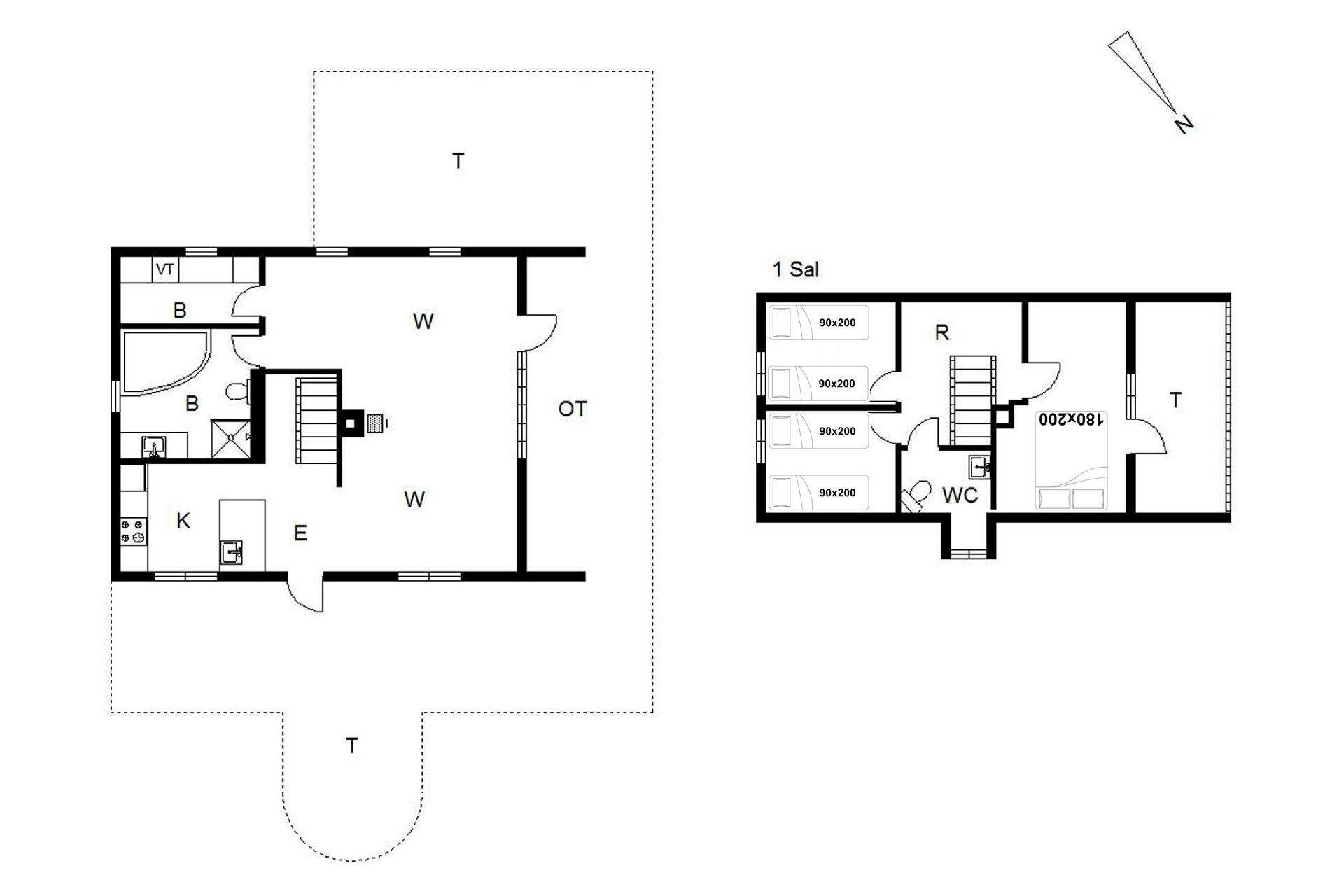 Sengestørrelse: 1 dobbeltseng med 2 madrasser à 90 x 200 cm + 4 enkeltsenge à 90 x 200 cm