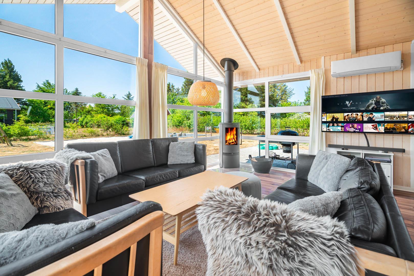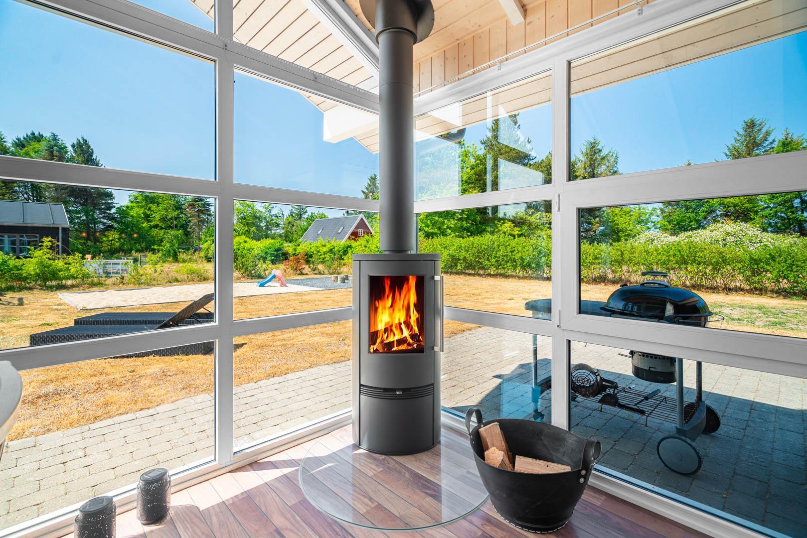 Husets naturlige samlingspunkt er det åbne opholds- og spiseområde. Her kan I samles om måltiderne, spille spil ved spisebordet eller nyde rolige aftener foran brændeovnen. De store vinduespartier lukker masser af dagslys ind og skaber en behagelig overgang mellem inde og ude.