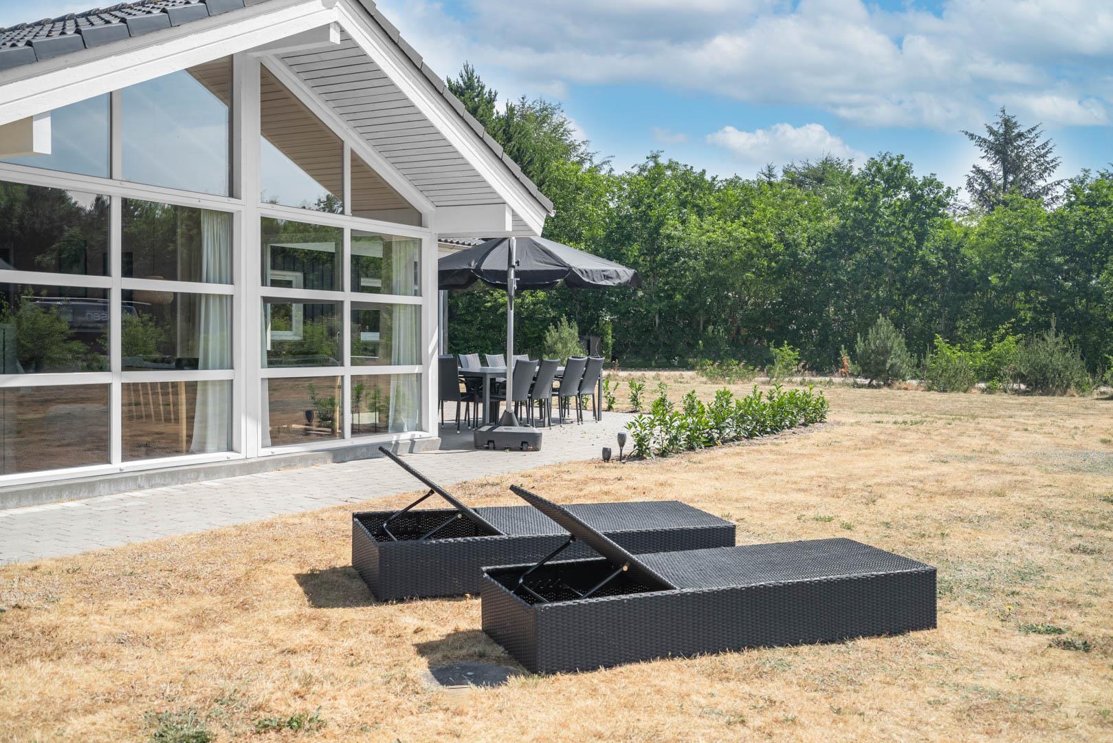 Udendørs venter en fredelig grund, hvor hele familien kan nyde ferien i rolige omgivelser. Den store, overdækkede terrasse danner rammen om både morgenkaffe i den friske luft og lange sommeraftener med grill og hyggeligt samvær – uanset vejret.