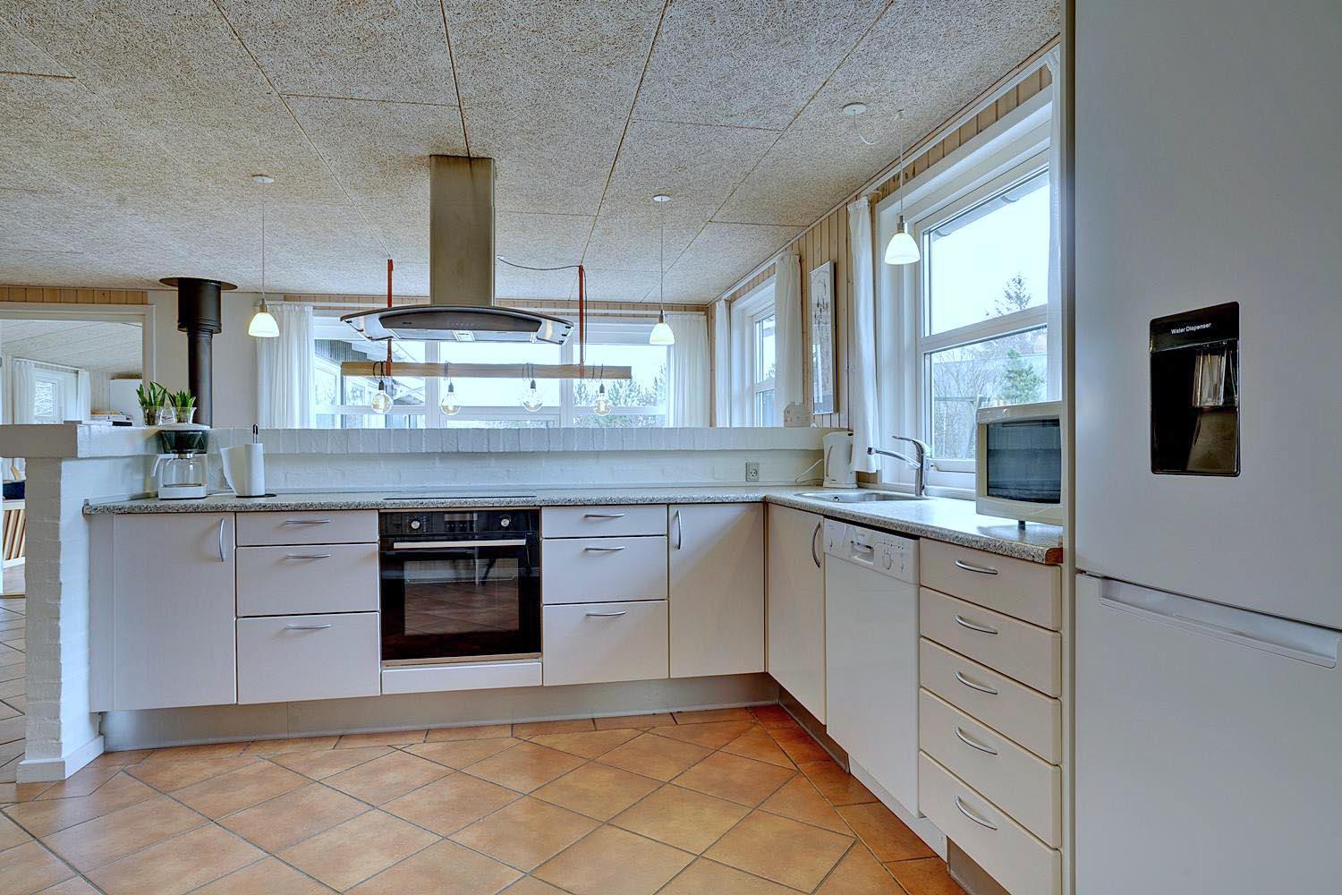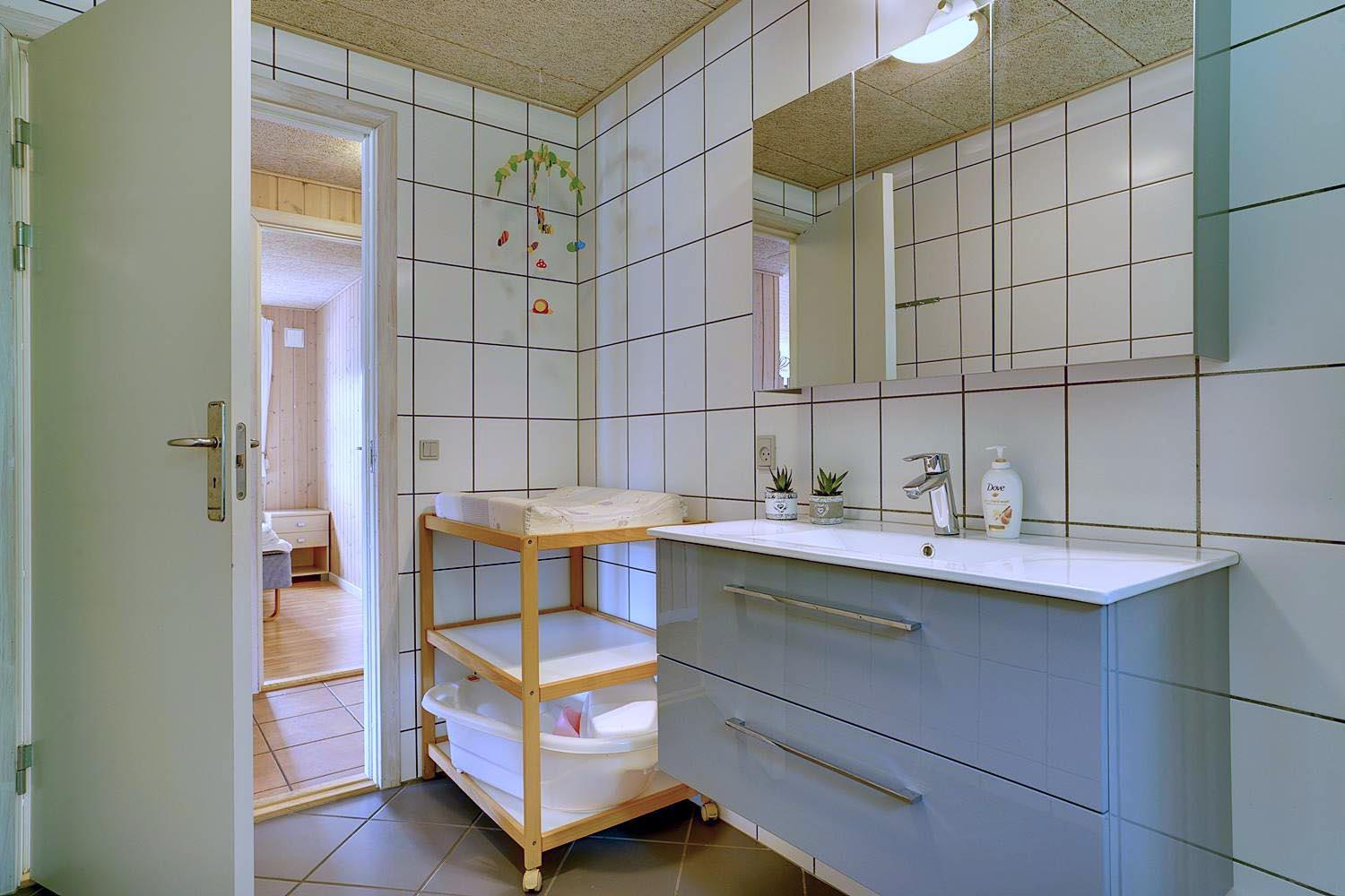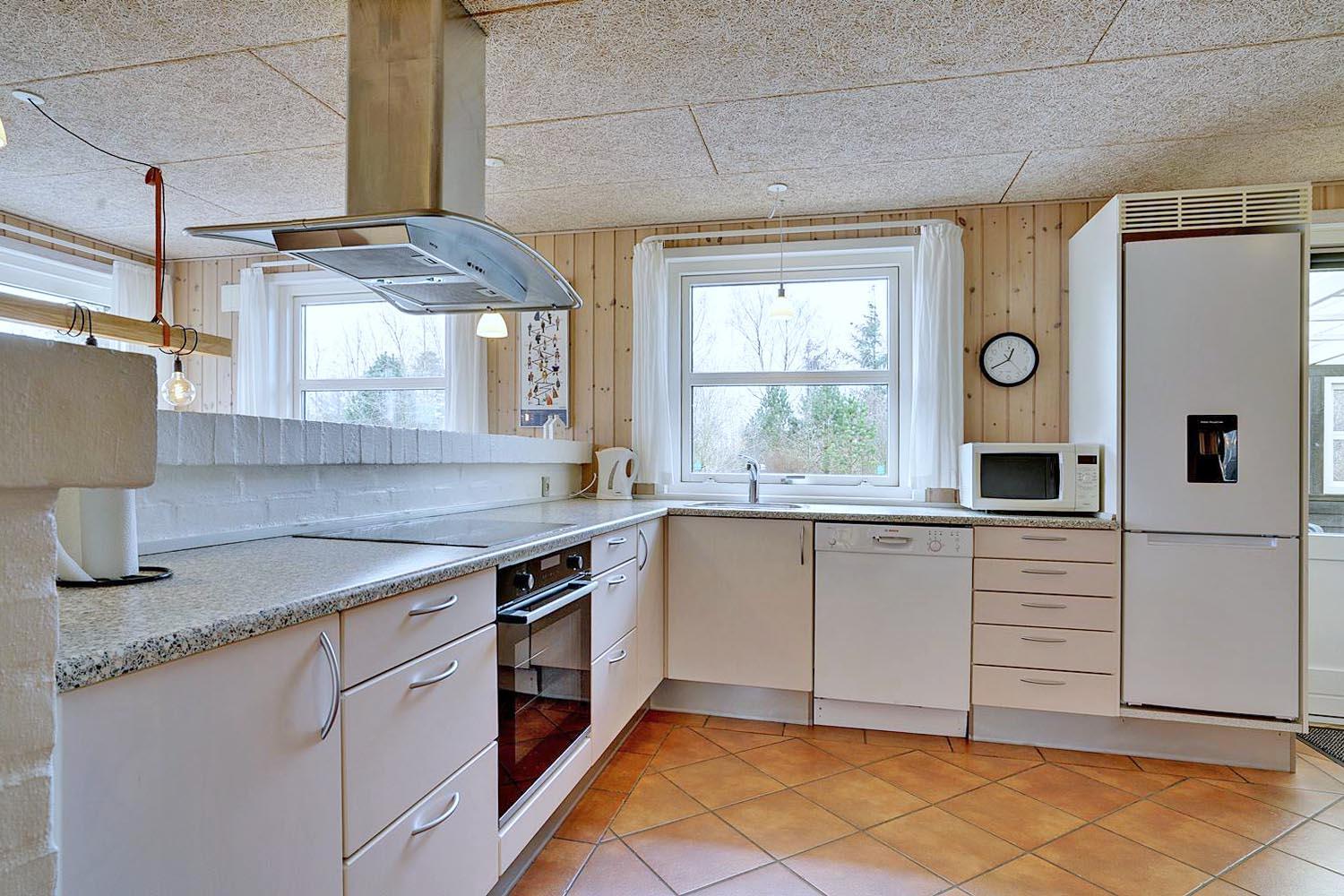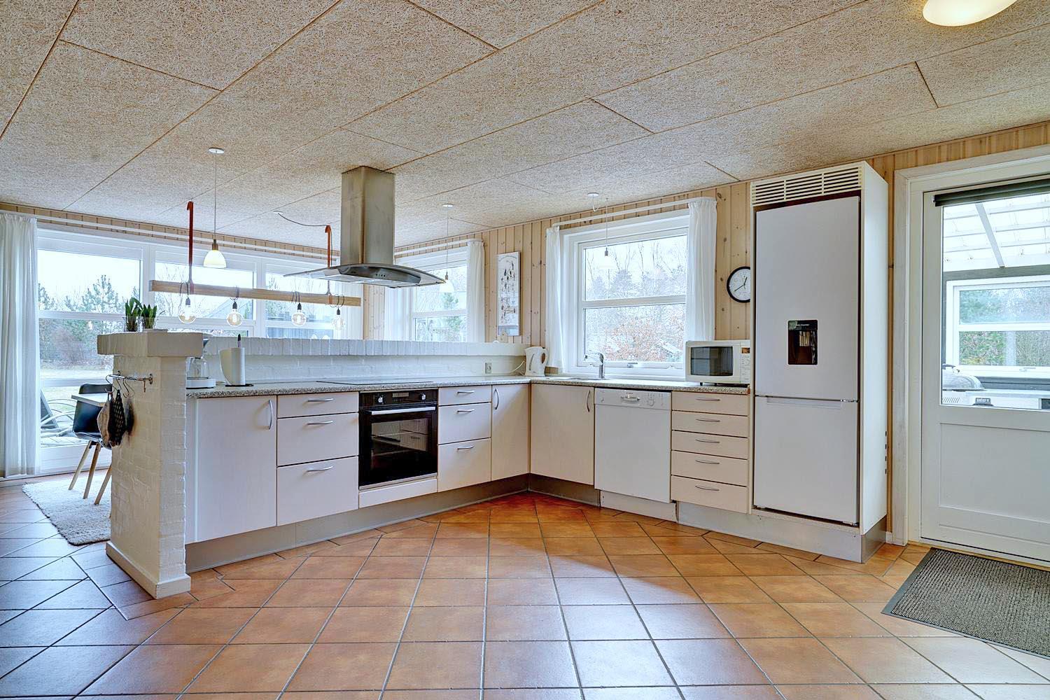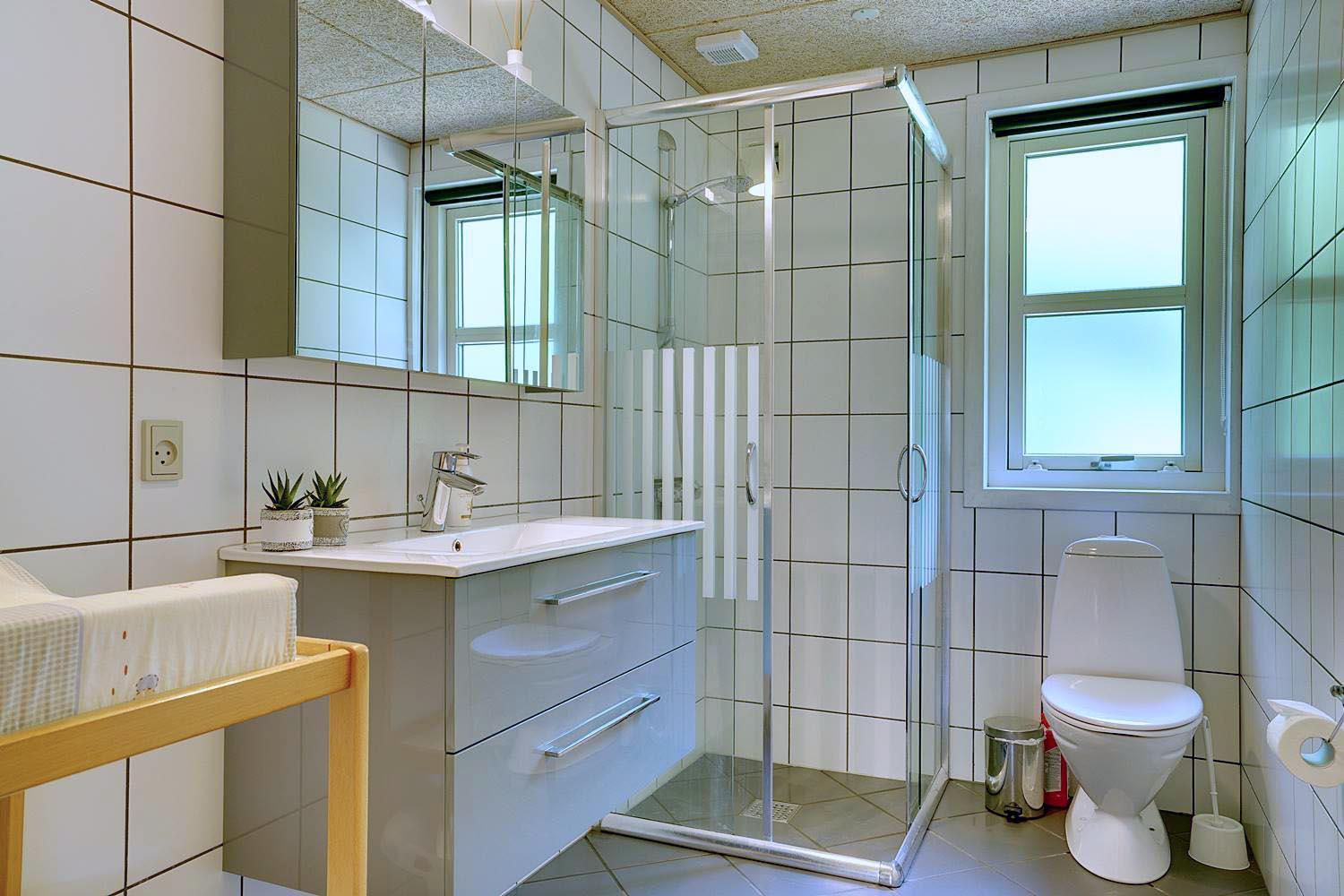 Køkkenet er moderne og veludstyret med opvaskemaskine og god arbejdsplads – ideelt til fælles madlavning. Også her er der gulvvarme, så komforten er i top.