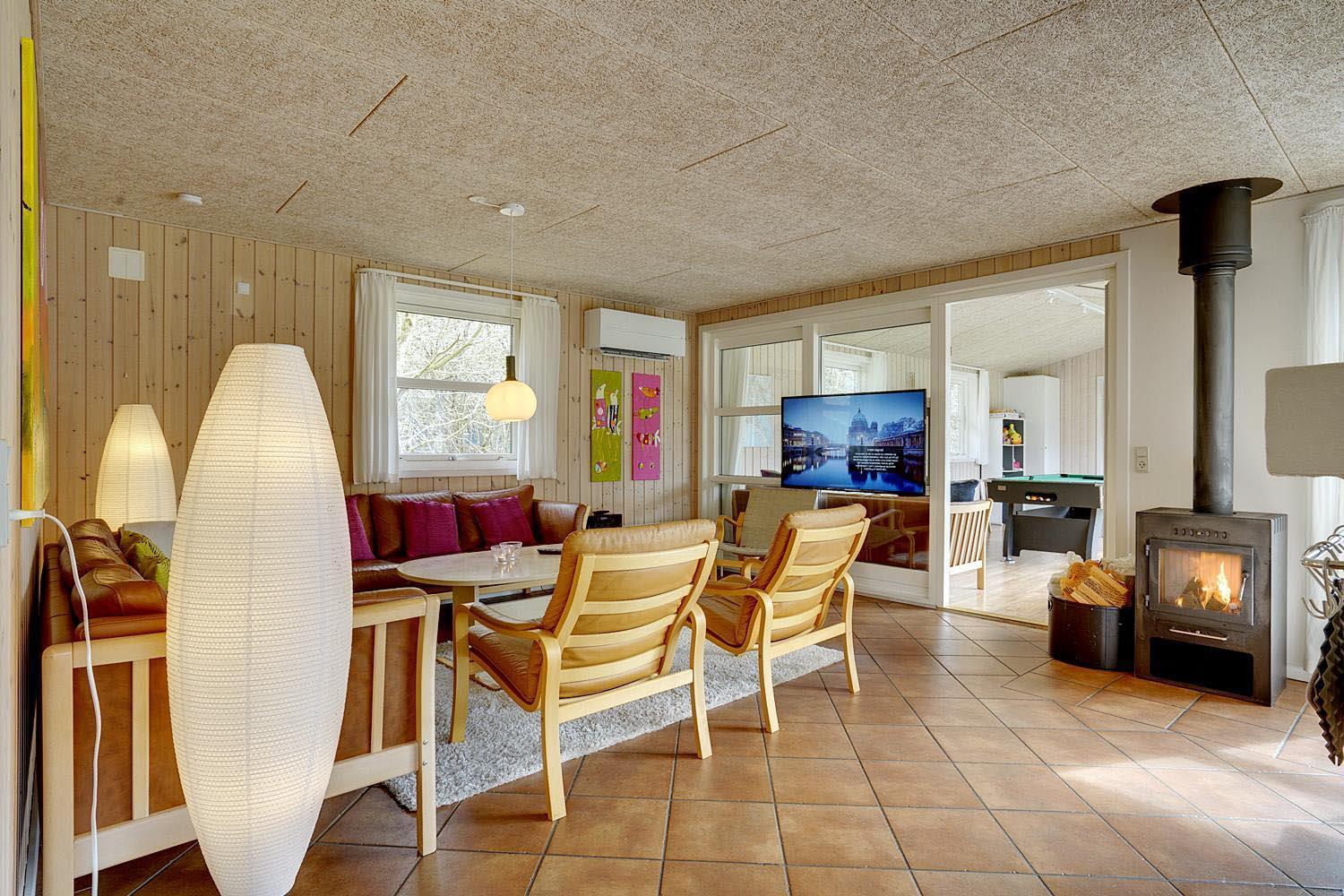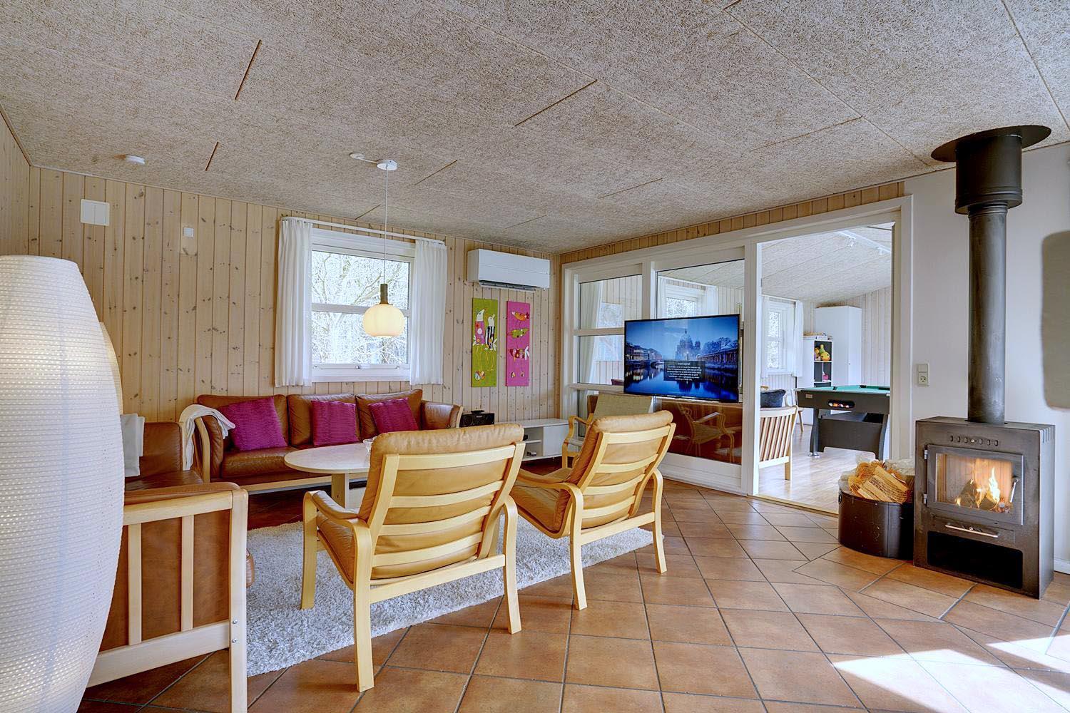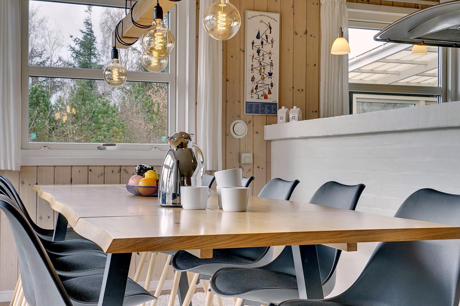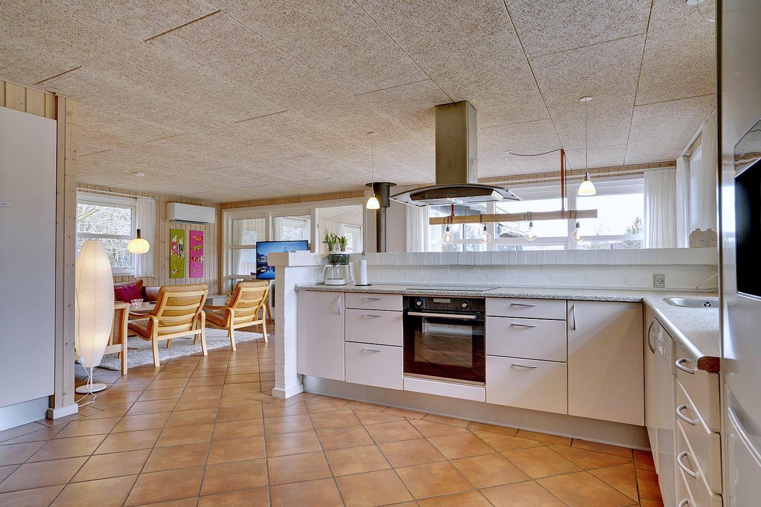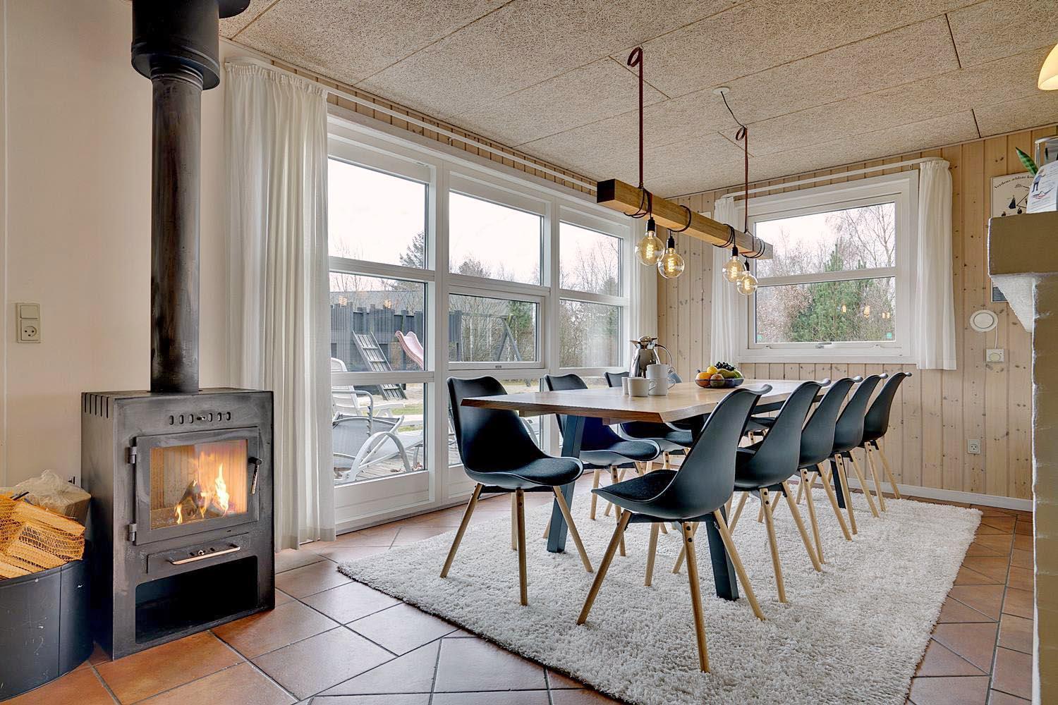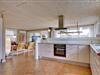 Husets naturlige samlingspunkt er det store, åbne opholds- og spiseområde med integreret køkken. De store vinduespartier lukker lyset ind og skaber en lys og indbydende atmosfære. Brændeovnen spreder hygge på kølige aftener, og gulvvarmen i opholdsrummet sikrer en behagelig temperatur året rundt.