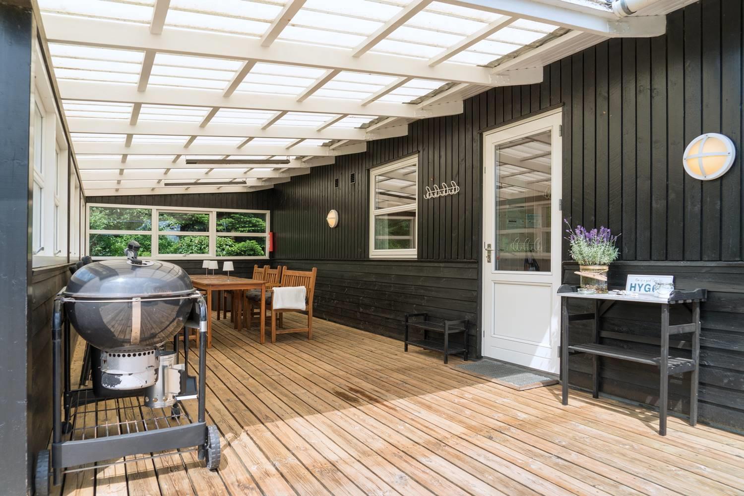 Den overdækkede terrasse giver mulighed for at nyde udelivet i al slags vejr – hvad enten I vil grille, spise sammen eller bare slappe af med udsigt til haven.