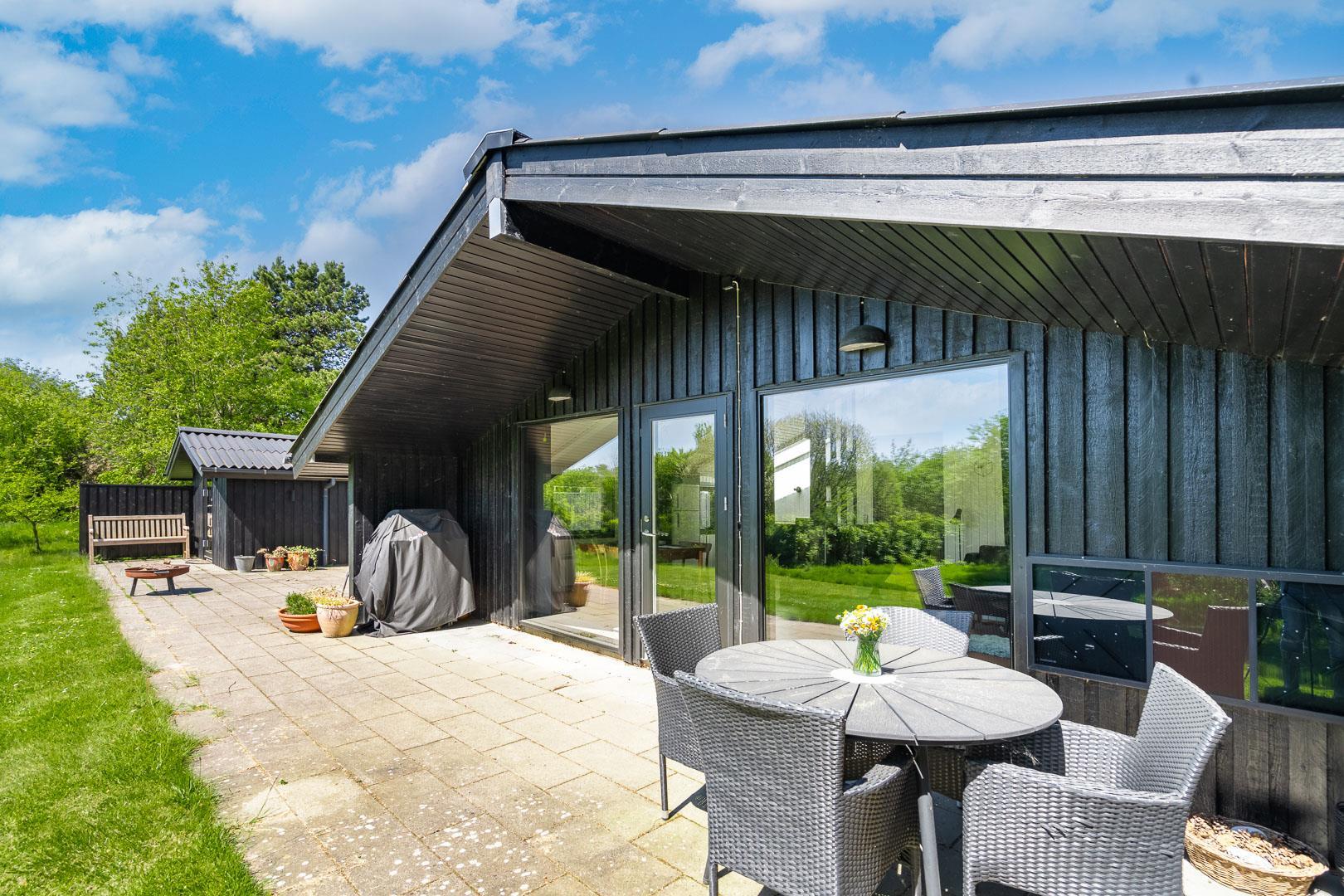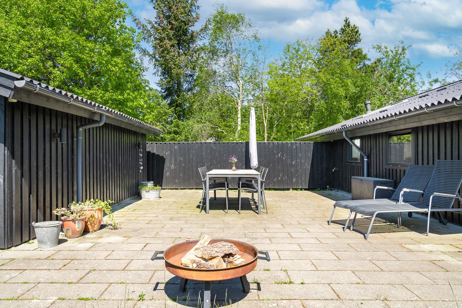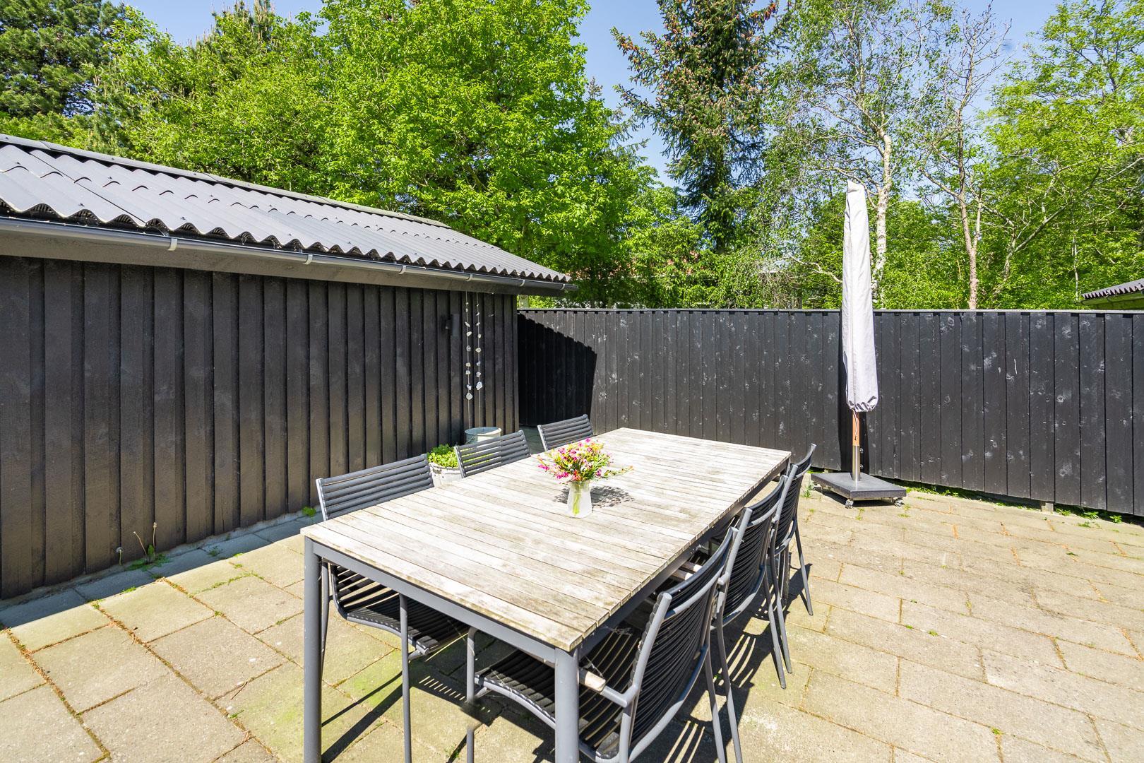 Den overdækkede terrasse indbyder til hyggelige stunder – uanset om det er morgenkaffen i solen eller aftensmaden i ly for vinden. Terrassen bliver hurtigt et naturligt samlingspunkt under ferien.