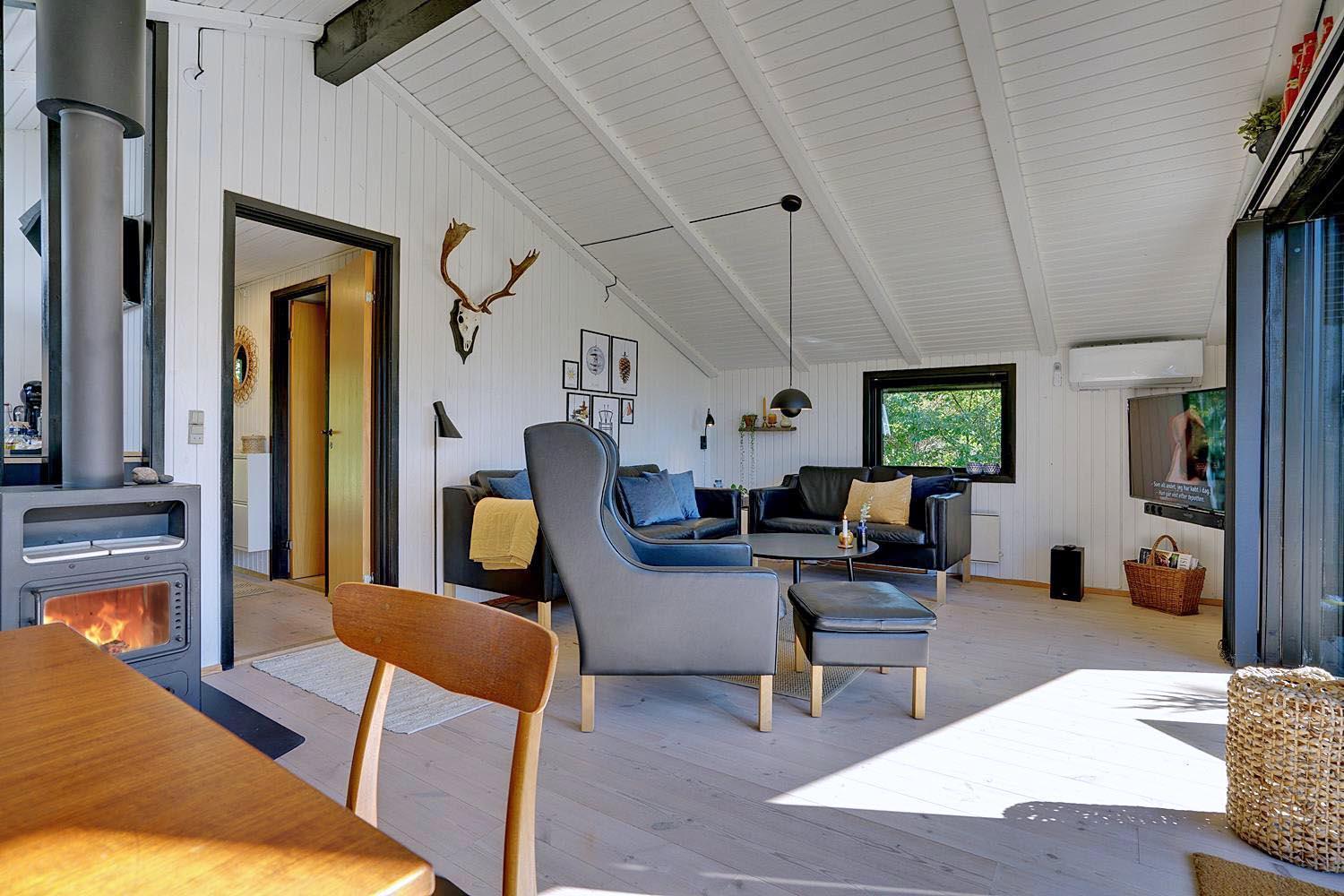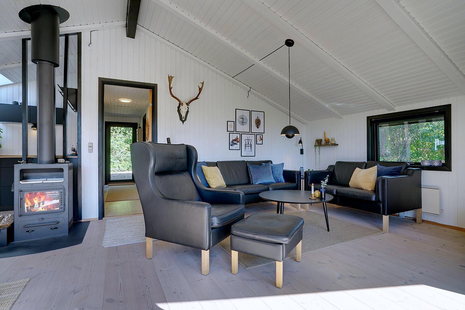 I den åbne stue kan I samle jer omkring brændeovnen og nyde den varme, knitrende ild. Den moderne varmepumpe sikrer et behageligt indeklima året rundt.