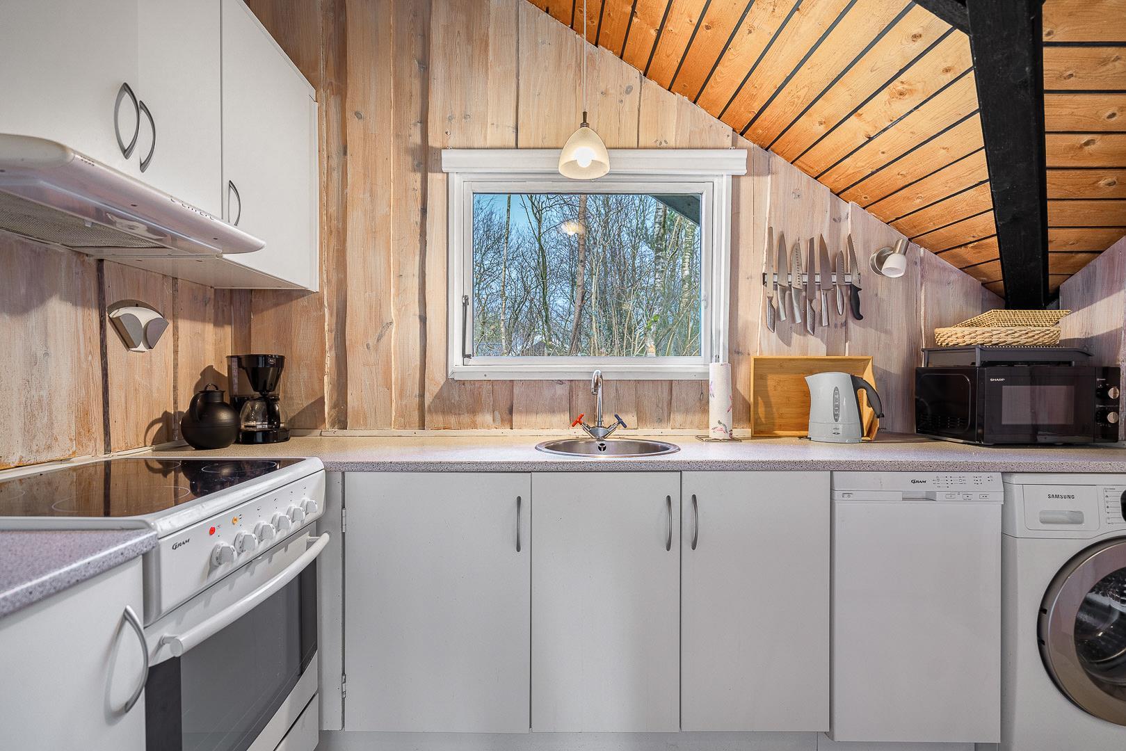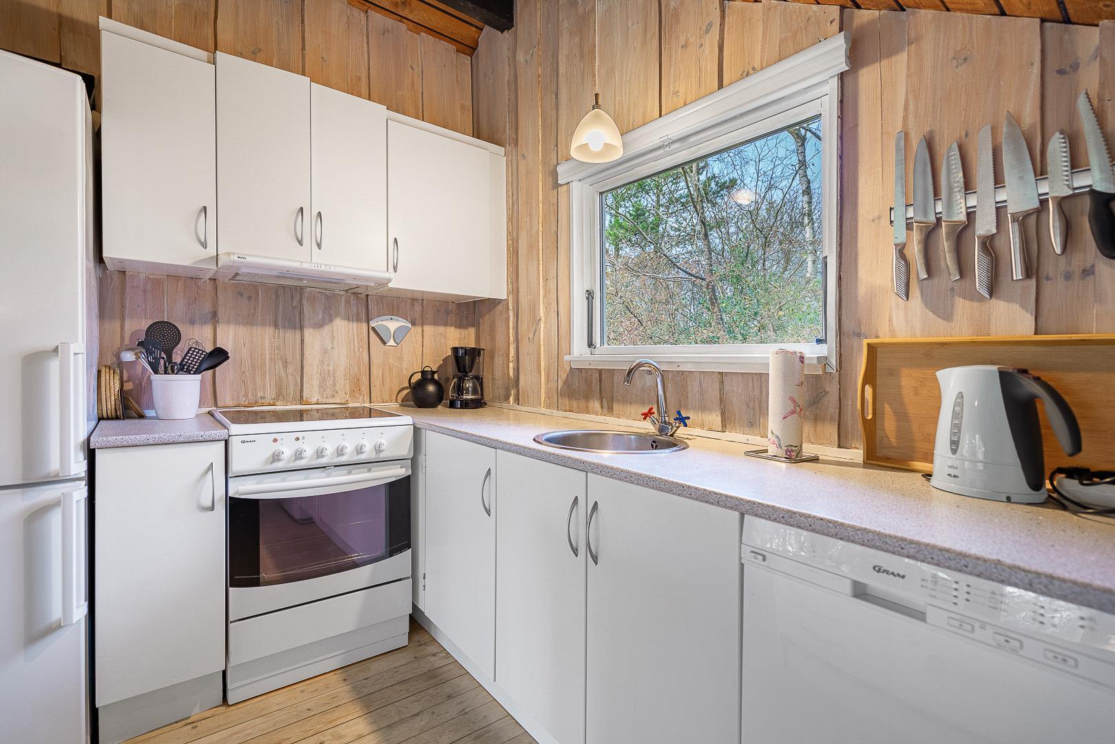 Den moderne varmepumpe sørger for et behageligt indeklima året rundt – svalende om sommeren og lunende på kølige dage. Køkkenet er udstyret med opvaskemaskine og alt, hvad I behøver for at lave gode feriemåltider. Derudover gør vaskemaskinen det nemt at pakke let – også til længere ophold.