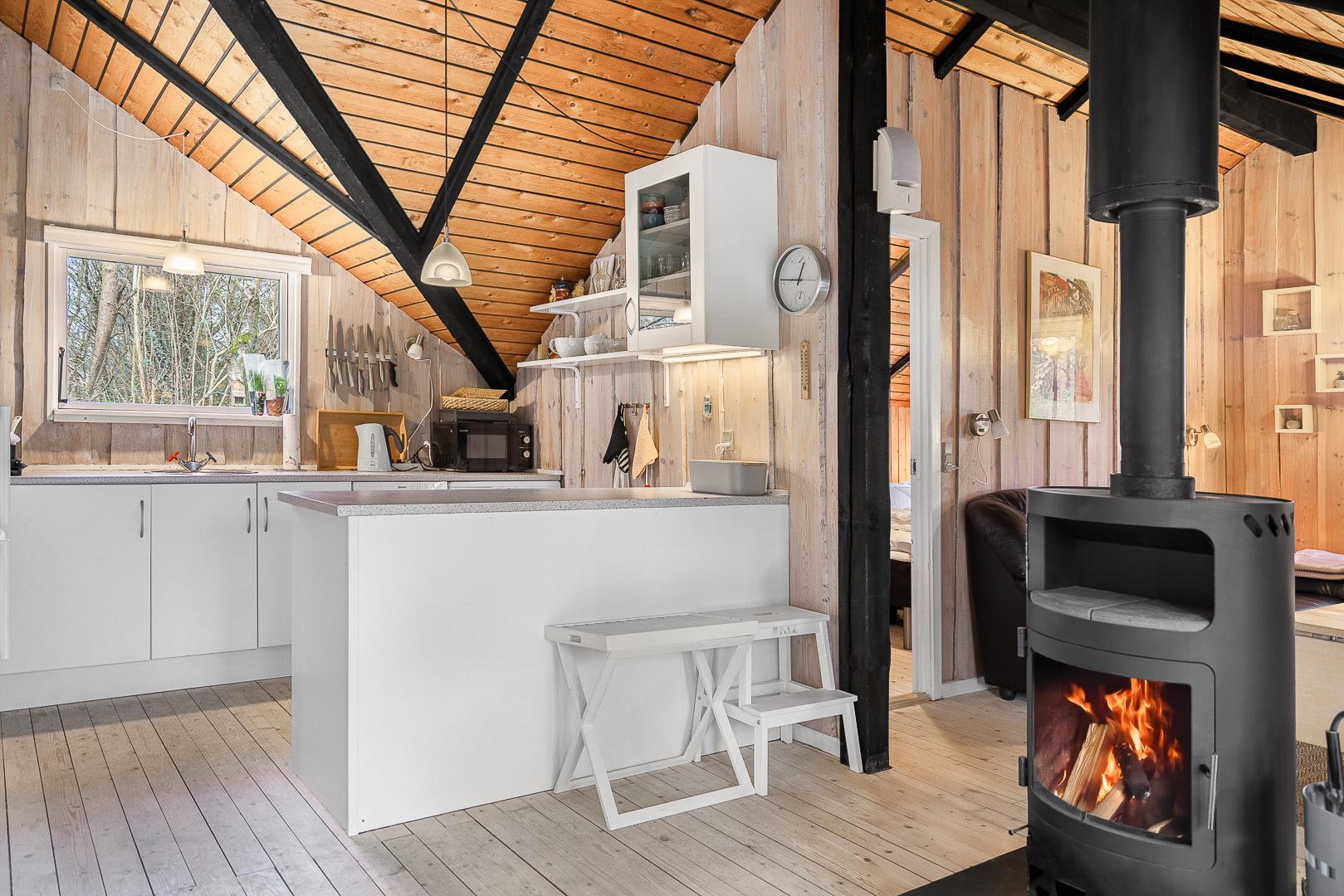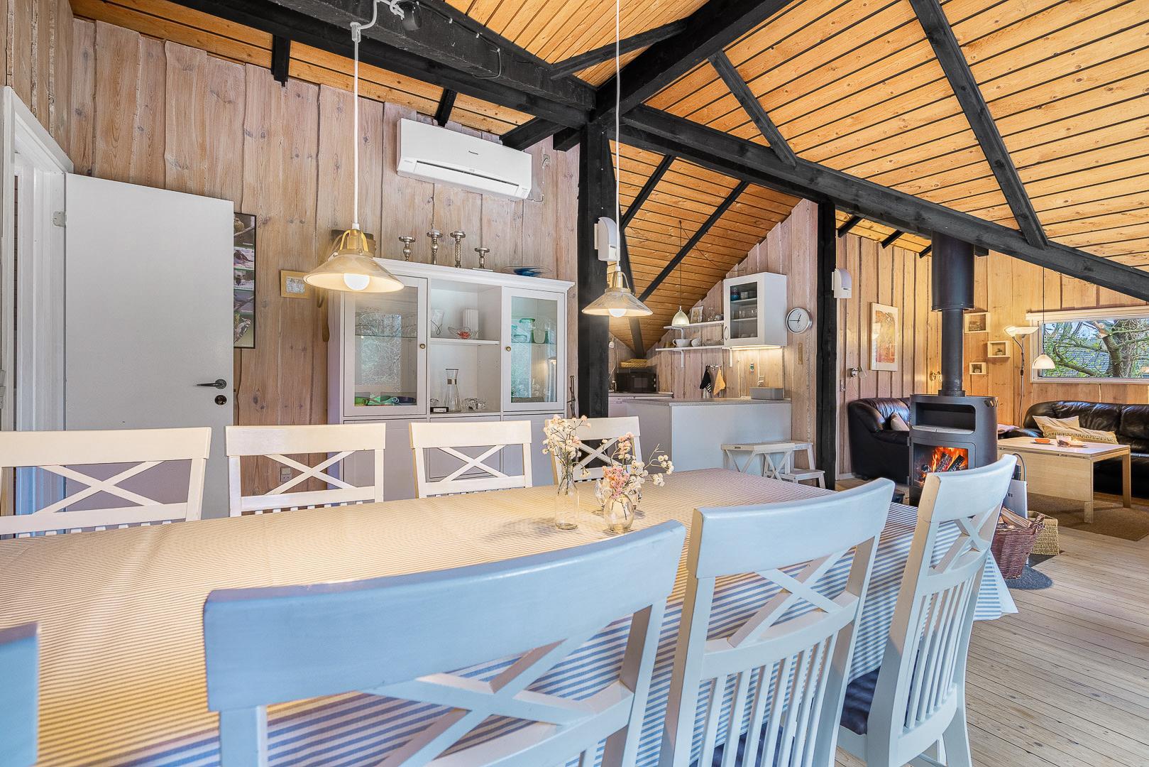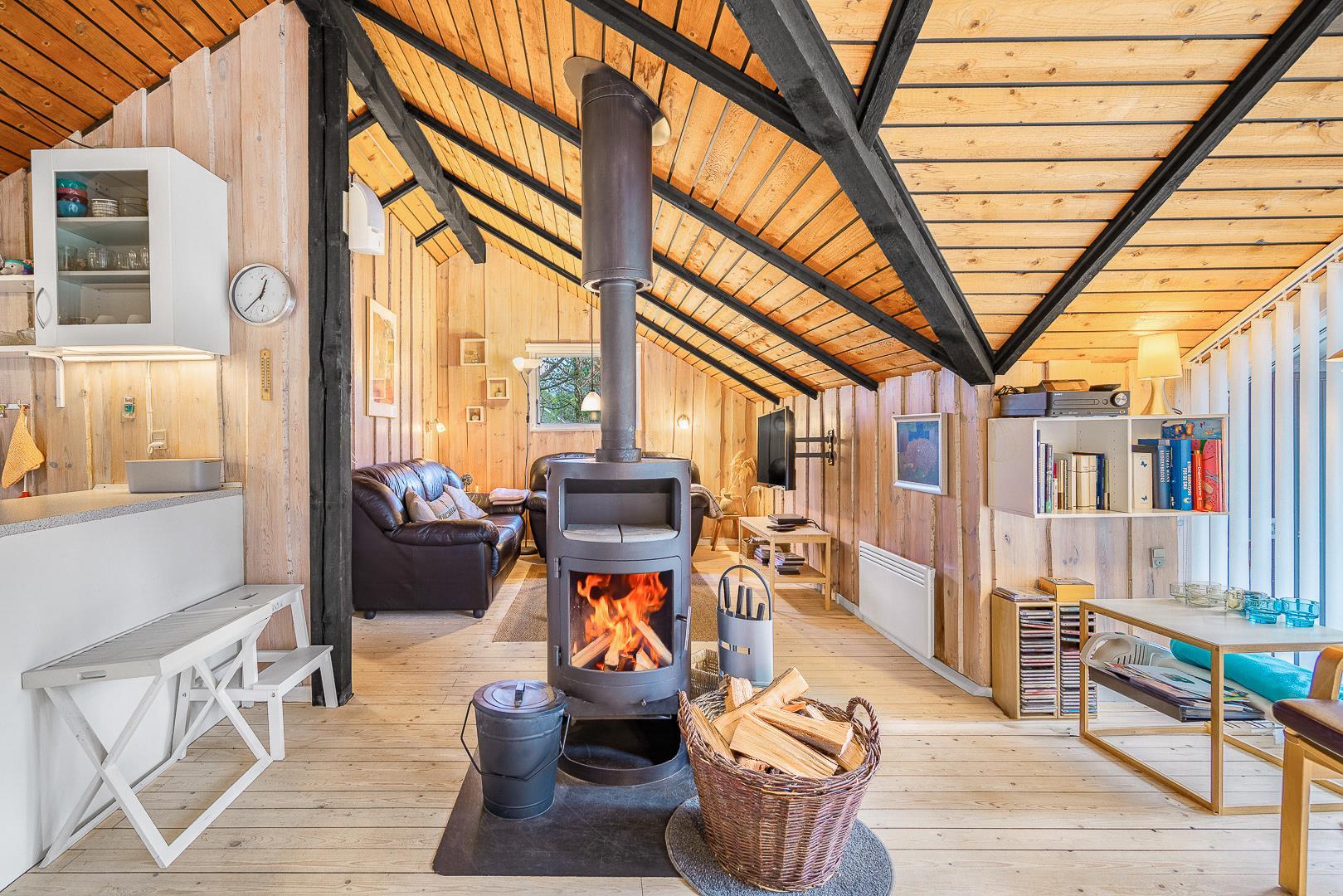 Husets hjerte er den lyse stue med brændeovn, hvor I kan samles efter en dag ved stranden eller i skoven. Den åbne planløsning skaber en rar og sammenhængende atmosfære, hvor køkken og opholdsrum smelter naturligt sammen – perfekt til hyggelige stunder og fælles måltider.