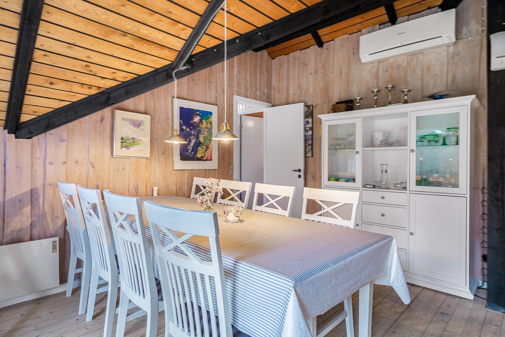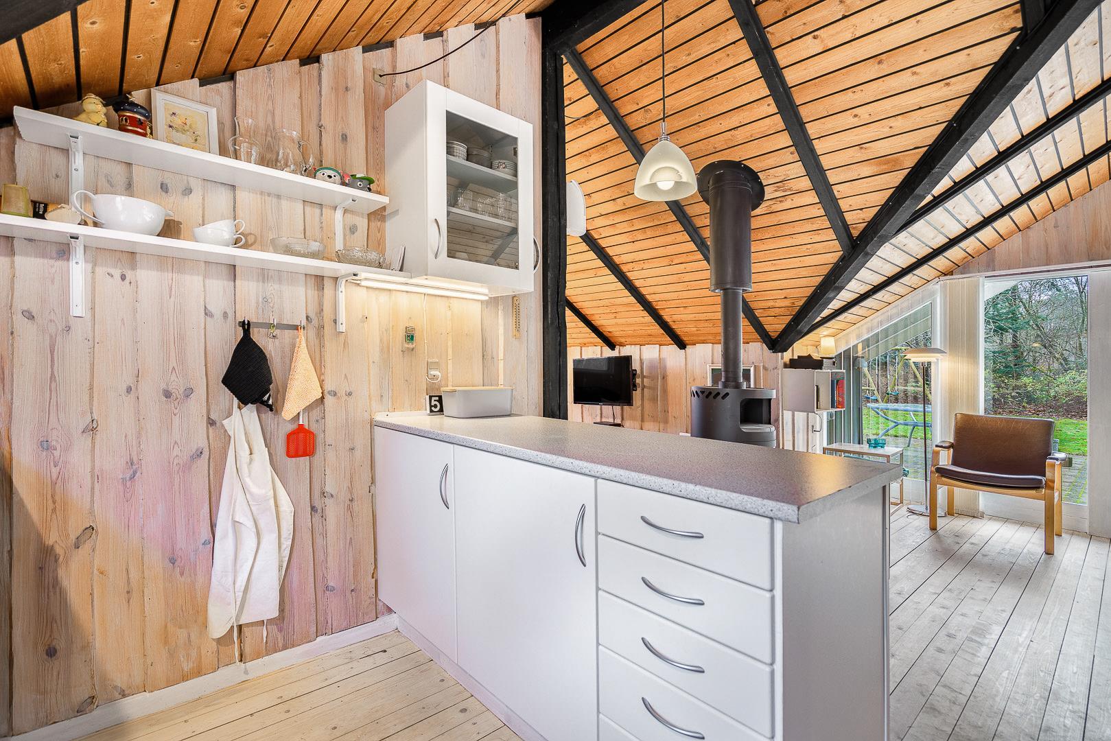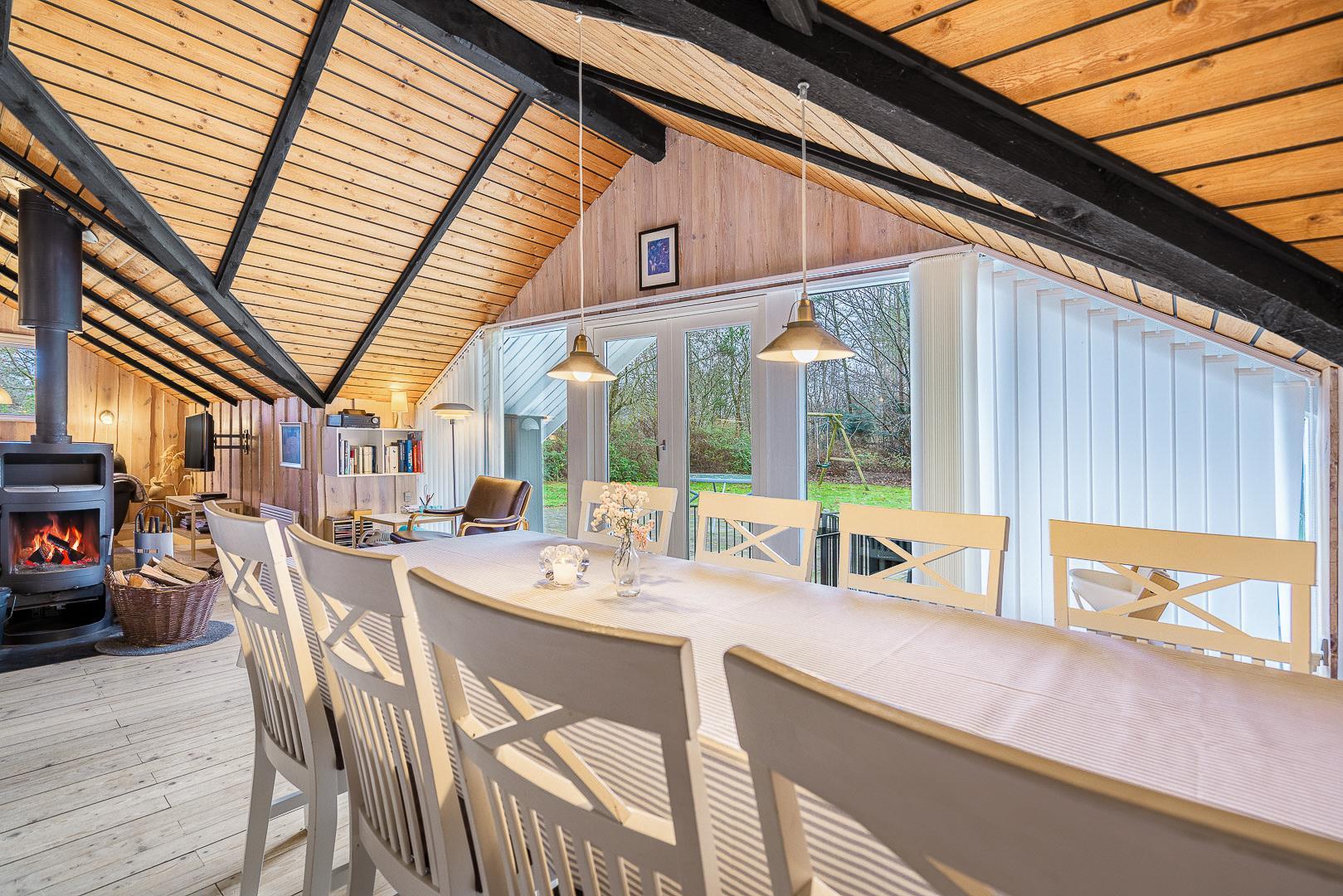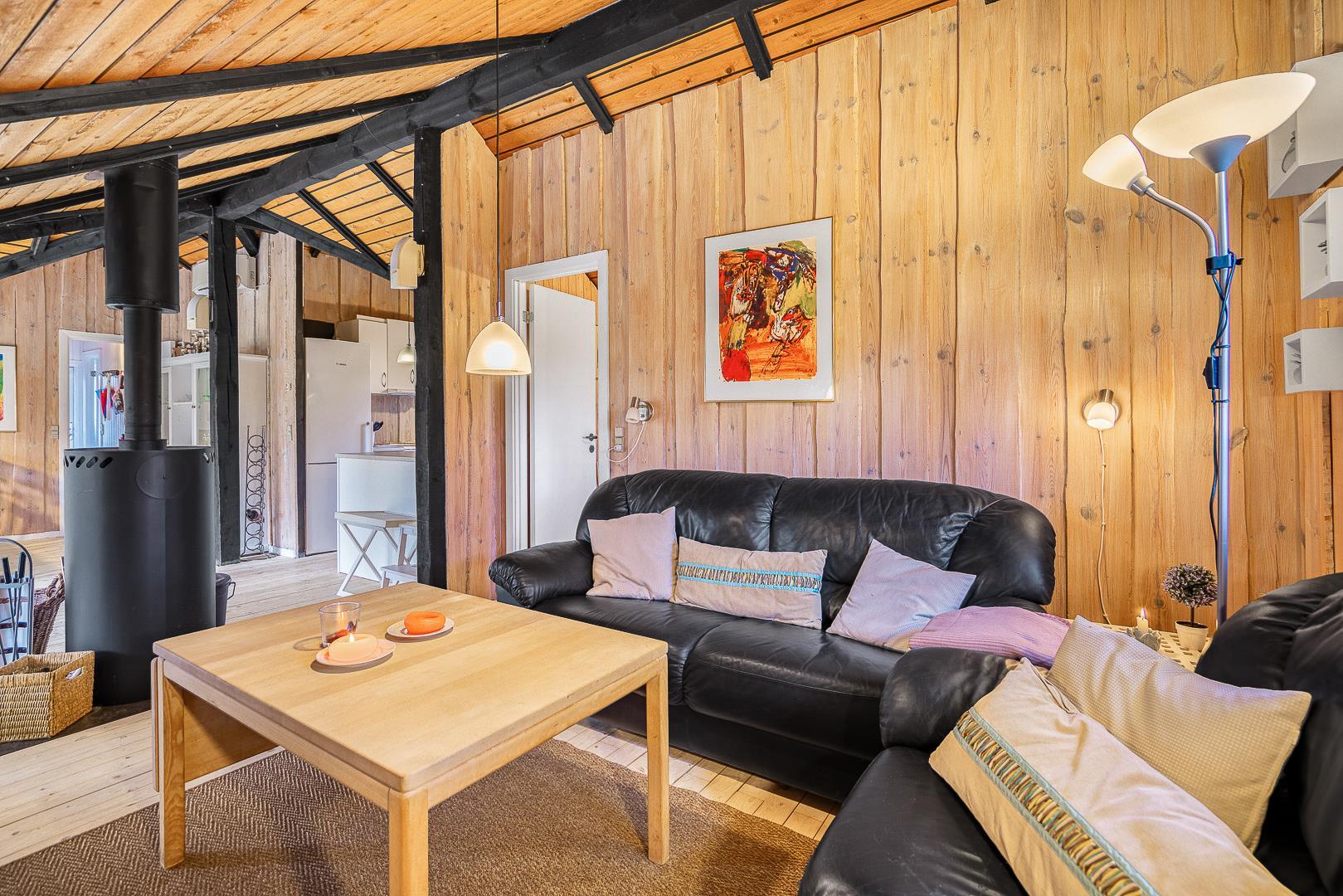 Husets hjerte er den lyse stue med brændeovn, hvor I kan samles efter en dag ved stranden eller i skoven. Den åbne planløsning skaber en rar og sammenhængende atmosfære, hvor køkken og opholdsrum smelter naturligt sammen – perfekt til hyggelige stunder og fælles måltider.