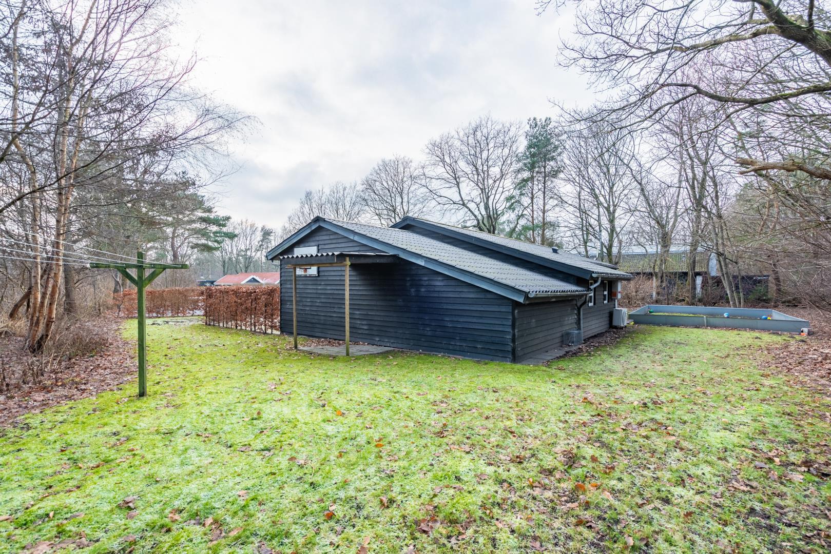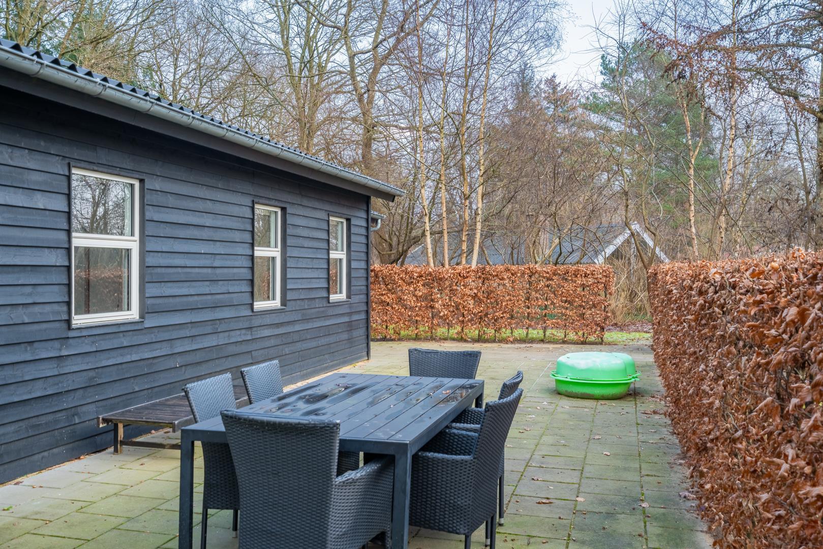Udendørs kan du nyde ferien på den overdækkede terrasse, hvor der er mulighed for at slappe af i al slags vejr. For familiens yngste byder haven på både gynge og trampolin, så der er rig mulighed for leg og bevægelse, mens de voksne nyder roen.