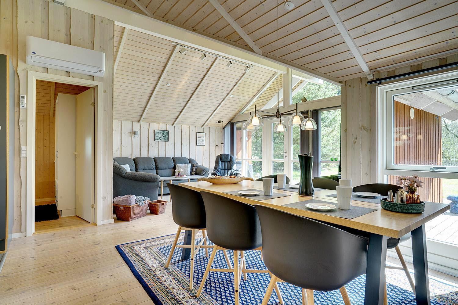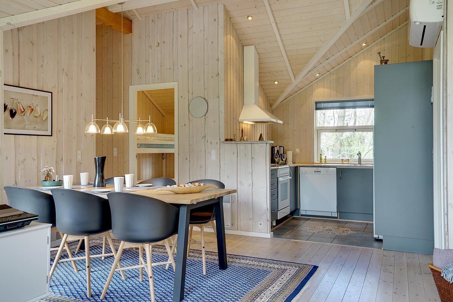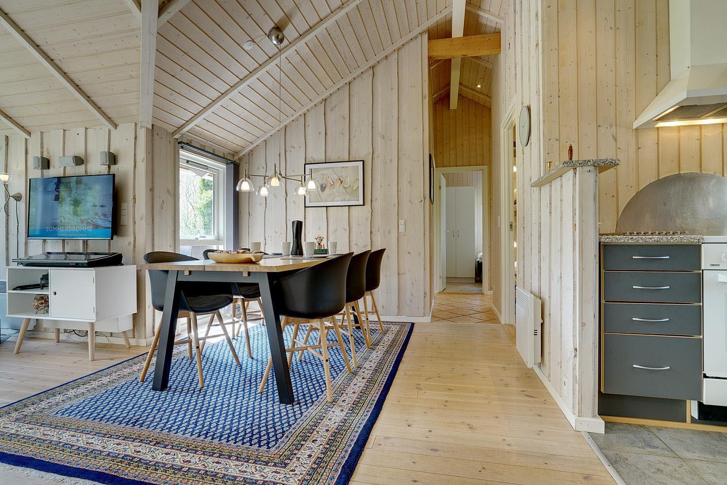 Det åbne køkken er veludstyret med opvaskemaskine, moderne køkkenredskaber og gulvvarme – så her er både funktionalitet og komfort. Ved spisebordet kan hele familien samles til hyggelige måltider eller brætspil efter en dag i naturen.
