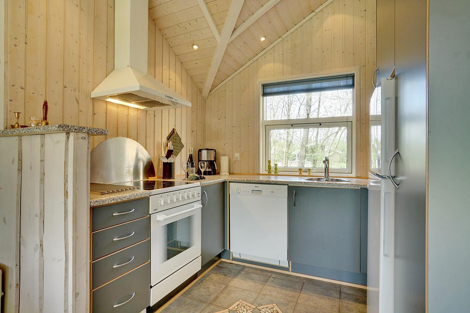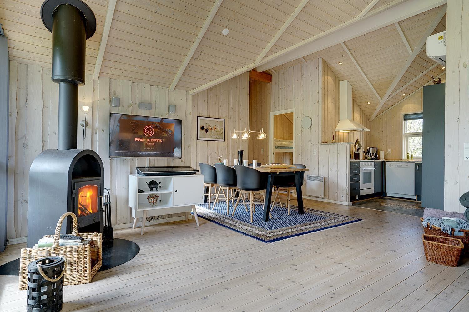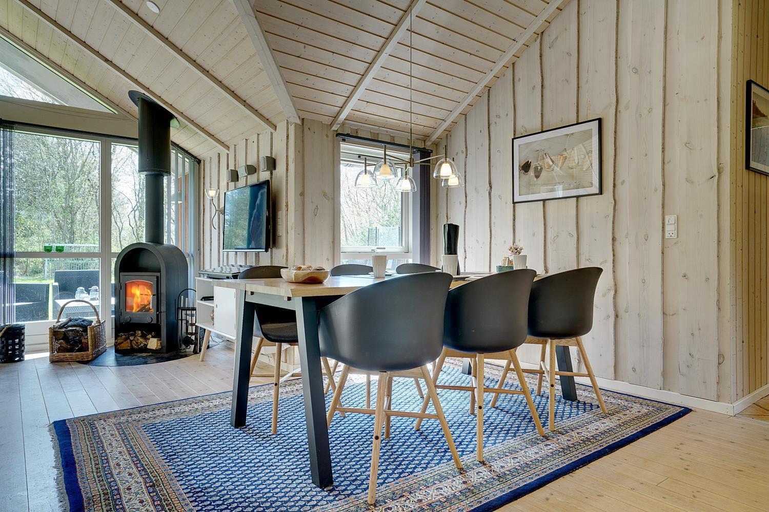 Det åbne køkken er veludstyret med opvaskemaskine, moderne køkkenredskaber og gulvvarme – så her er både funktionalitet og komfort. Ved spisebordet kan hele familien samles til hyggelige måltider eller brætspil efter en dag i naturen.